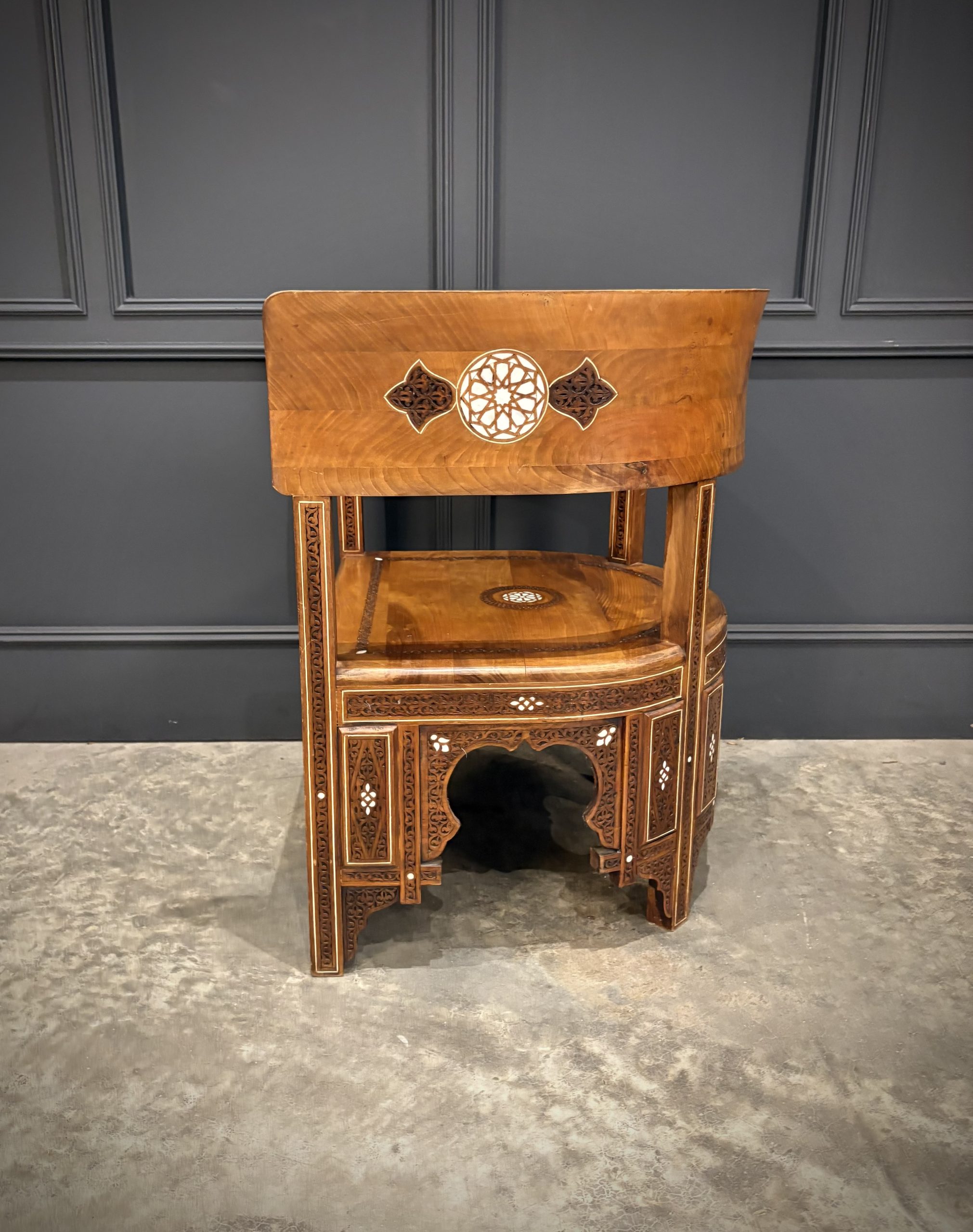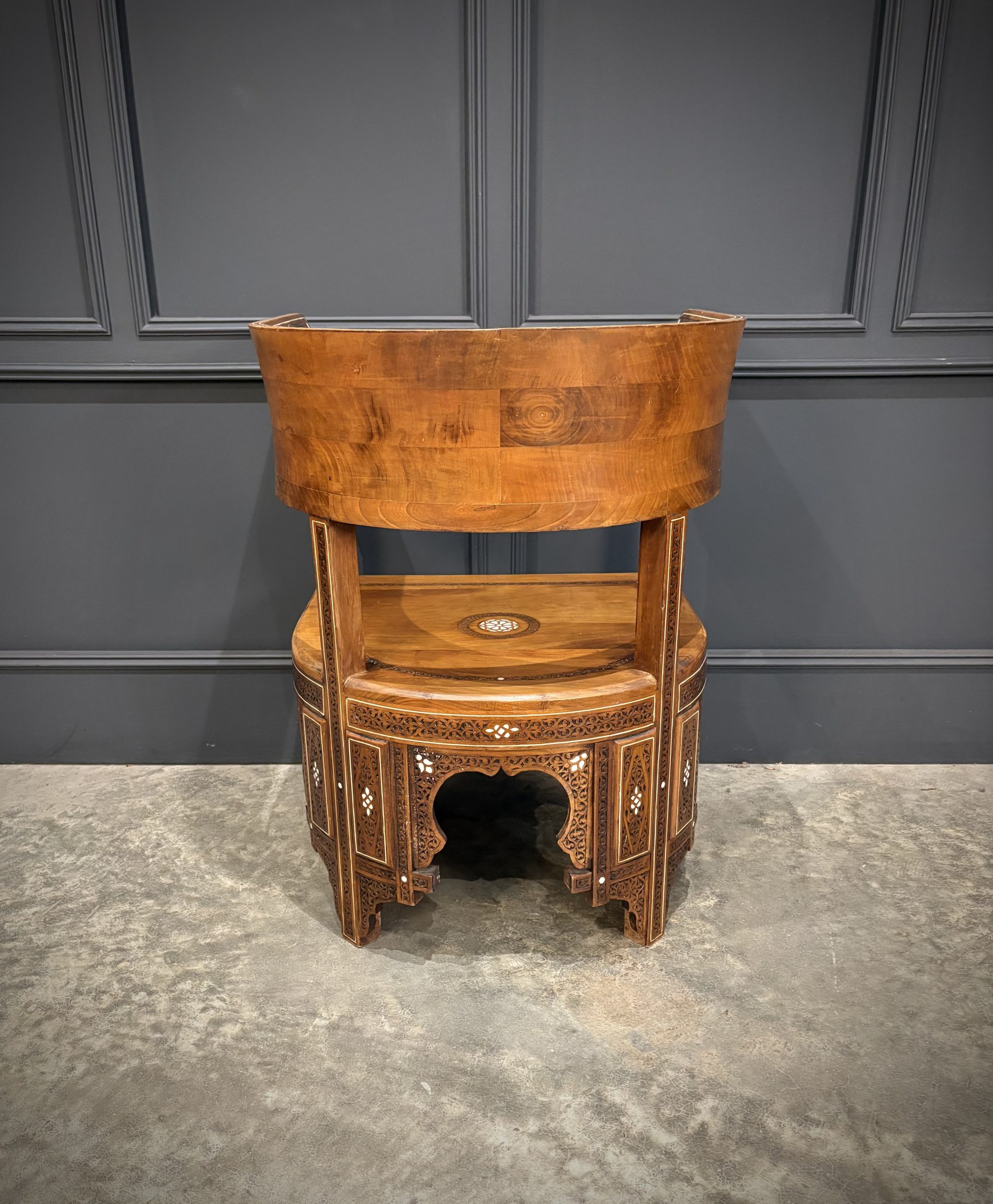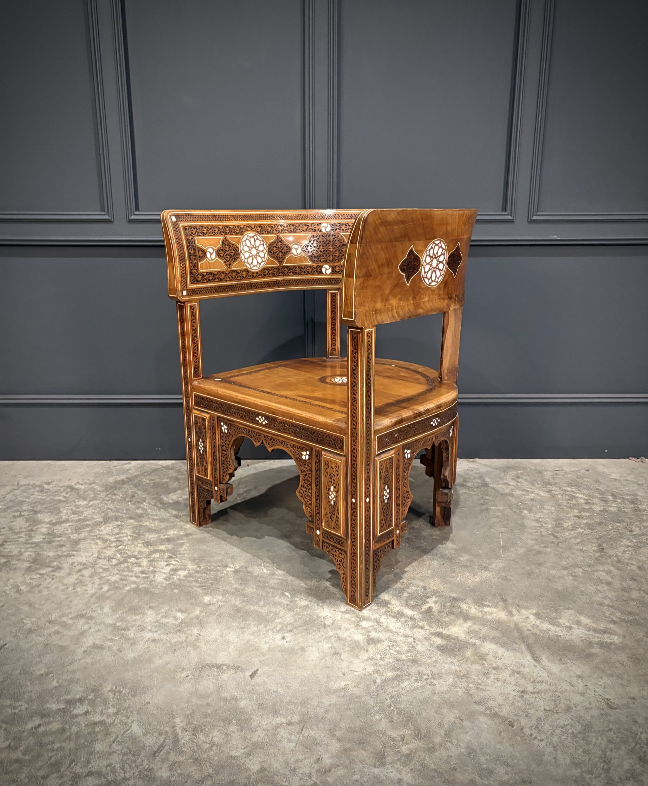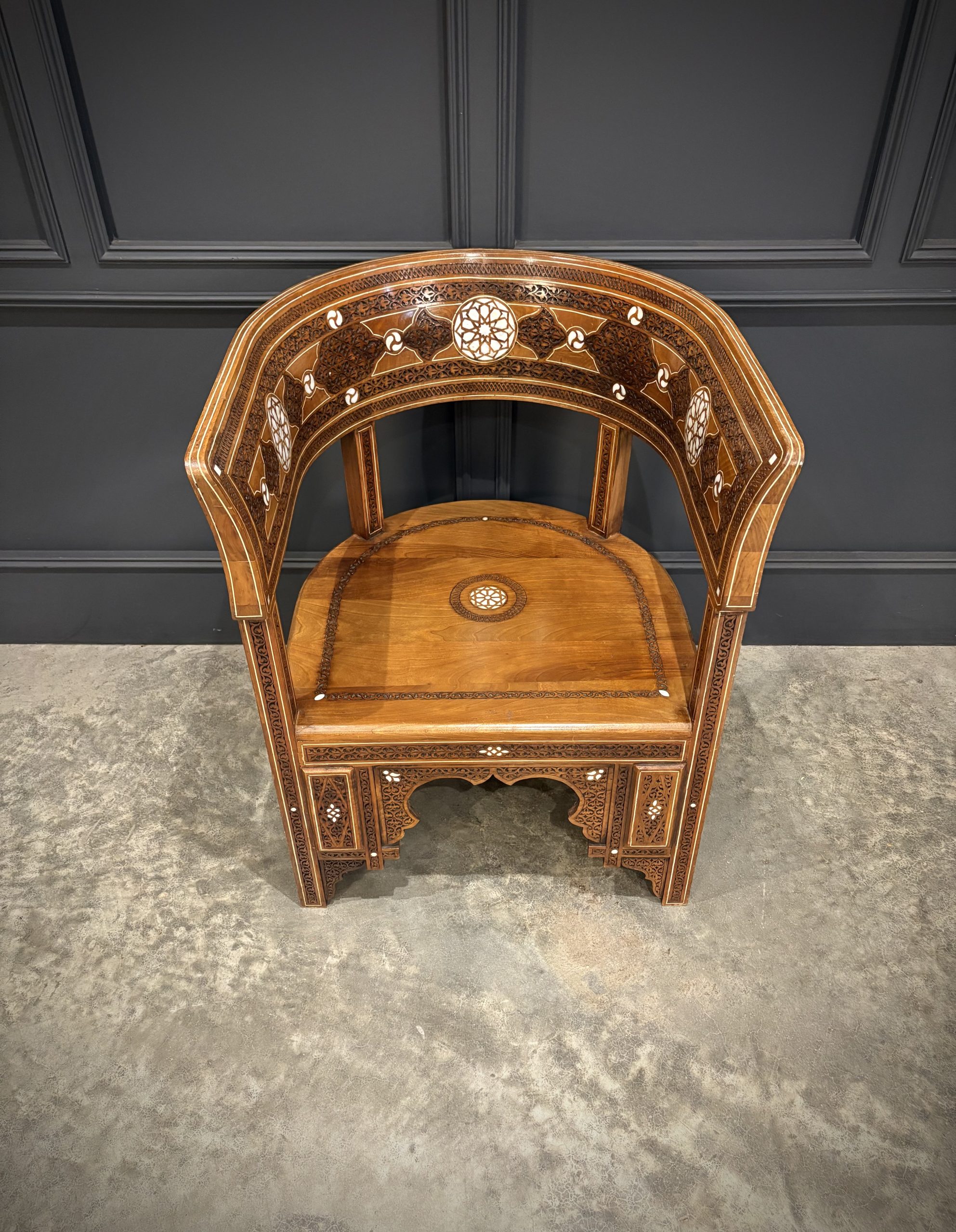 A decorative pair of Syrian walnut armchairs, each finely inlaid with mother-of-pearl geometric and floral patterns.