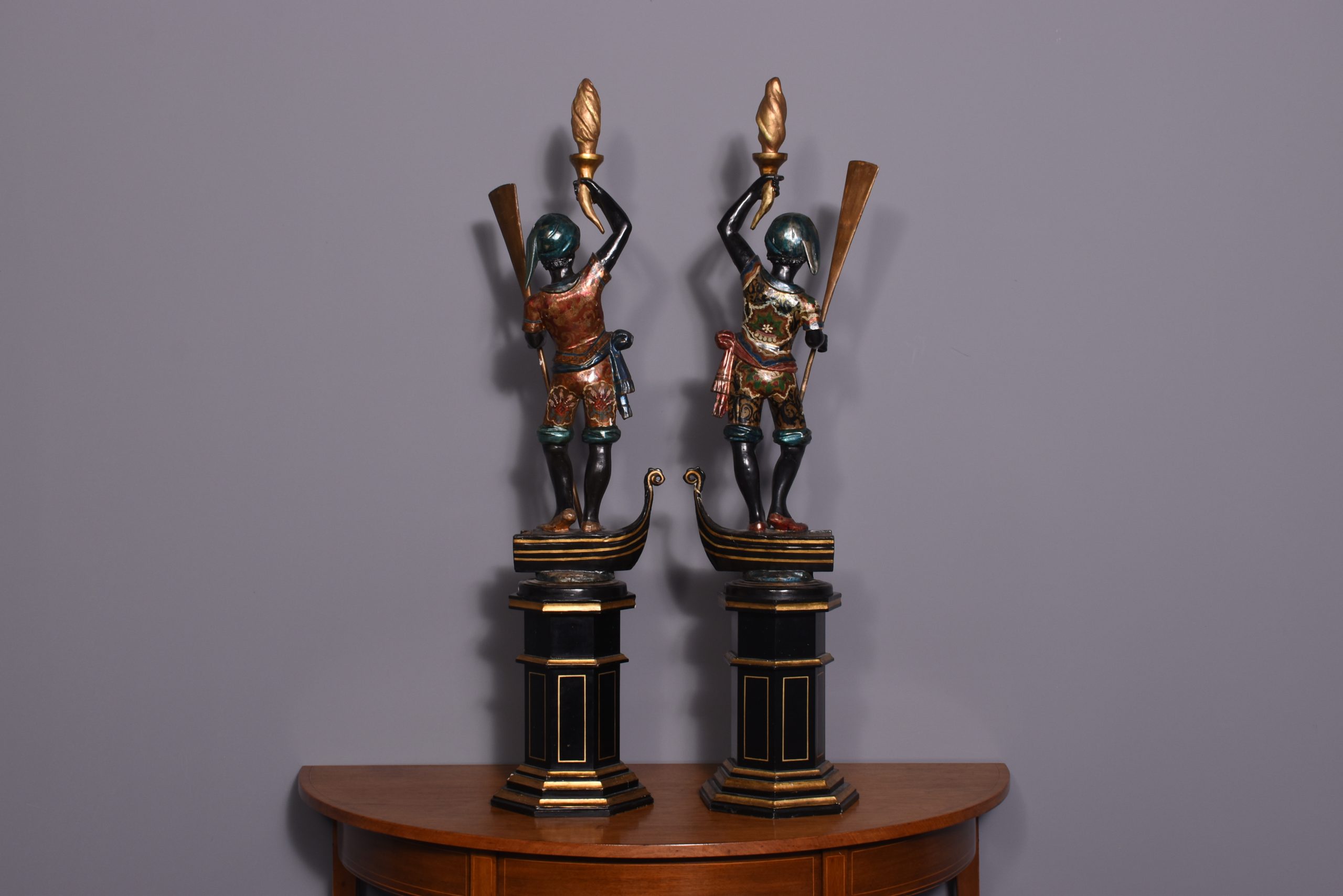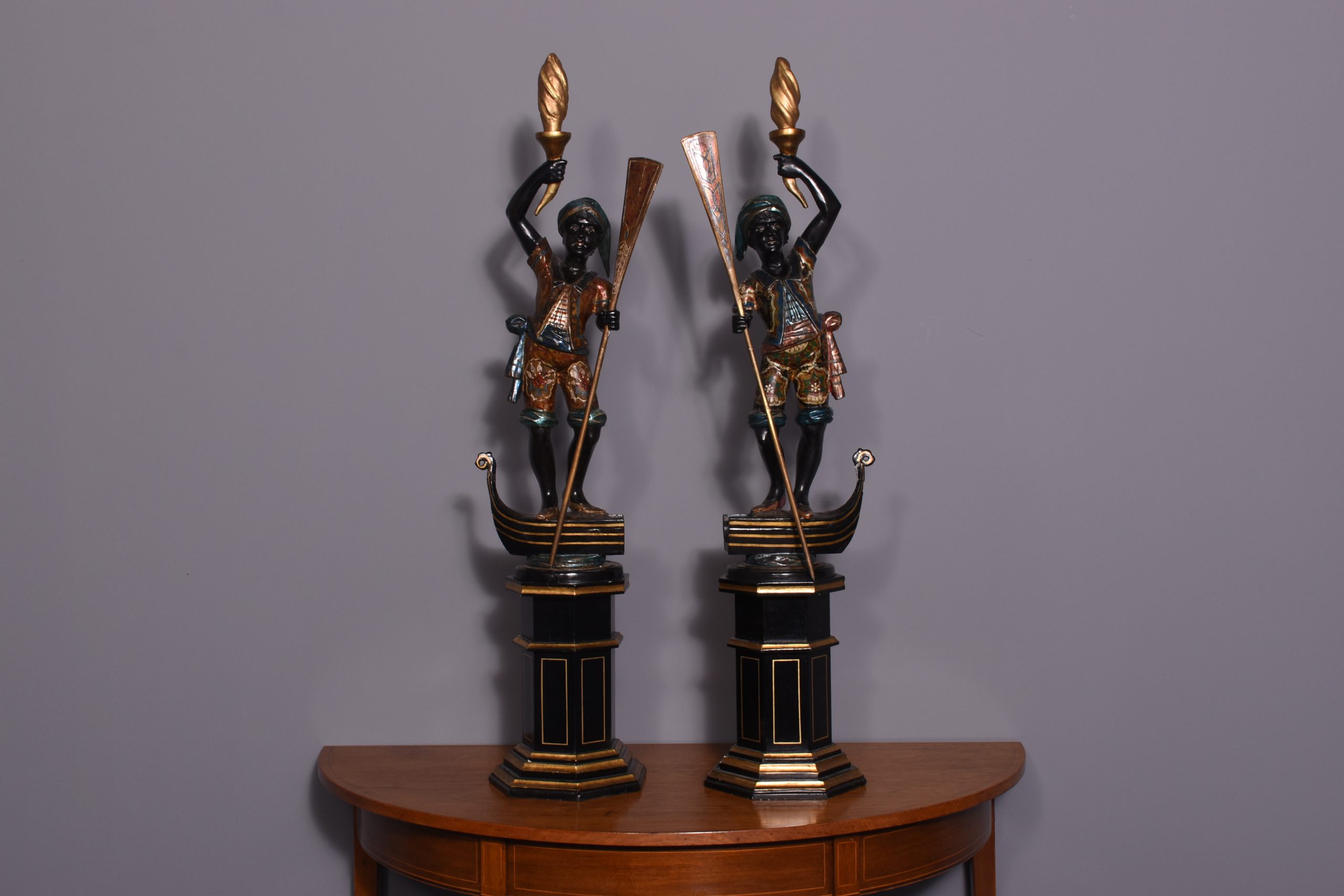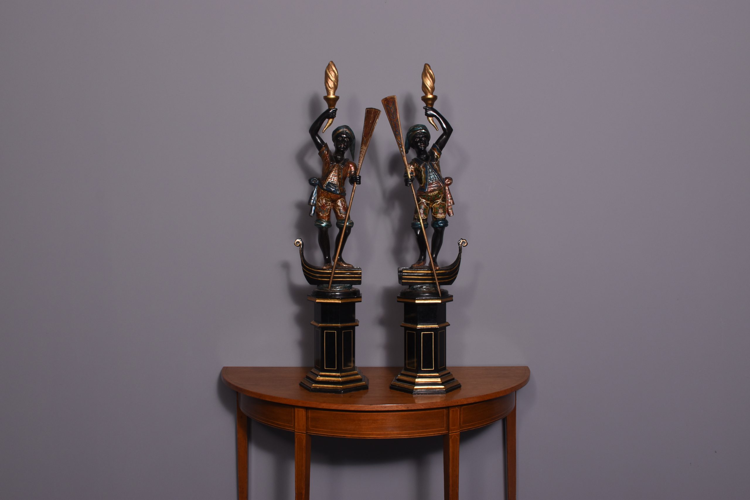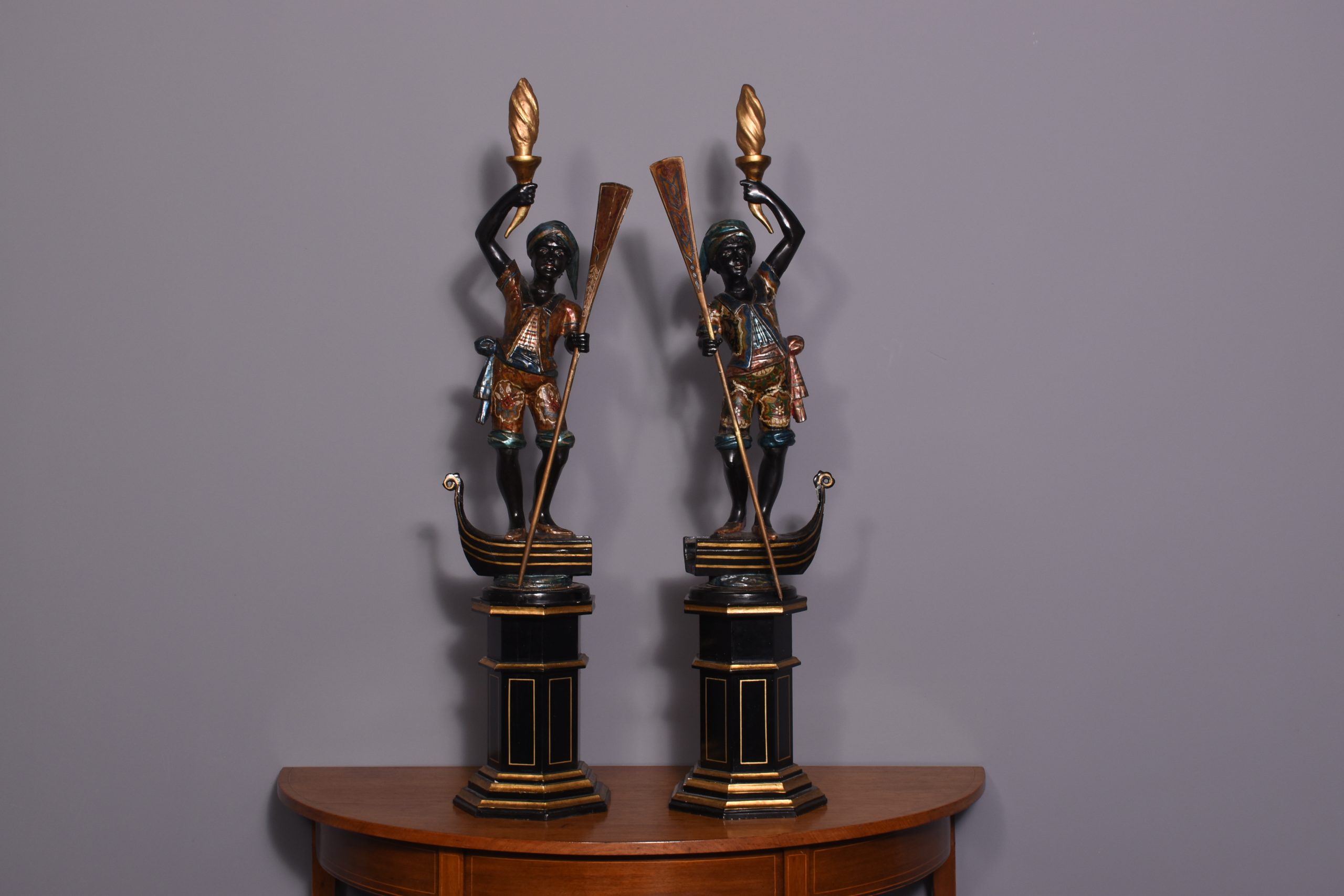 Circa 1870. A stylish pair of Venetian ebonised and polychrome figures of Blackamoor Gondoliers, each with stylish decorated outfits, including shoes, breeches and tops, holding a torch aloft in one hand and a stylish decorated oar in the other, resting on the prow of a gondola, both raised on hexagonal gilded and ebonised bases with stepped enclosed plinths.