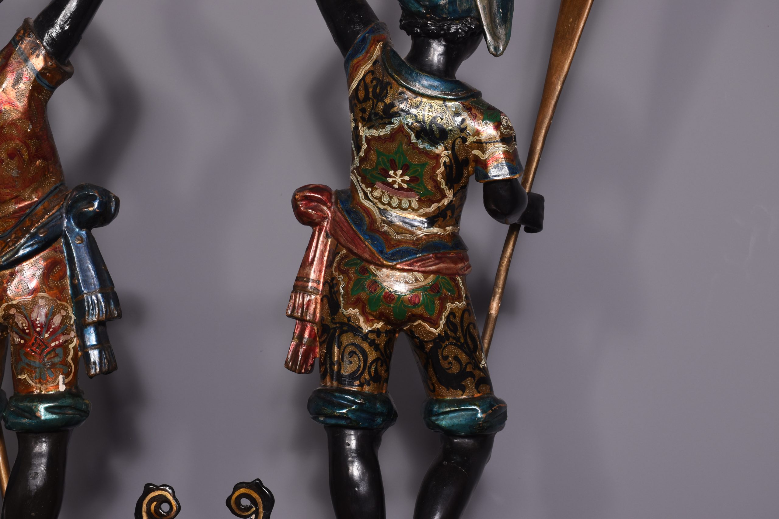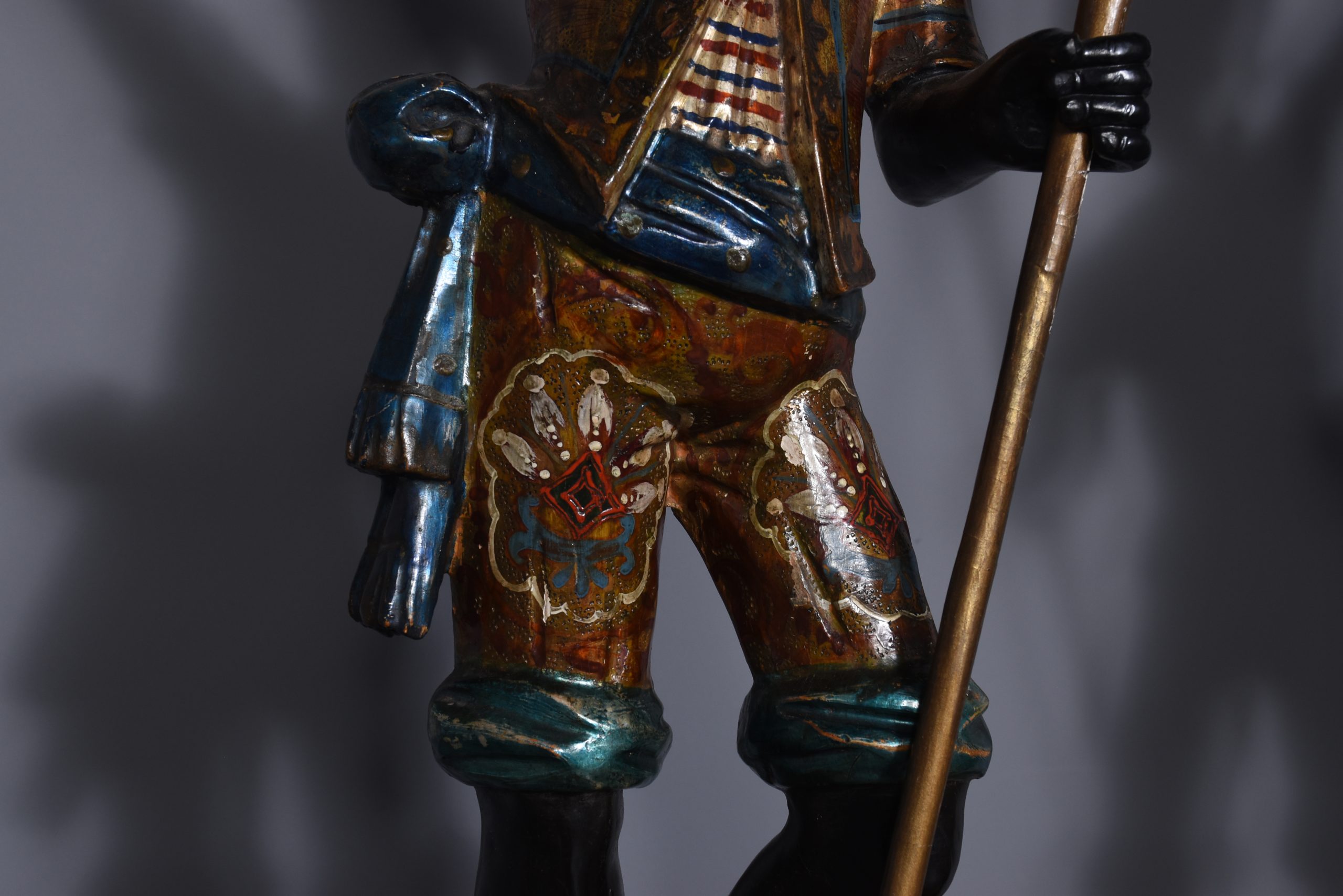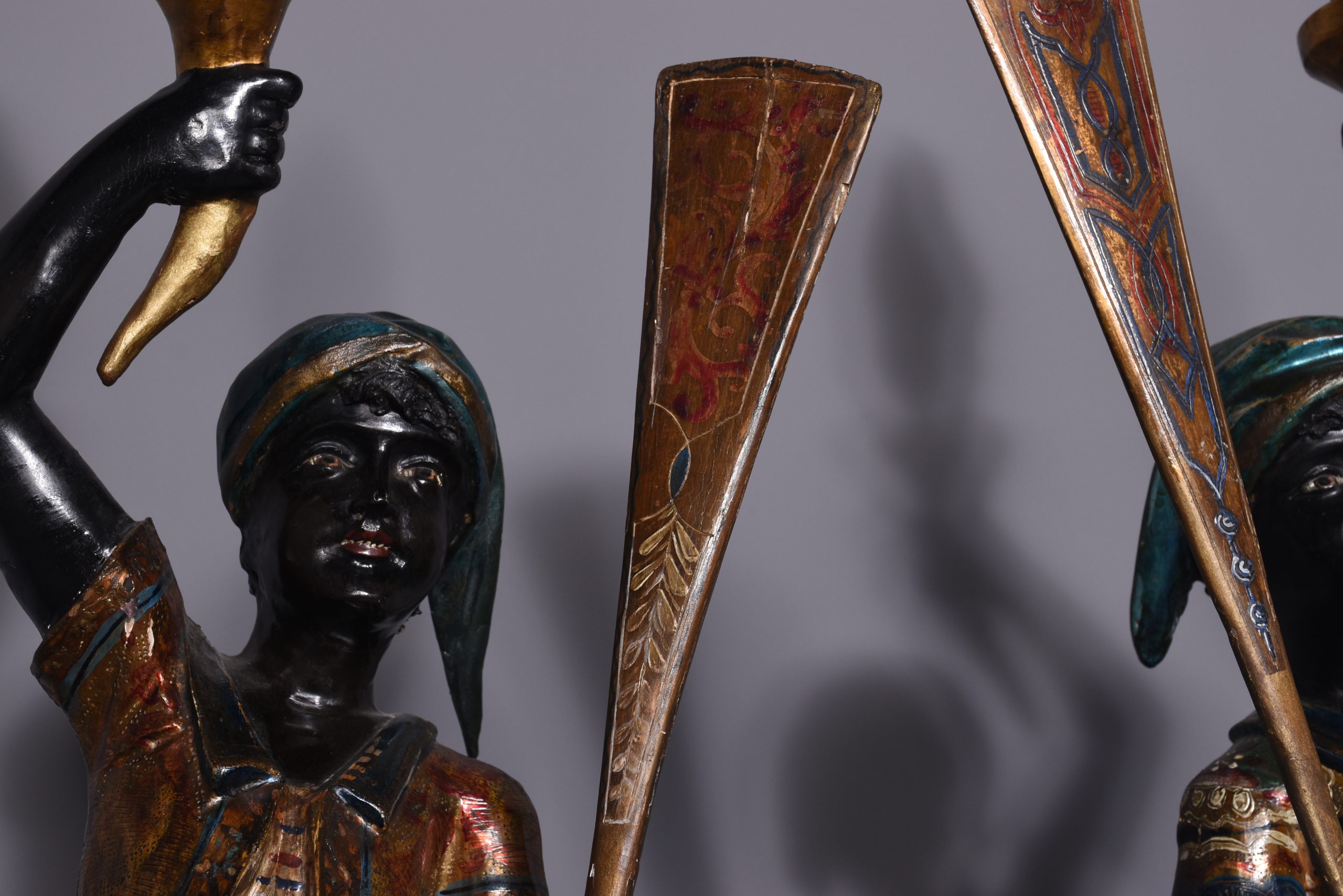 Circa 1870. A stylish pair of Venetian ebonised and polychrome figures of Blackamoor Gondoliers, each with stylish decorated outfits, including shoes, breeches and tops, holding a torch aloft in one hand and a stylish decorated oar in the other, resting on the prow of a gondola, both raised on hexagonal gilded and ebonised bases with stepped enclosed plinths.