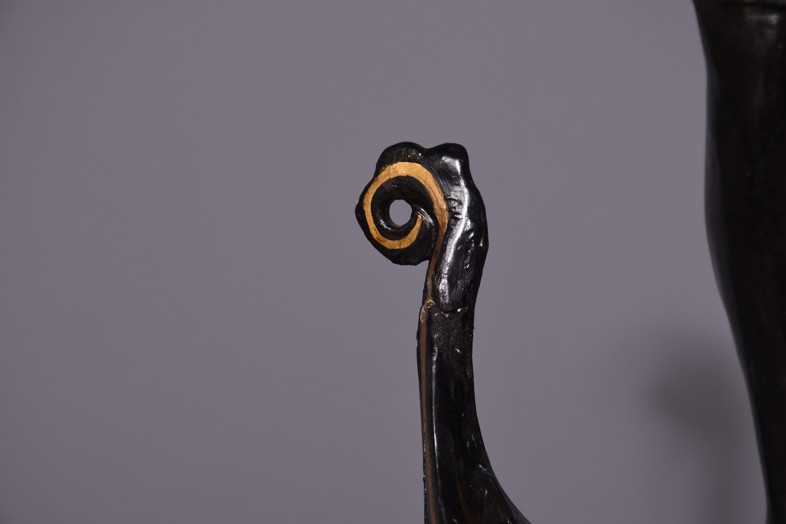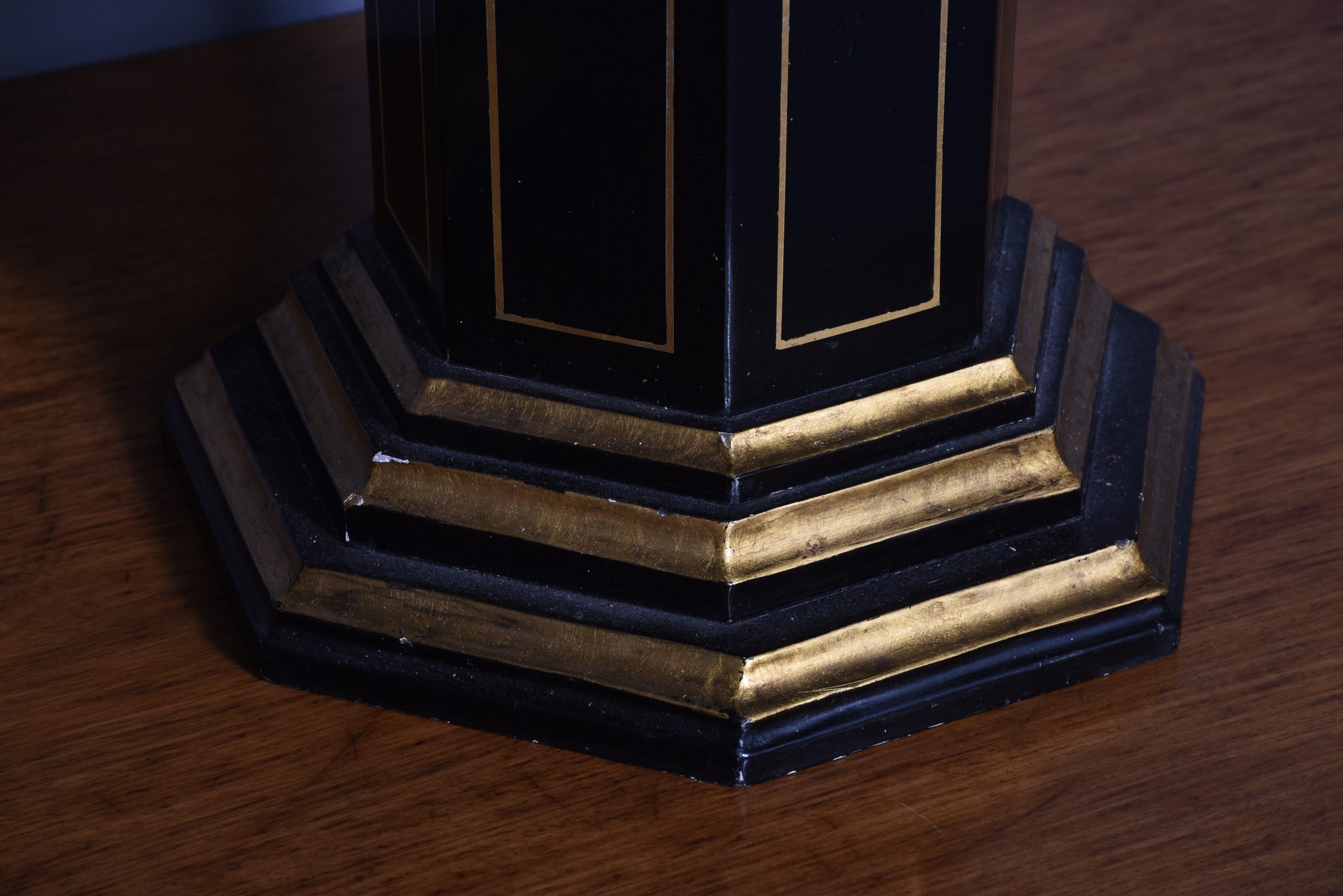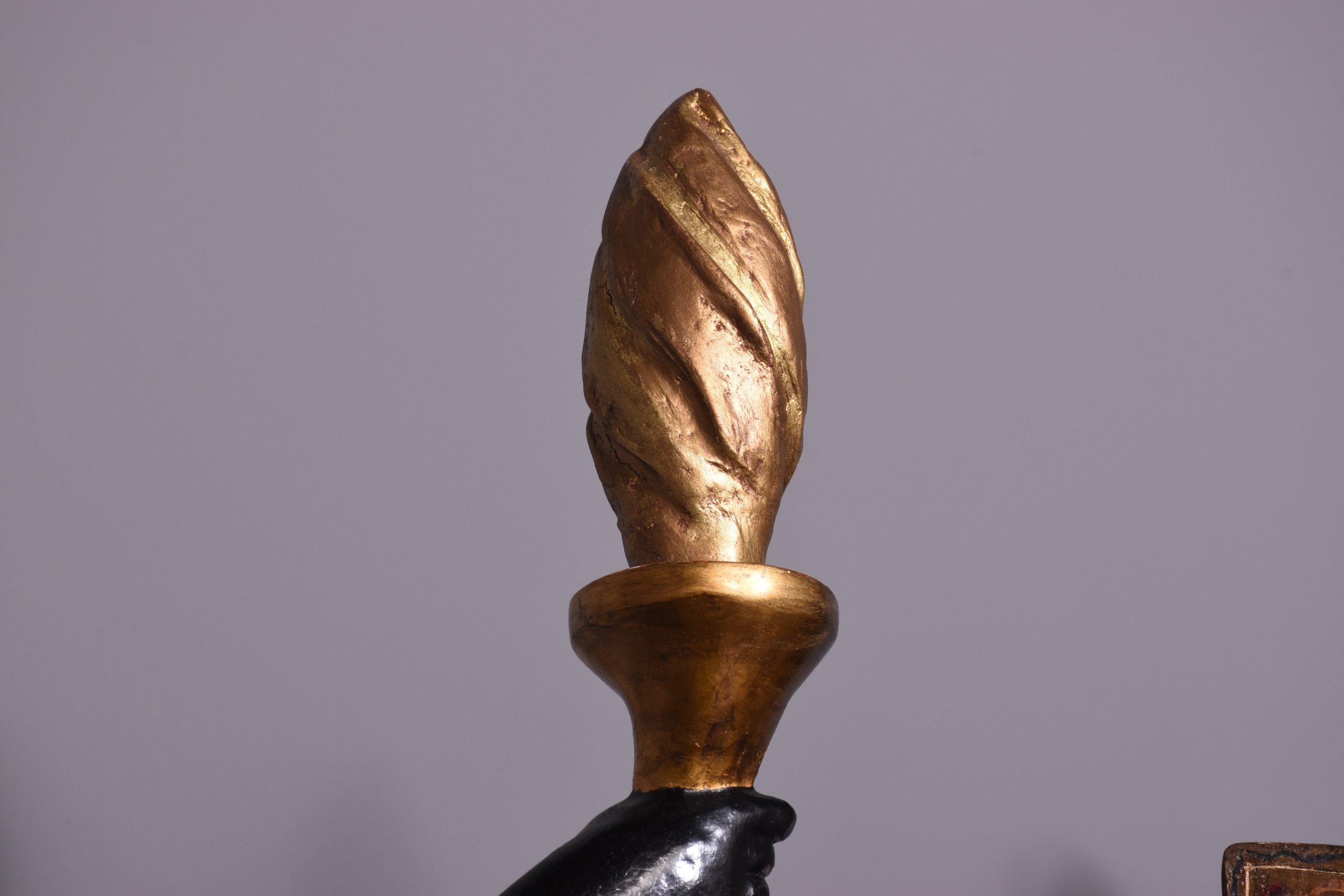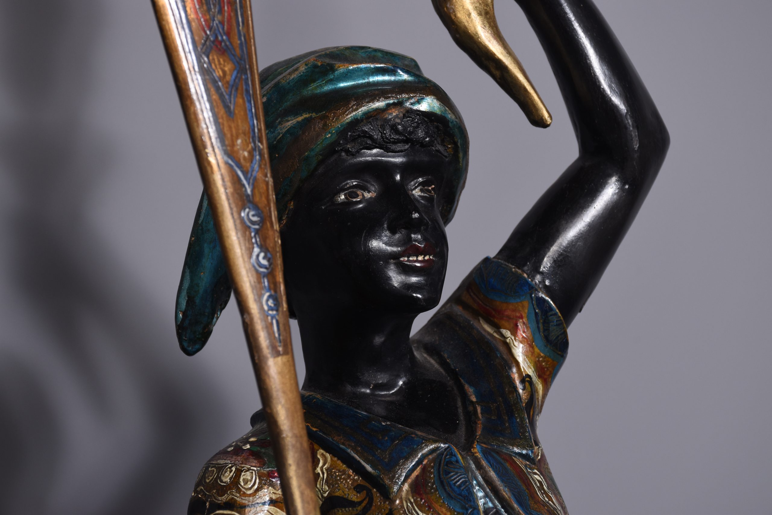Circa 1870. A stylish pair of Venetian ebonised and polychrome figures of Blackamoor Gondoliers, each with stylish decorated outfits, including shoes, breeches and tops, holding a torch aloft in one hand and a stylish decorated oar in the other, resting on the prow of a gondola, both raised on hexagonal gilded and ebonised bases with stepped enclosed plinths.