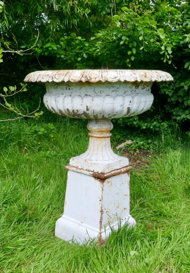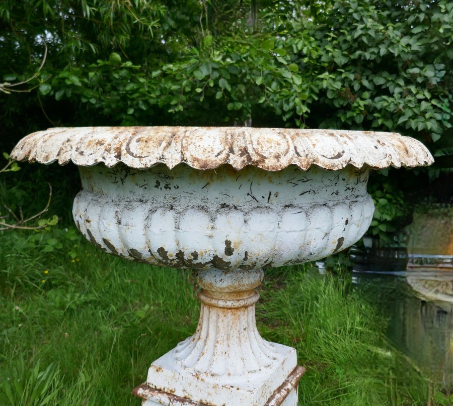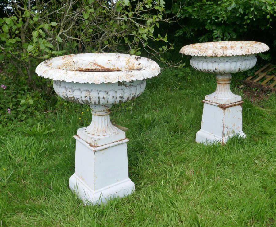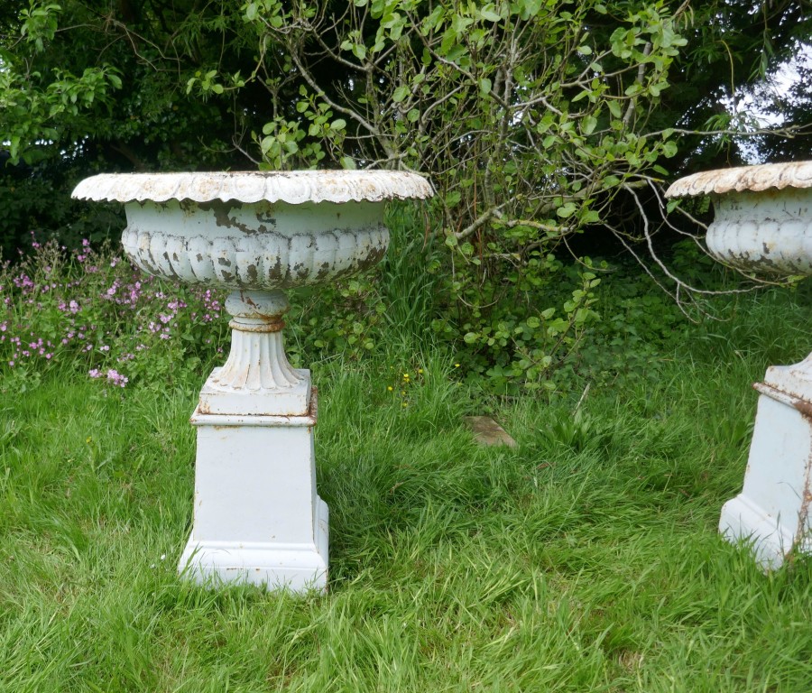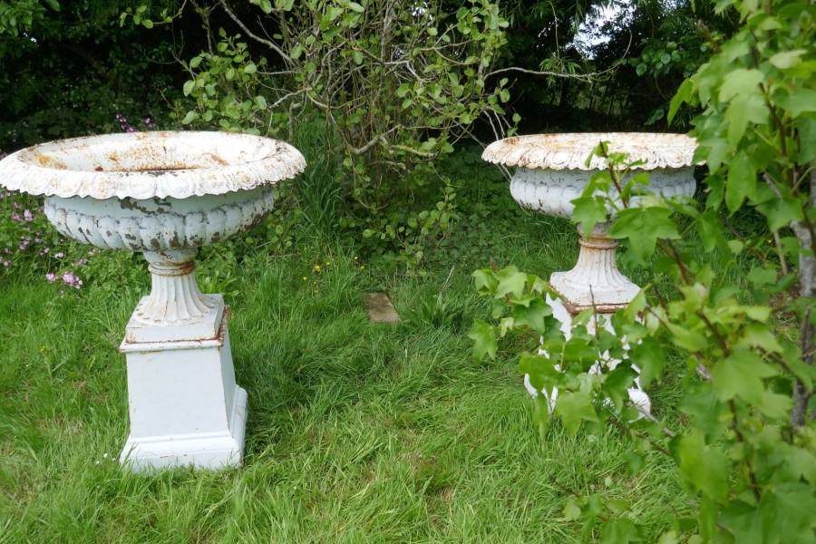 Pair of very large Victorian cast iron garden urns, garden planters This is a superb and unusually large pair of cast iron urns The urns are in good condition for their age, still very sound although they are weather worn and have slightly rusty paint which after all this time has protected them from the elements, they could be repainted for a newer spruced up look These are very heavy pieces needless to say, they do come into three to aid transportation, we will supply new fixings with the pair The urns are 52” tall, and 44” in diameter WD88. Manufacture Date : 1900 Materials : Iron