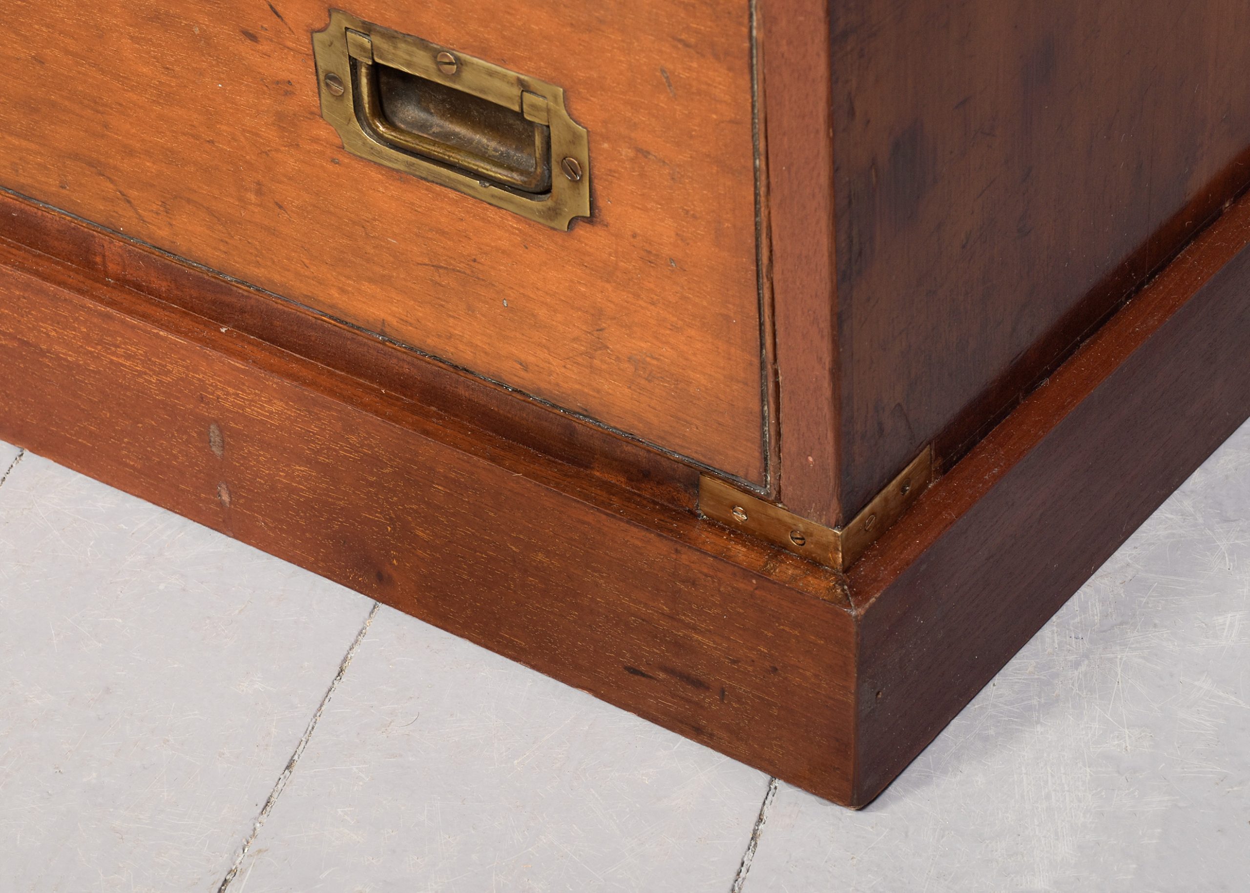 Circa 1850 with adaptations. Pair of Victorian brass-bound neat-sized mahogany military chest of drawers. The tops in figured mahogany with inset brass corners above four graduated drawers with inset brass campaign handles and brass strapping. All supported on a neat, enclosed plinth. In excellent condition.
