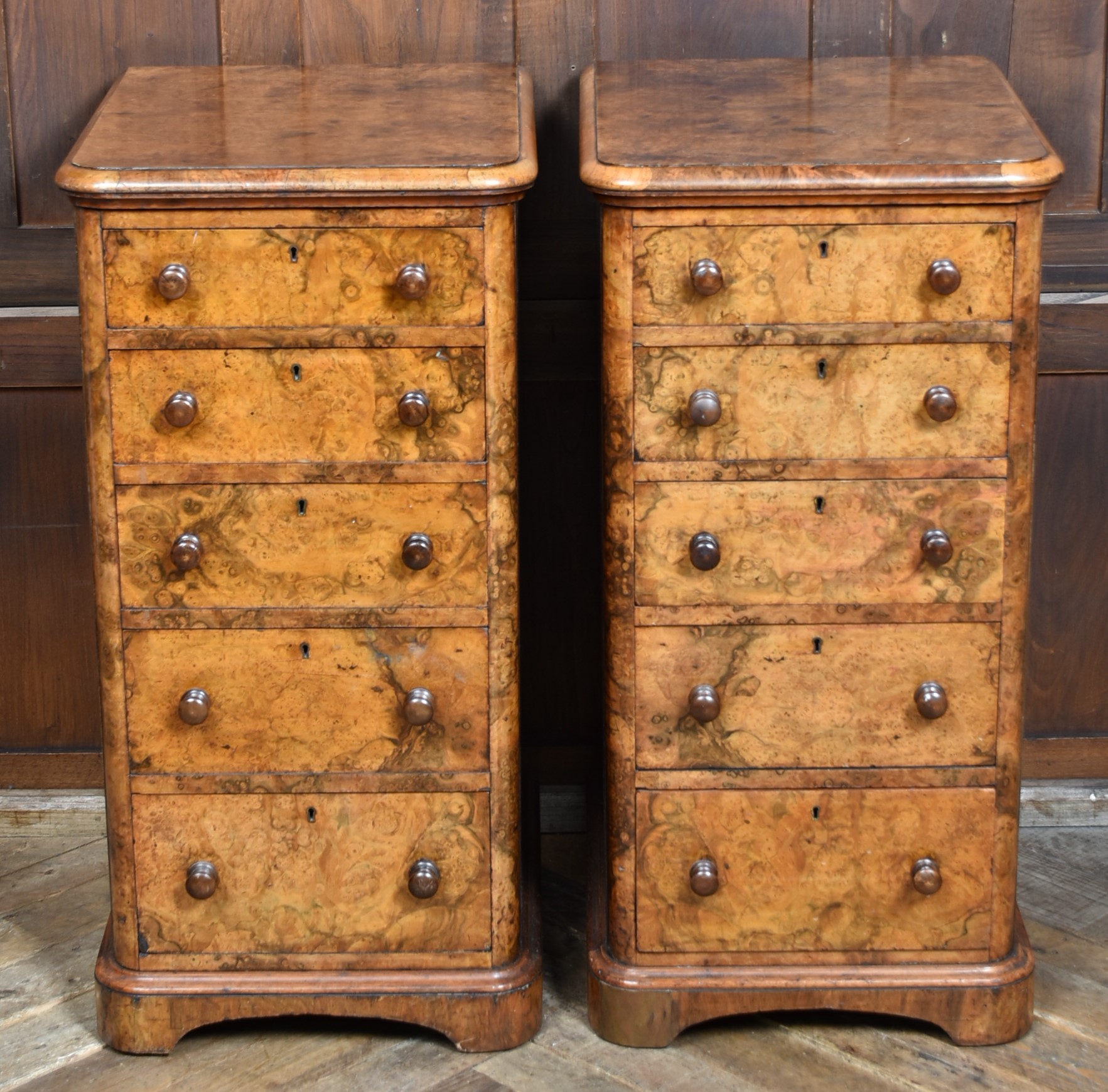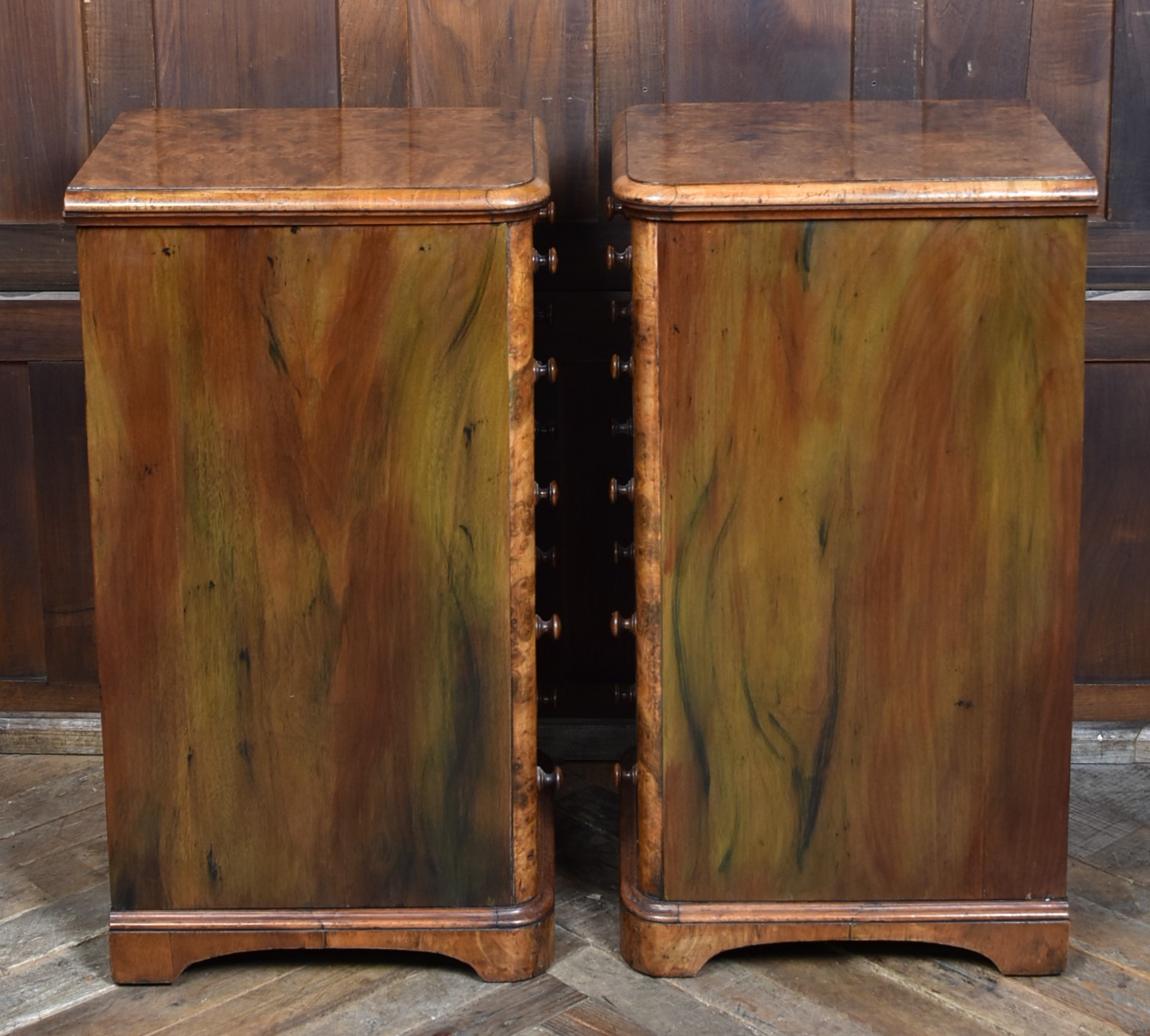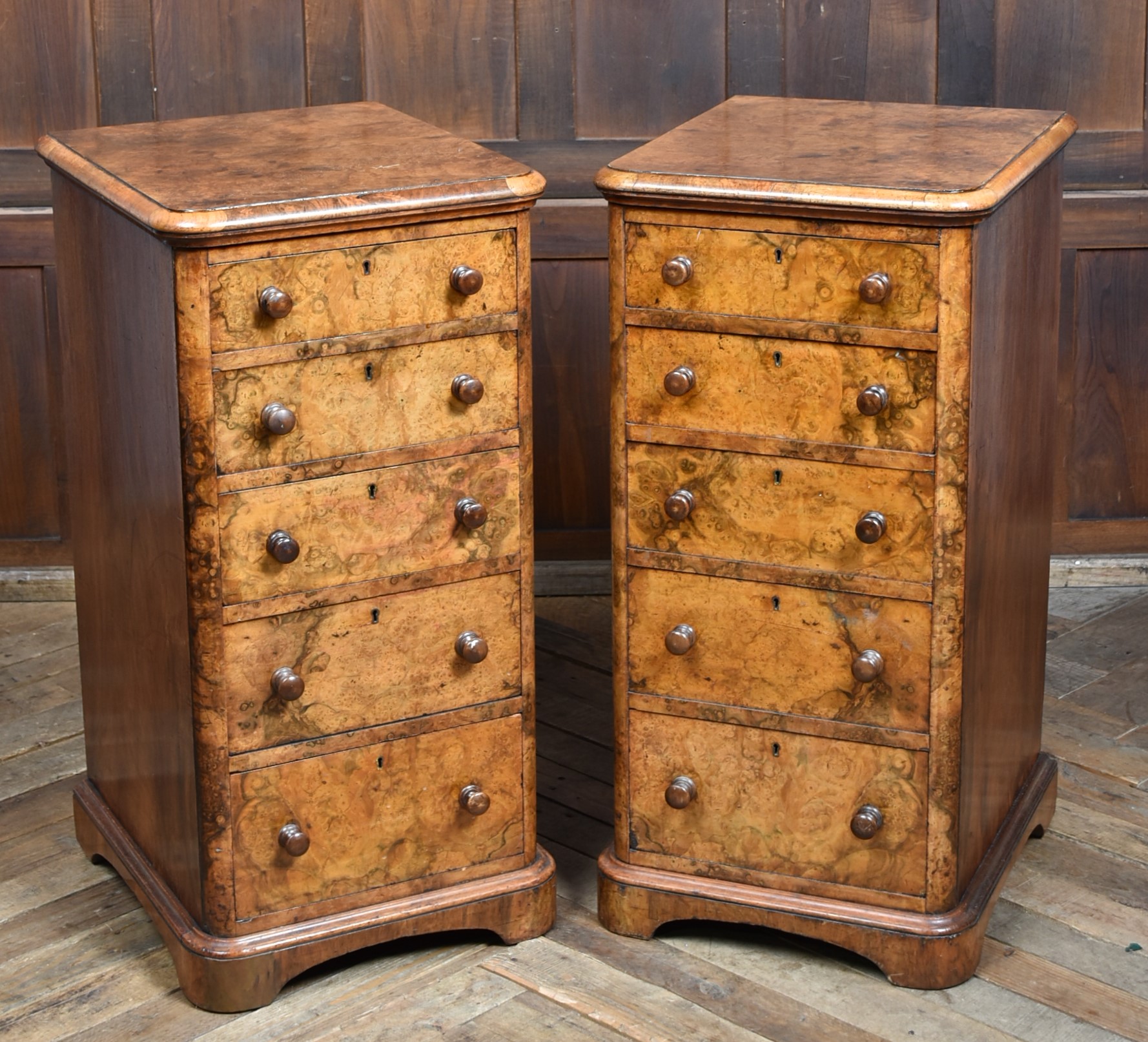 Wonderful pair of Victorian burr walnut bedside drawers in wonderful antique condition. Each set features five graduating drawers, all beautifully lined in green baize and fitted with twin turned walnut knobs. The rich burr walnut veneers display a captivating grain, lending warmth and character to their compact form. Their scale makes them ideal for bedside use, yet their craftsmanship and patina elevate them well beyond mere utility. As with all genuine antiques, minor imperfections consistent with age and use are present, enhancing their authenticity and charm.