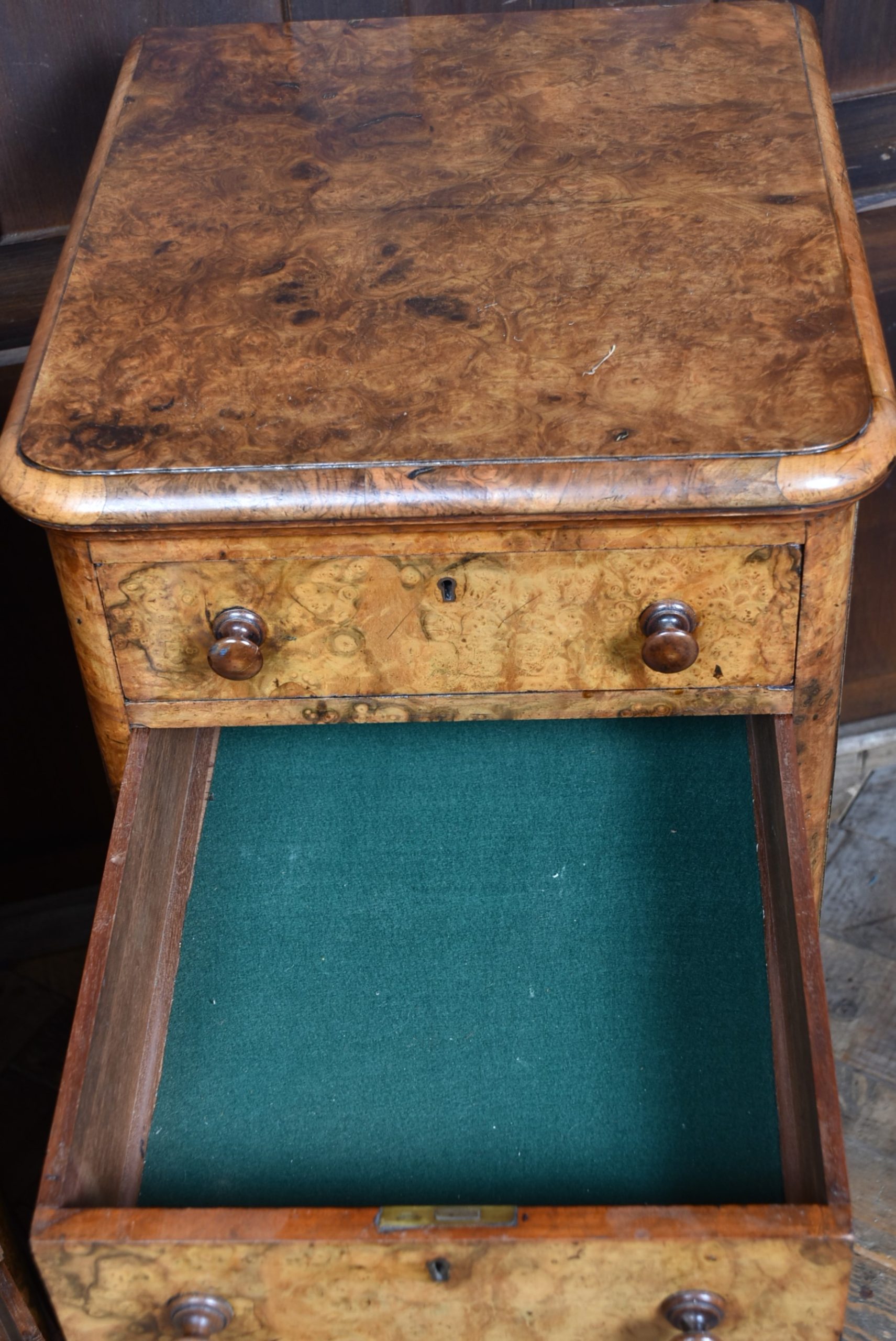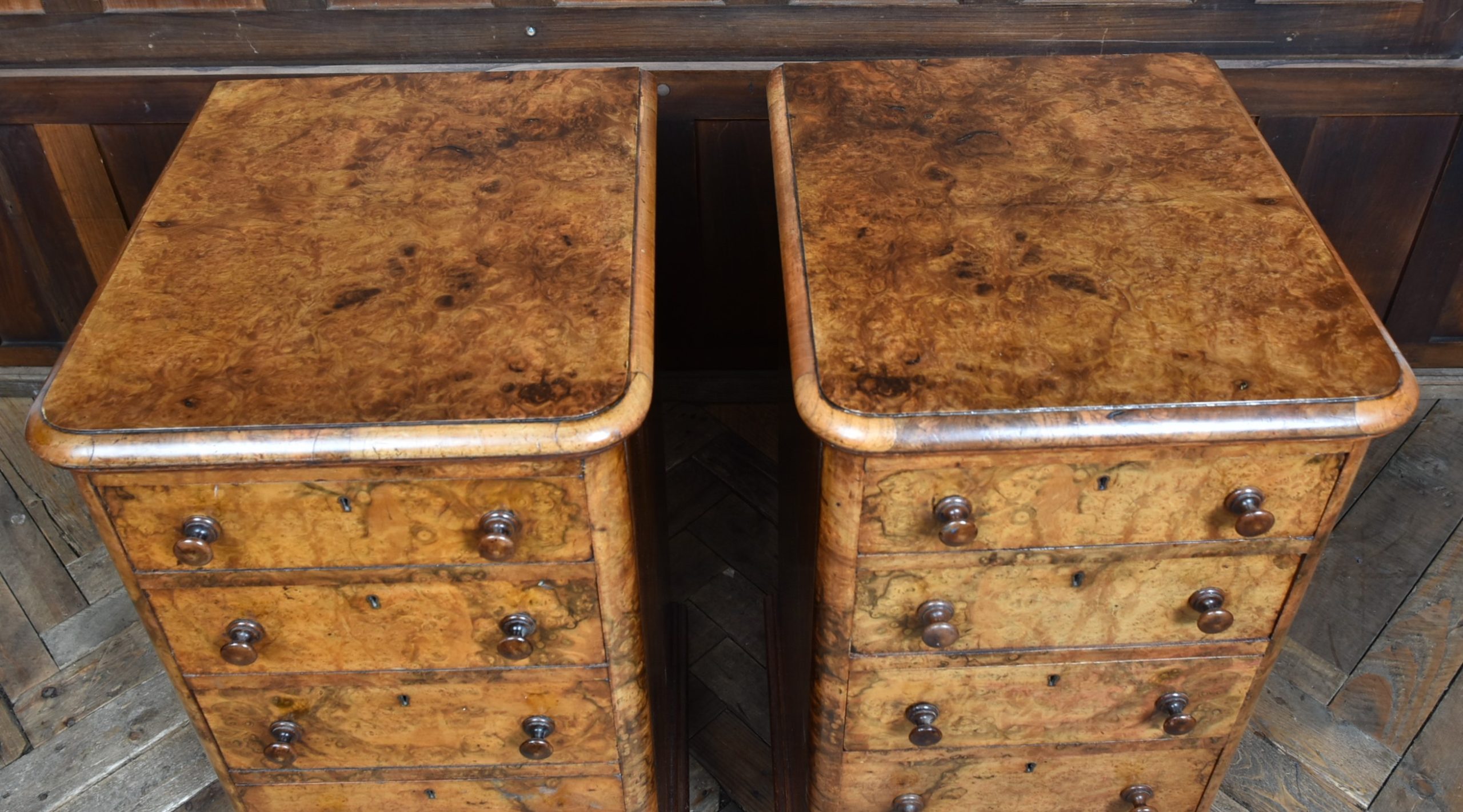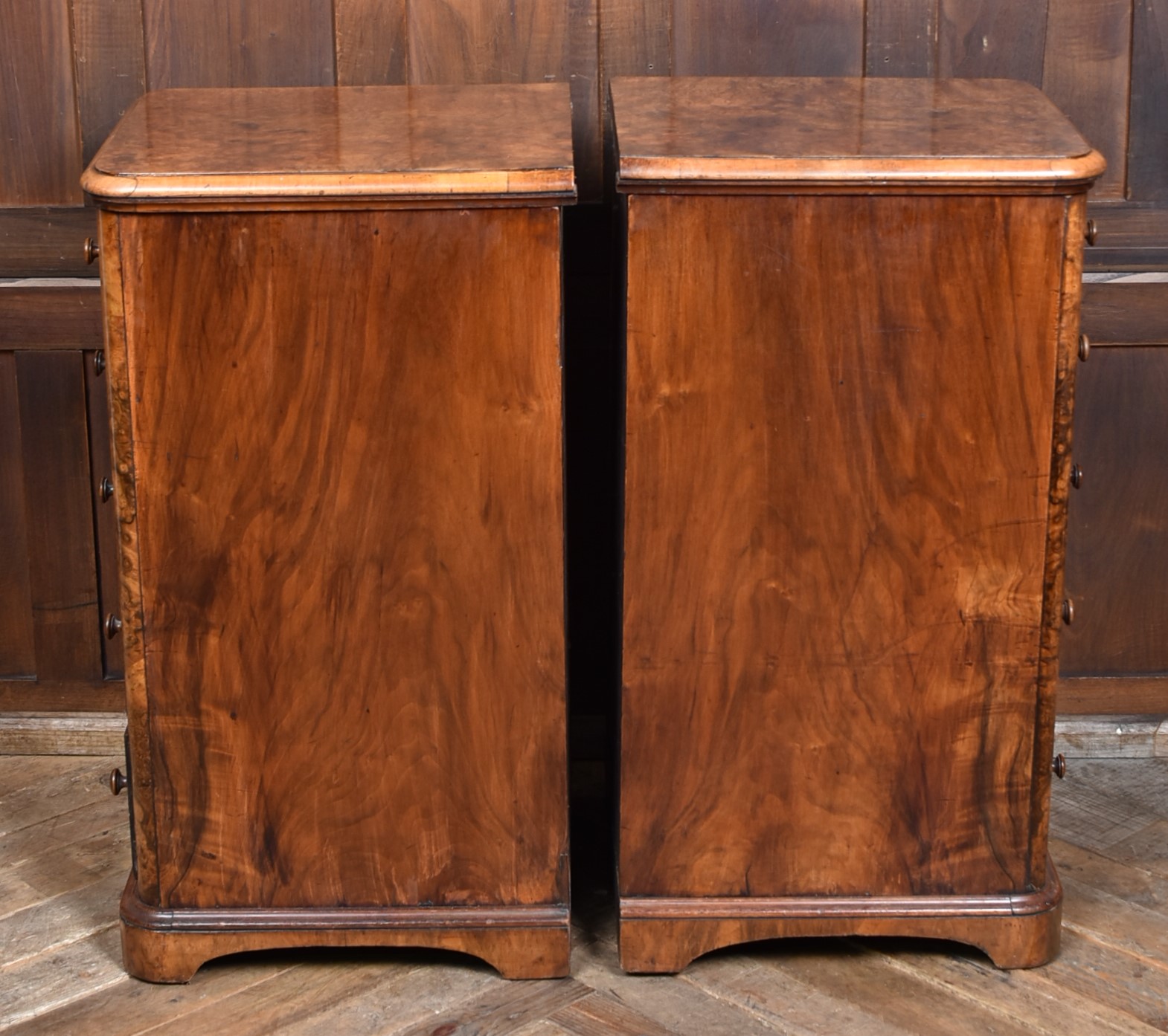 Wonderful pair of Victorian burr walnut bedside drawers in wonderful antique condition. Each set features five graduating drawers, all beautifully lined in green baize and fitted with twin turned walnut knobs. The rich burr walnut veneers display a captivating grain, lending warmth and character to their compact form. Their scale makes them ideal for bedside use, yet their craftsmanship and patina elevate them well beyond mere utility. As with all genuine antiques, minor imperfections consistent with age and use are present, enhancing their authenticity and charm.
