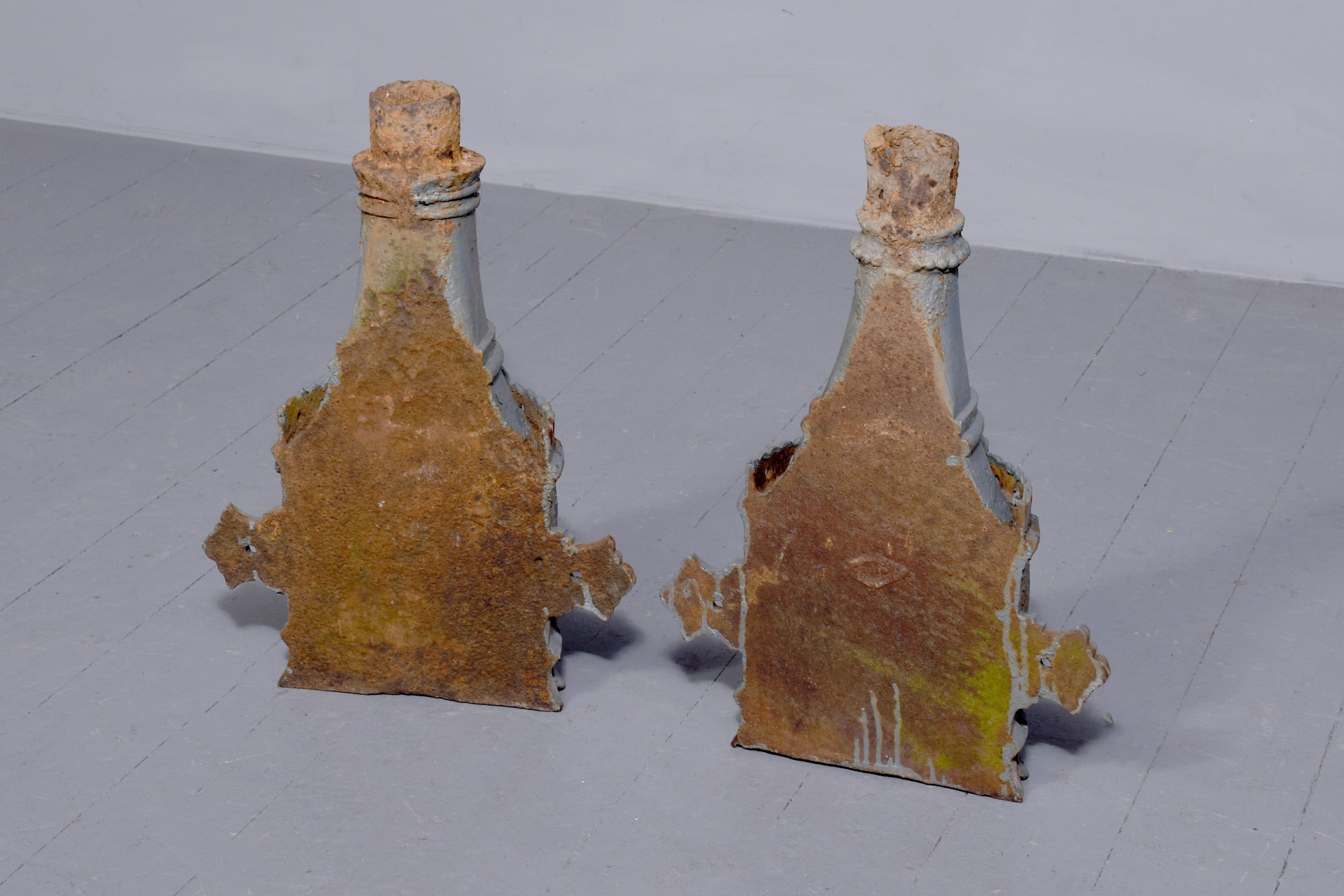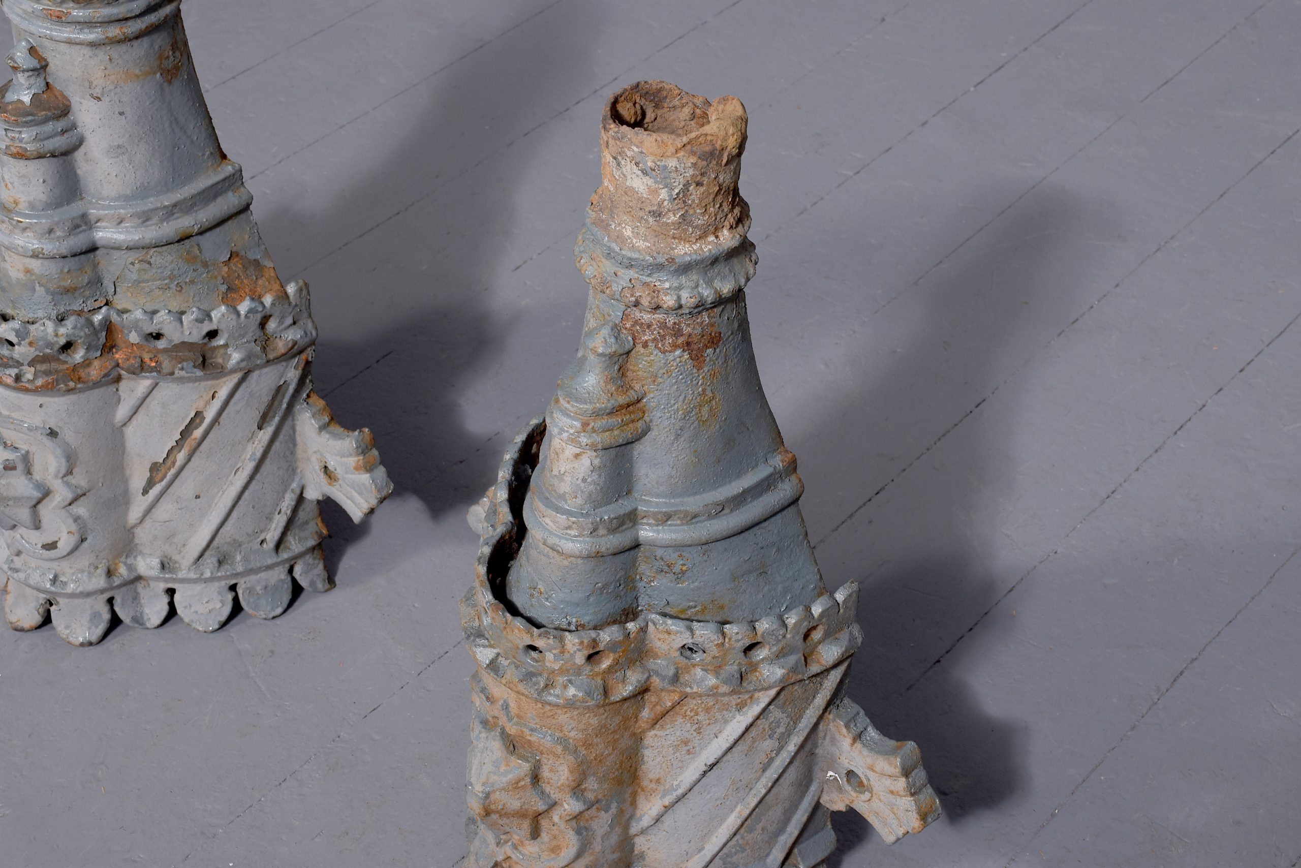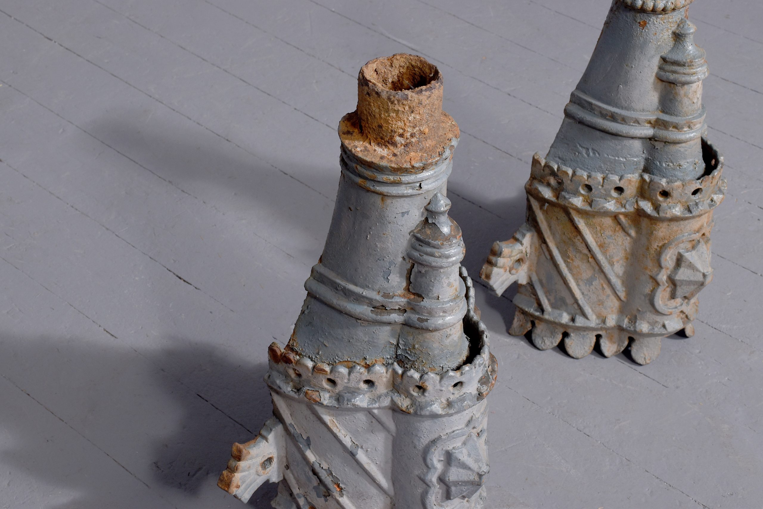 Circa 1870. A quality pair of cast iron rain water hoppers, each with a flared pierced top, curved front, faced by a cartouche shaped section with a star in the centre, the tapering body with pierced sections and a small frieze.