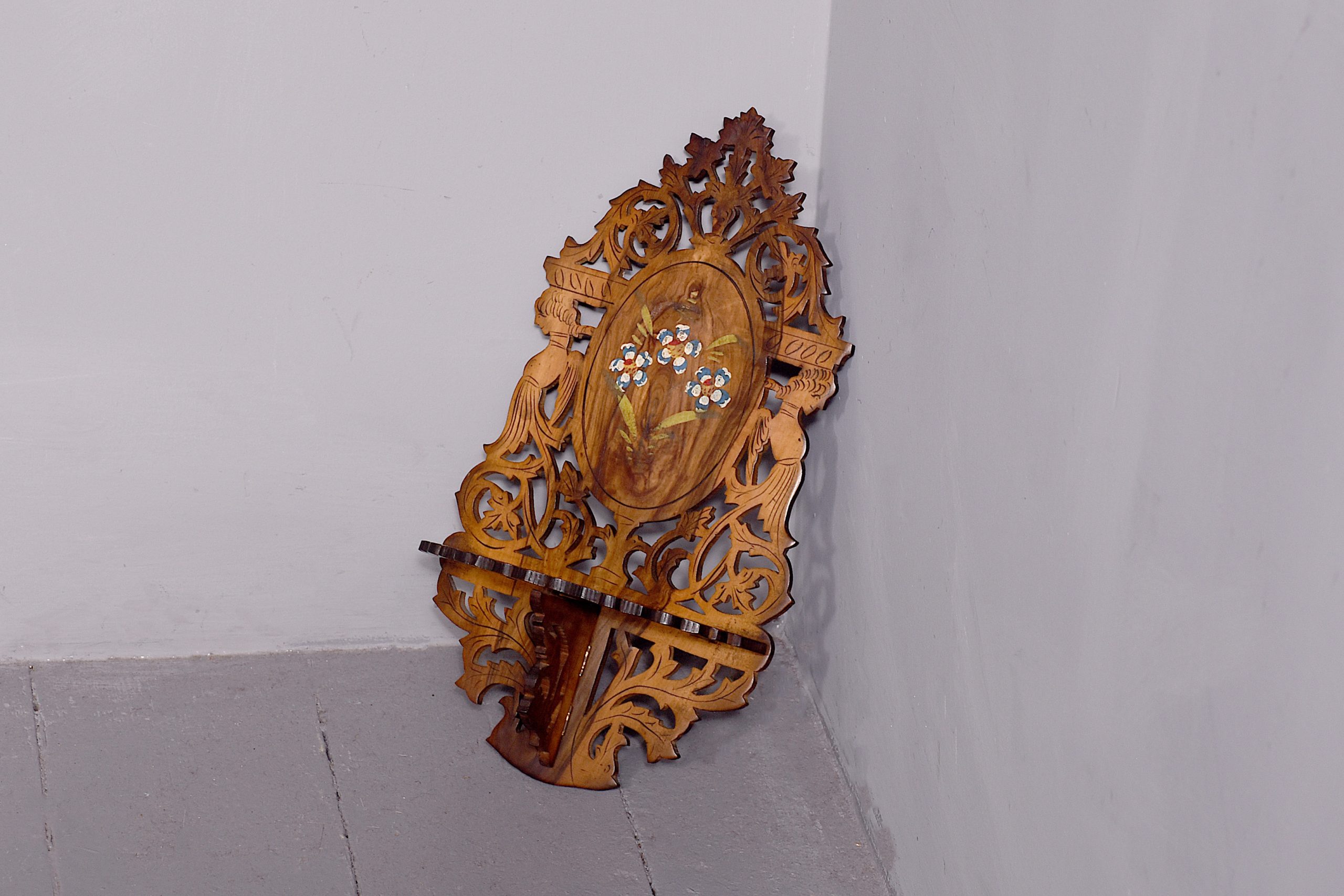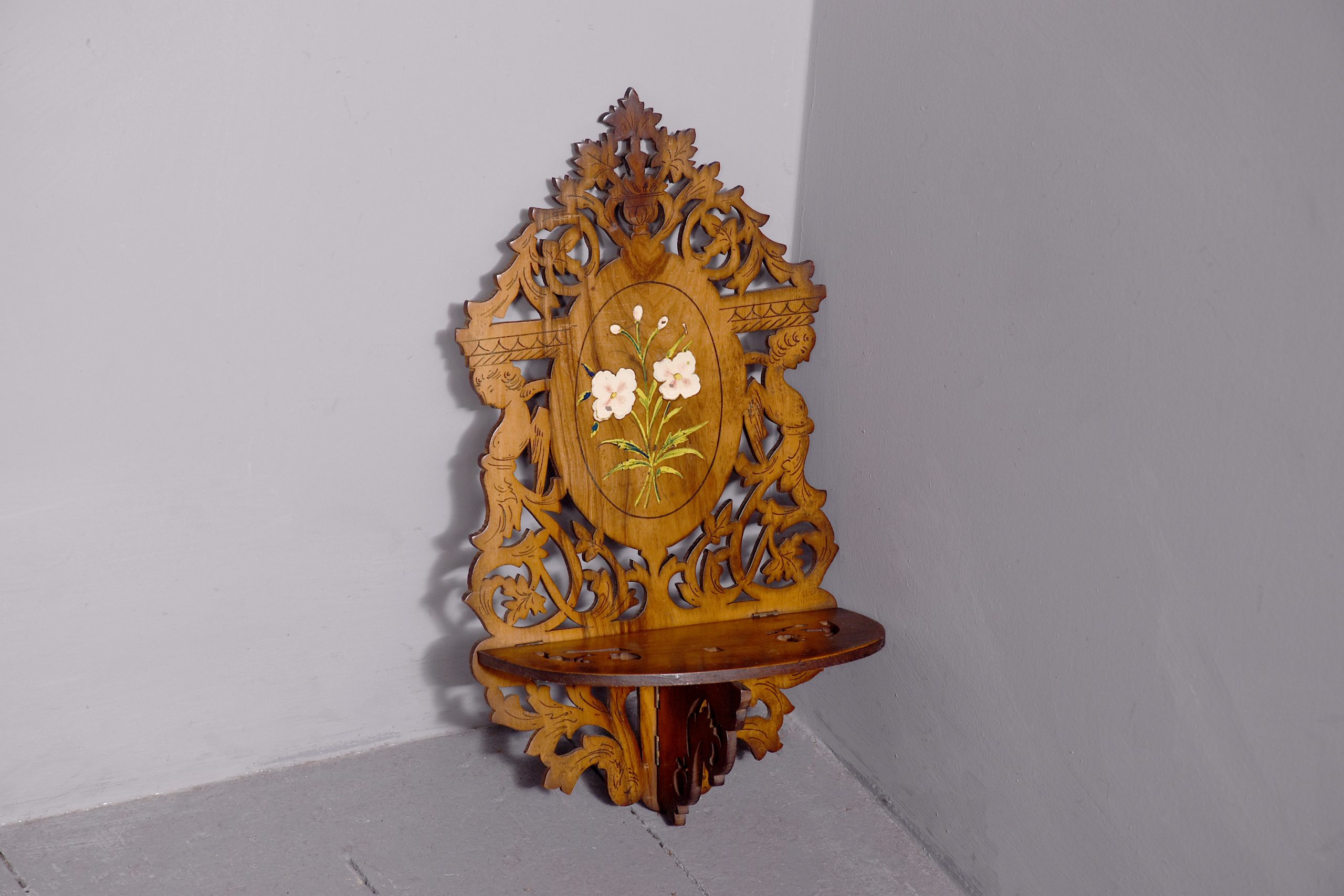 Circa 1880. A quality pair of Italian carved, pierced and painted wall brackets, the pierced and carved tops also with ink painting, the central panel painted with flowers with two winged cherubs to the sides, the s pierced shelf which can be folded away is supported on a pierced bracket with piercing to the base .