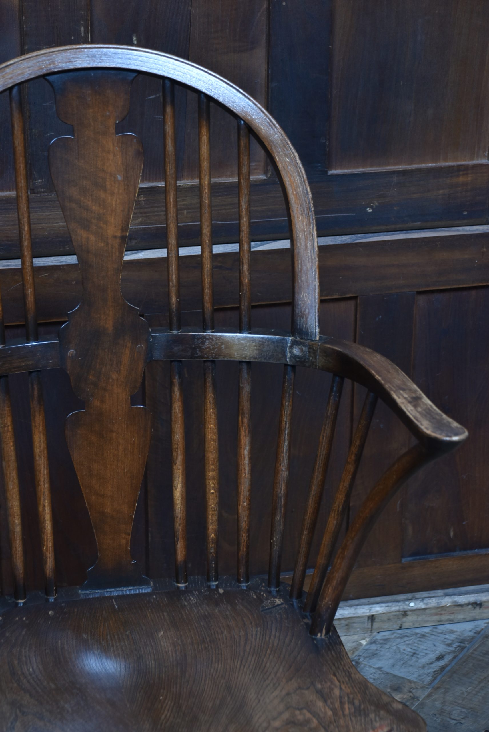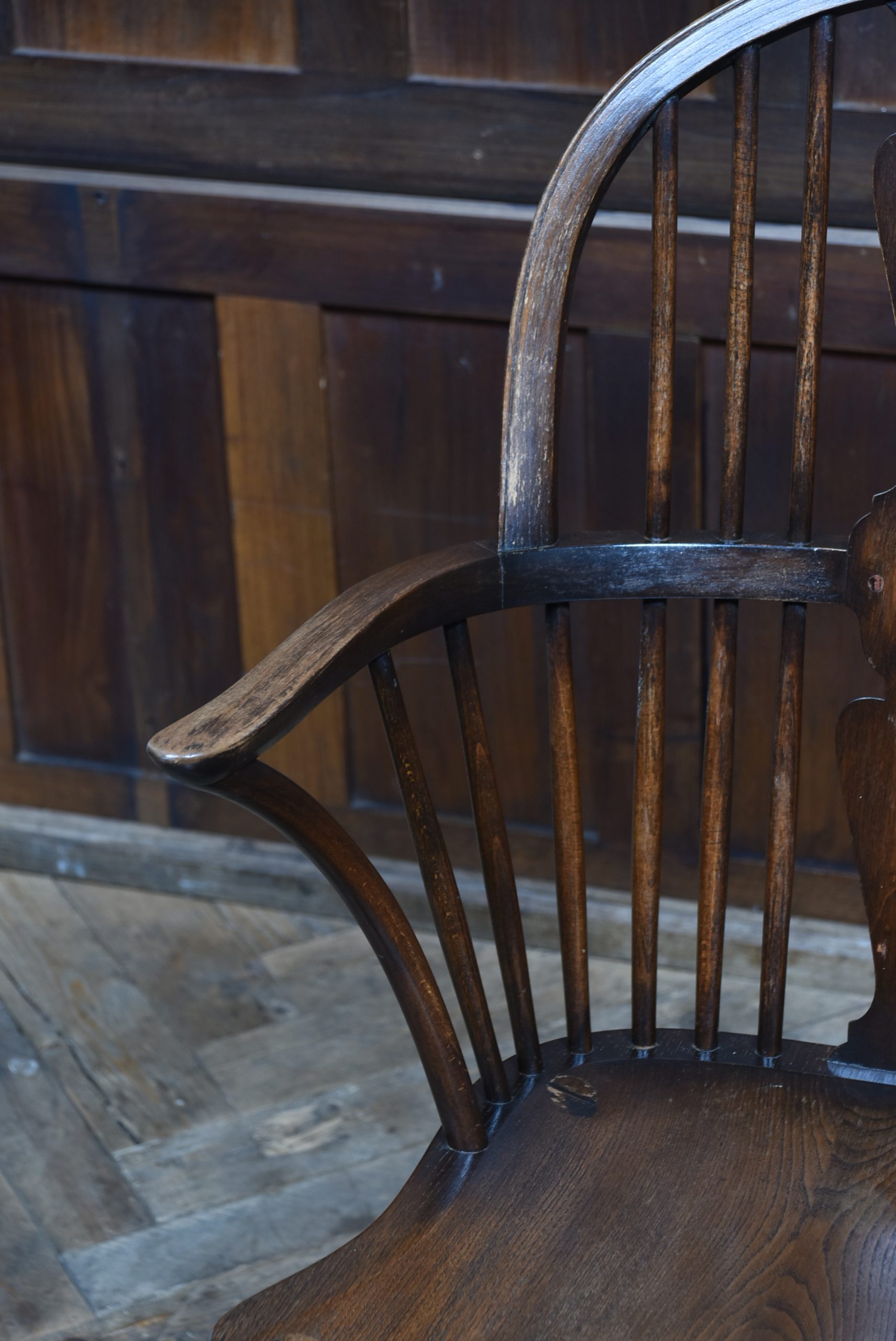 Wonderful pair of Windsor chairs in fabulous antique condition. These timeless pieces features gracefully hooped top rail and arms, supported by beautifully turned spindles, leading to a finely contoured saddle seat. The chair stands on elegant cabriole front legs and turned back legs, connected by a desirable crinoline stretcher for added stability and charm. As with all antique furniture, it carries minor imperfections that enhance its authenticity. With its solid construction, rich colouring, and lovely patina, these charming chair would make a perfect addition to a traditional or vintage-inspired setting.