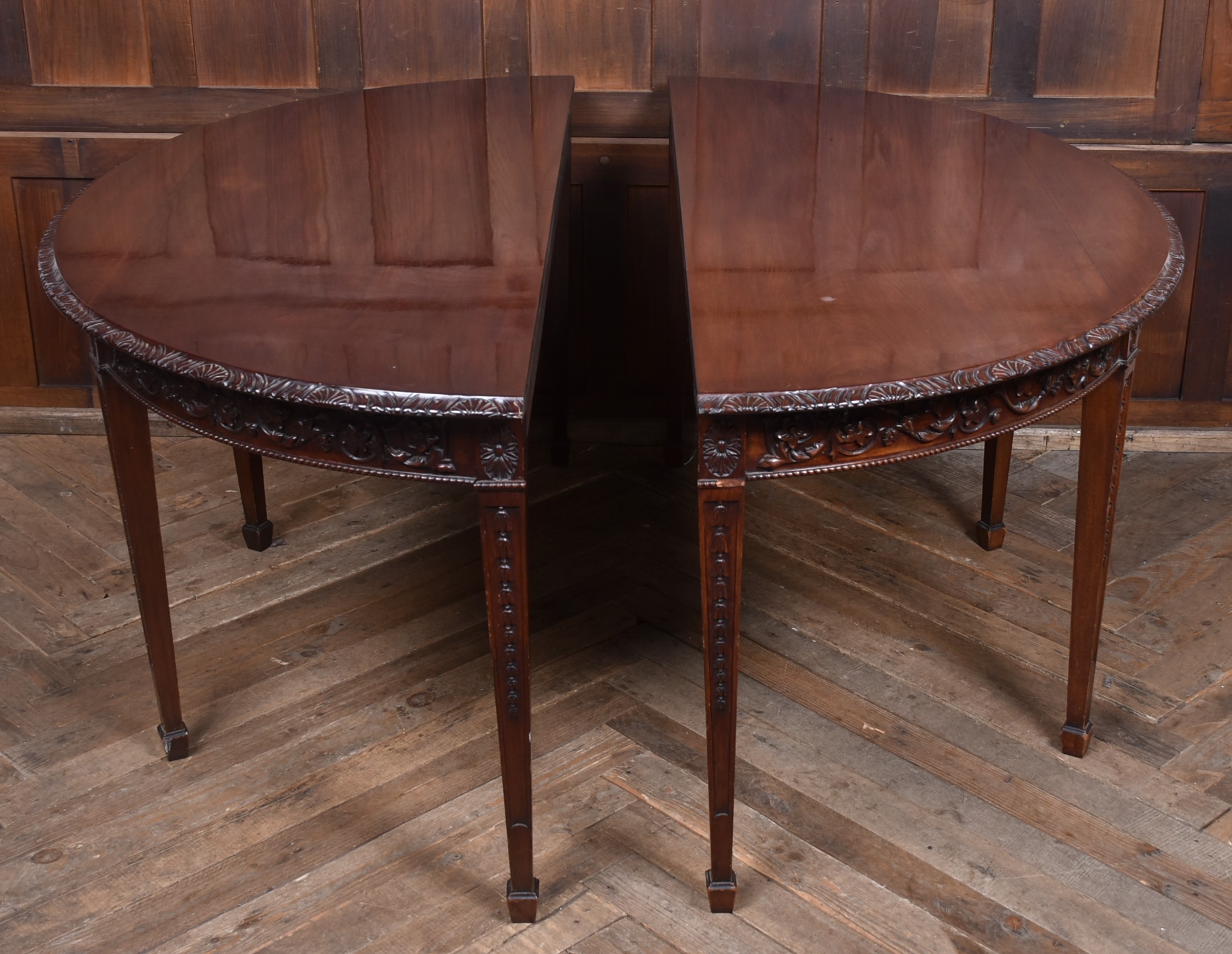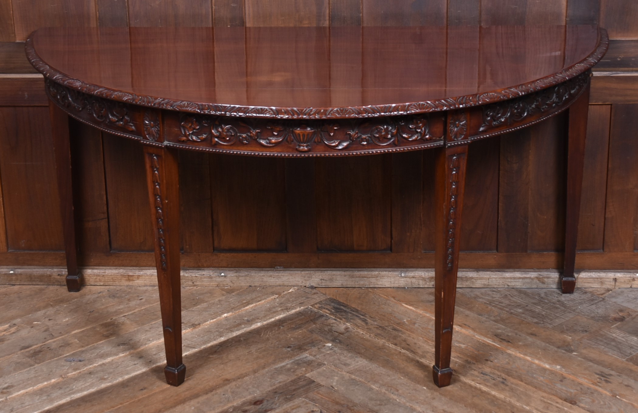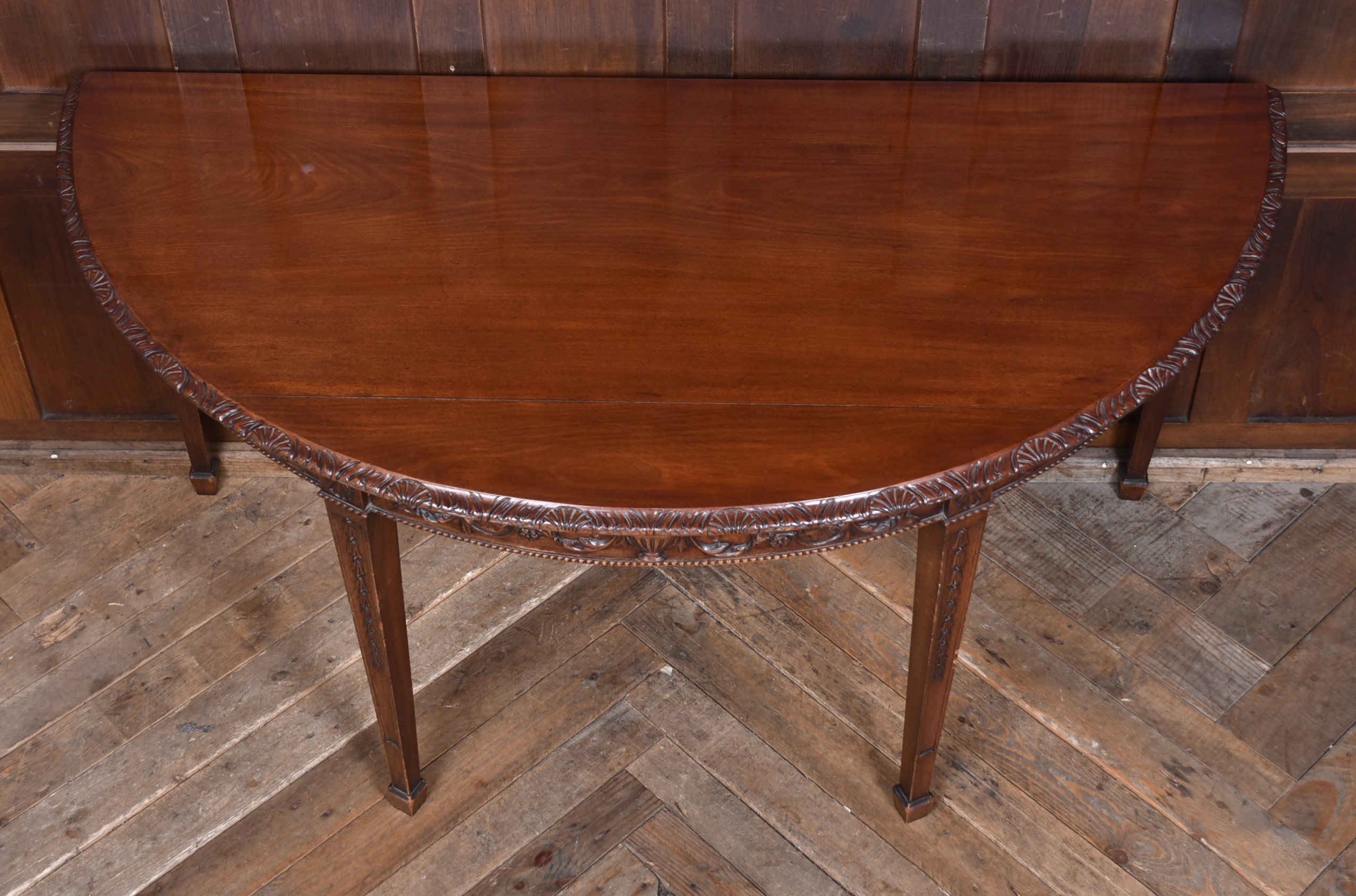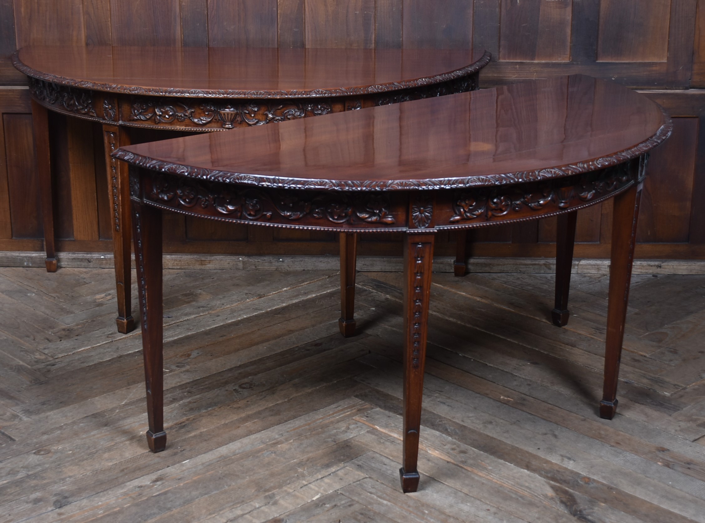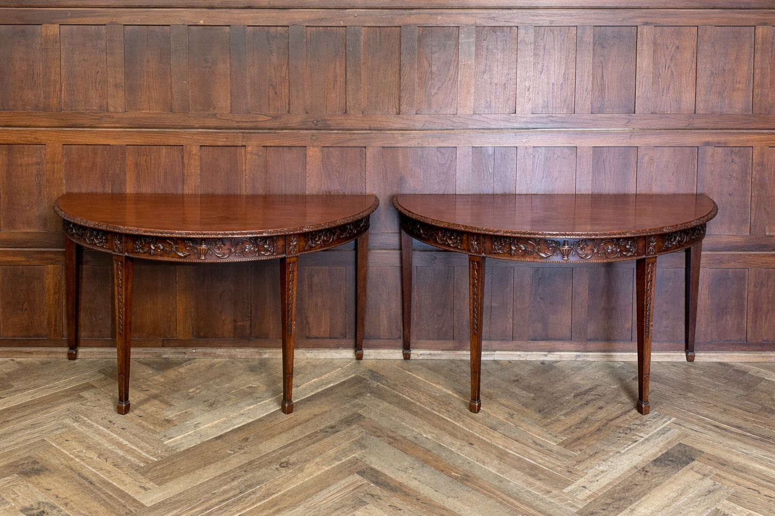 A beautifully matched pair of 19th‑century mahogany demi‑lune console tables, an increasingly scarce find in today’s market. Each table is crafted from richly toned mahogany with a warm, lustrous finish that accentuates the natural grain. The shaped apron is finely carved with scrolling foliate motifs. Standing on slender, tapering legs with carved detailing, the pair has a refined, balanced presence—ideal for framing an entrance hall, flanking a fireplace, or adding symmetry to any interior. Their scale and craftsmanship make them both practical and decorative, embodying the understated sophistication of late Georgian and early Victorian design. A rare opportunity to acquire a true pair, preserved in excellent condition and ready to place.