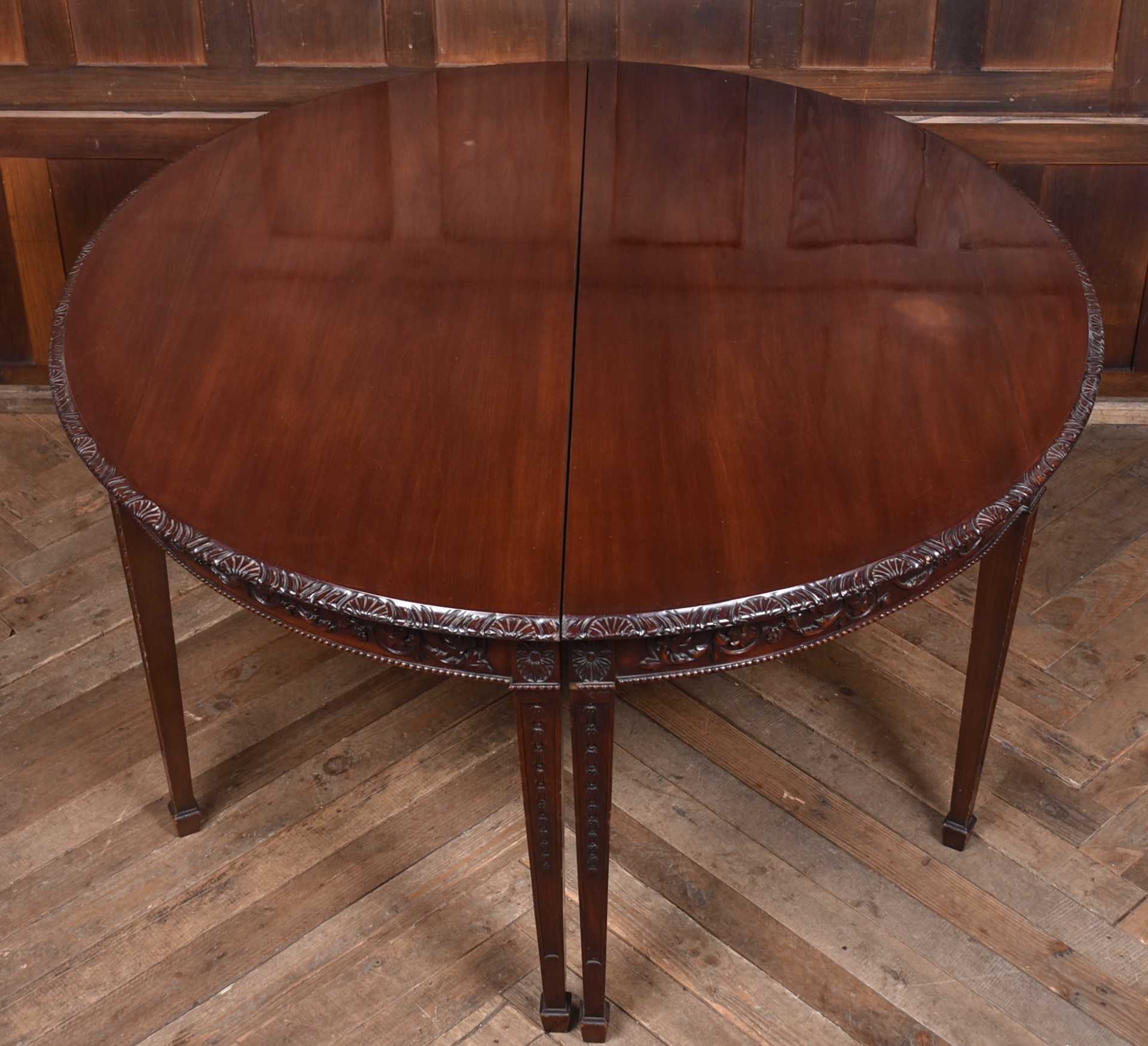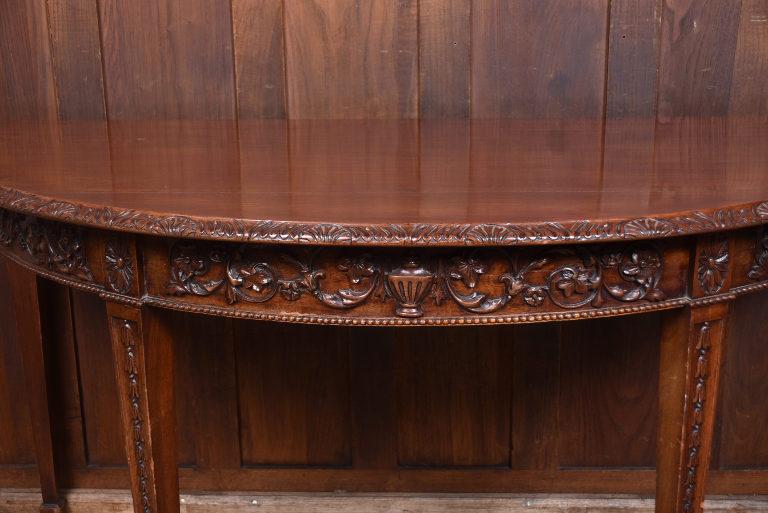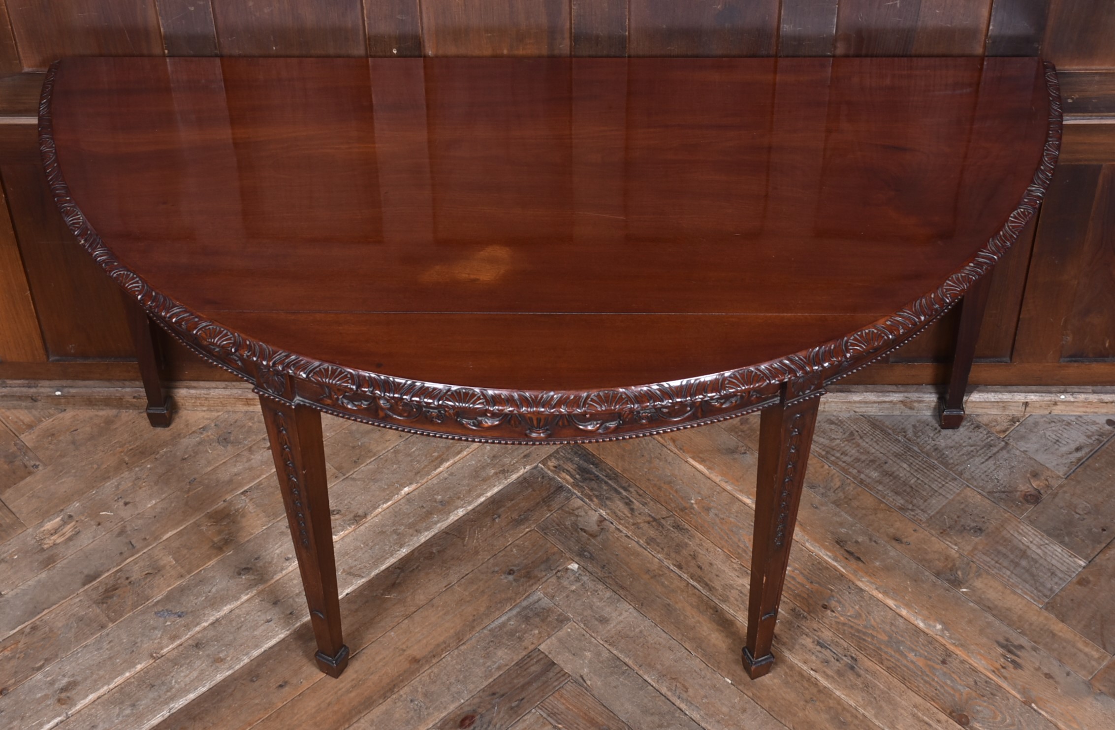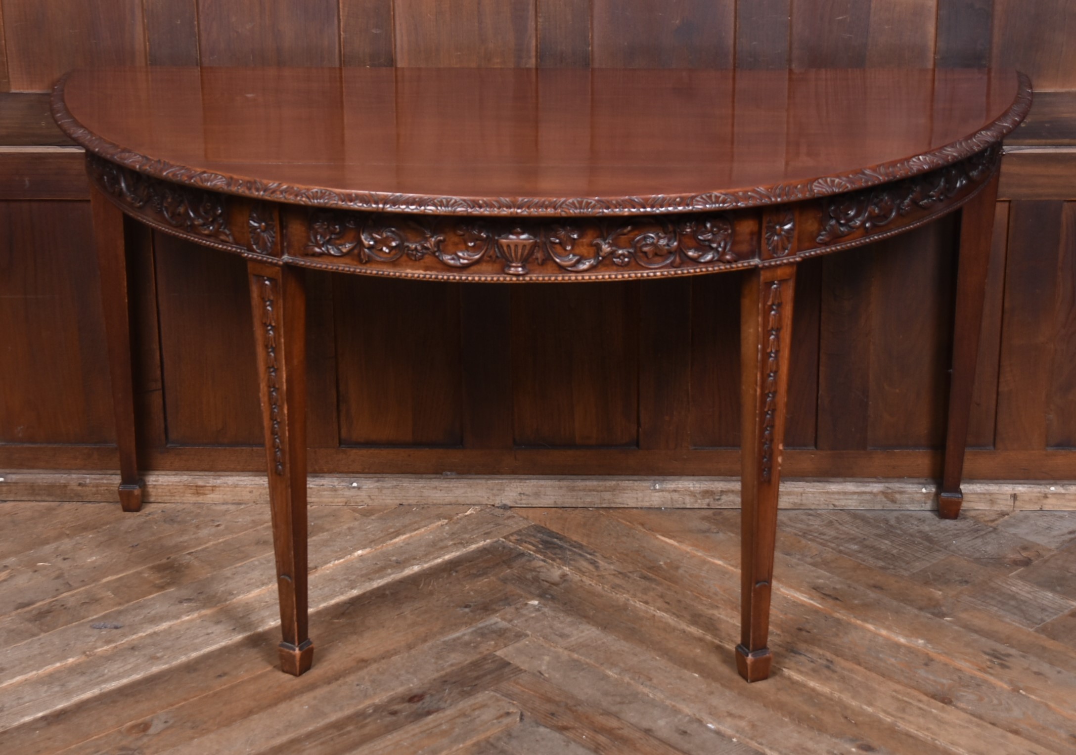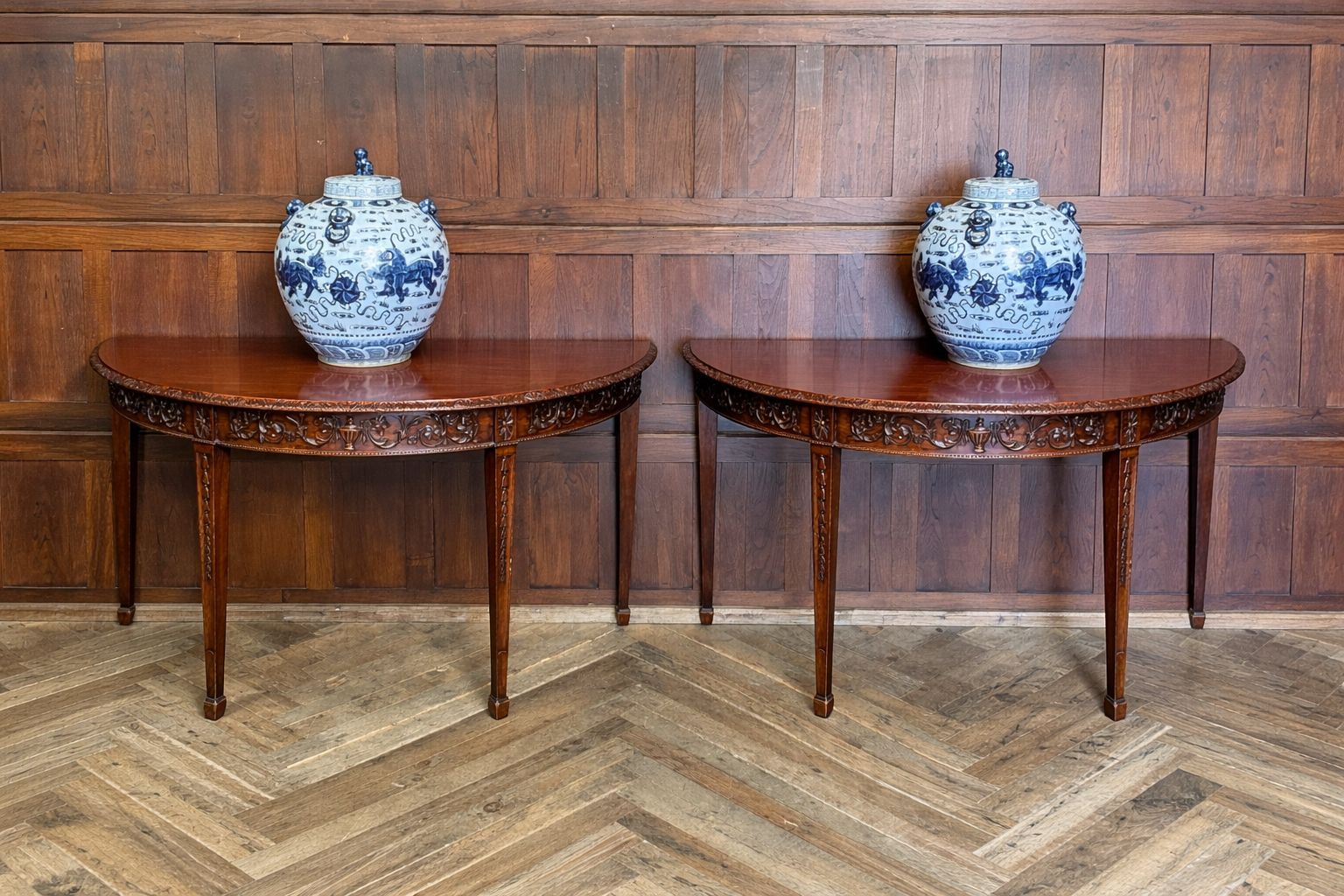 A beautifully matched pair of 19th‑century mahogany demi‑lune console tables, an increasingly scarce find in today’s market. Each table is crafted from richly toned mahogany with a warm, lustrous finish that accentuates the natural grain. The shaped apron is finely carved with scrolling foliate motifs. Standing on slender, tapering legs with carved detailing, the pair has a refined, balanced presence—ideal for framing an entrance hall, flanking a fireplace, or adding symmetry to any interior. Their scale and craftsmanship make them both practical and decorative, embodying the understated sophistication of late Georgian and early Victorian design. A rare opportunity to acquire a true pair, preserved in excellent condition and ready to place.