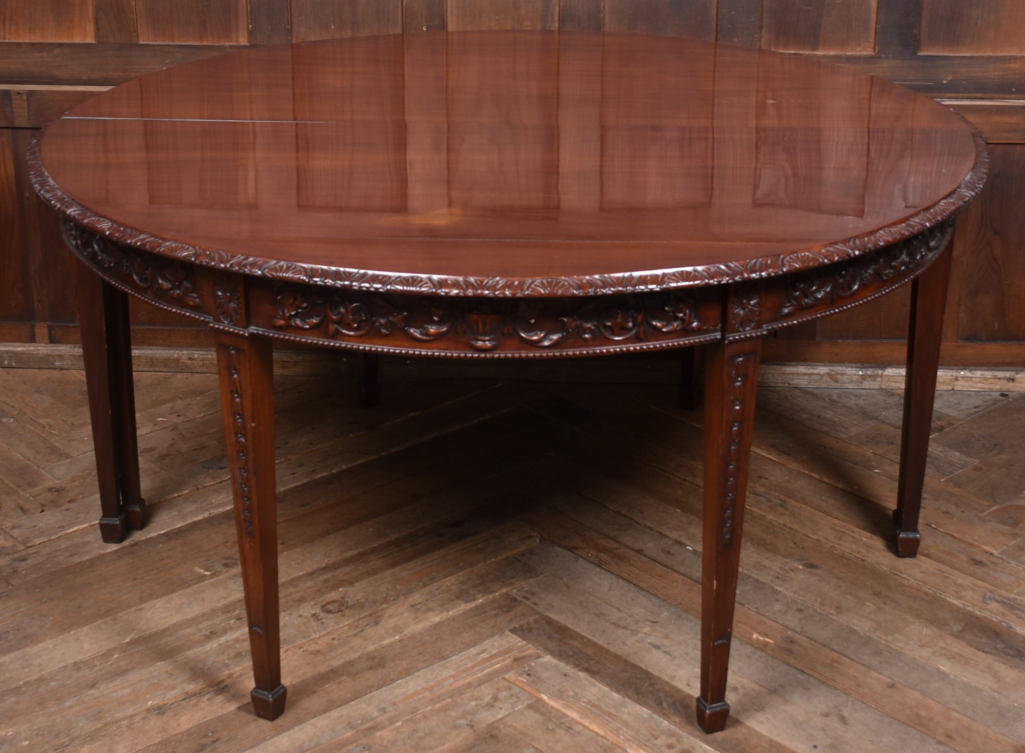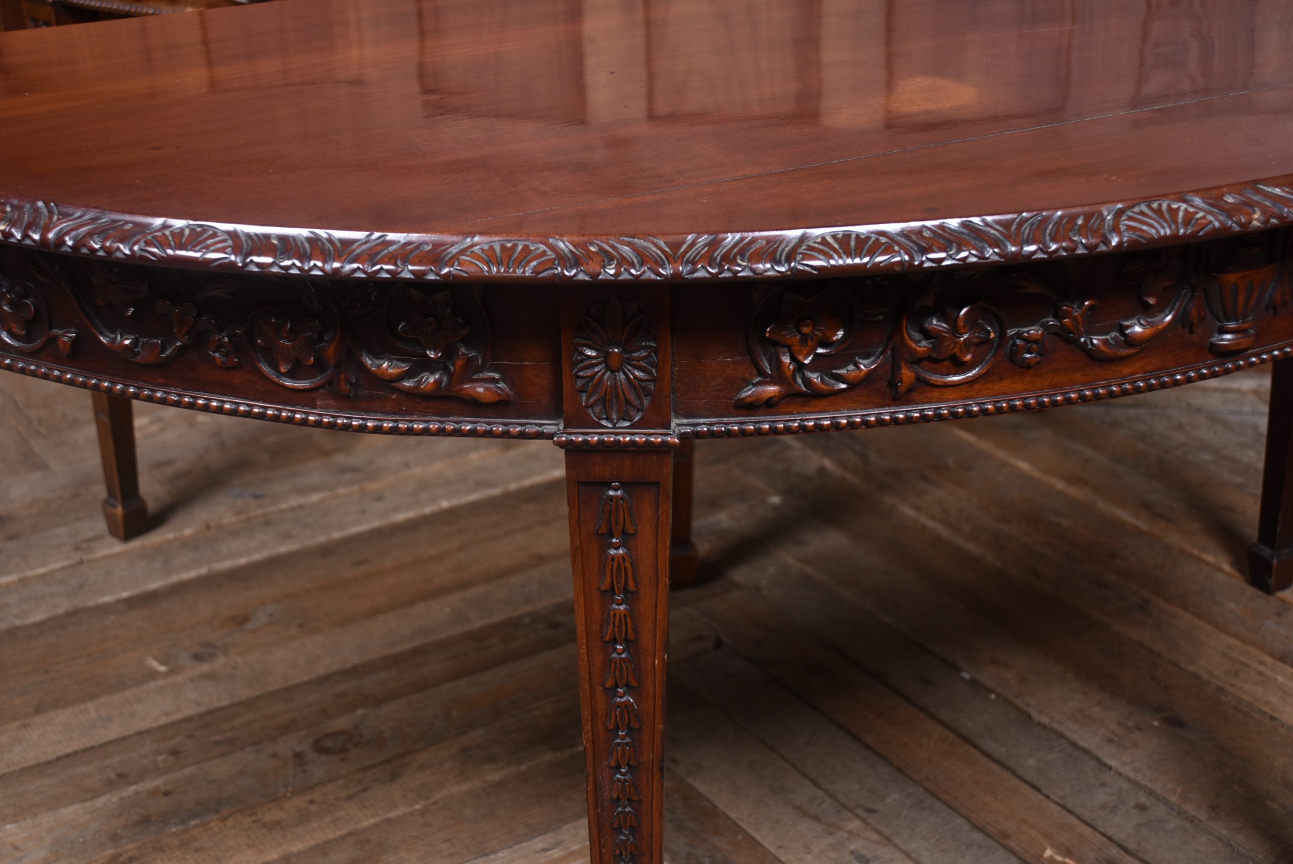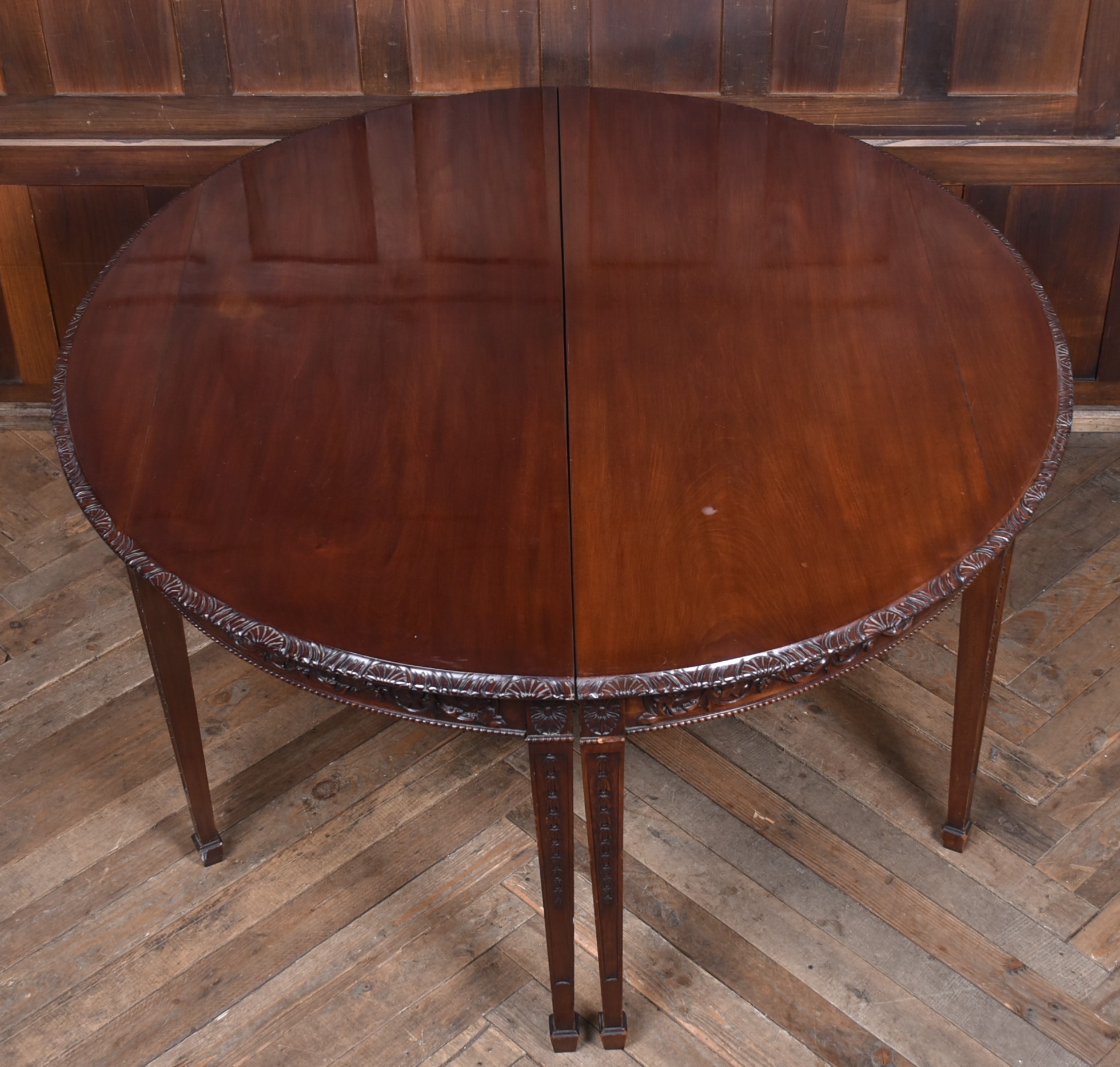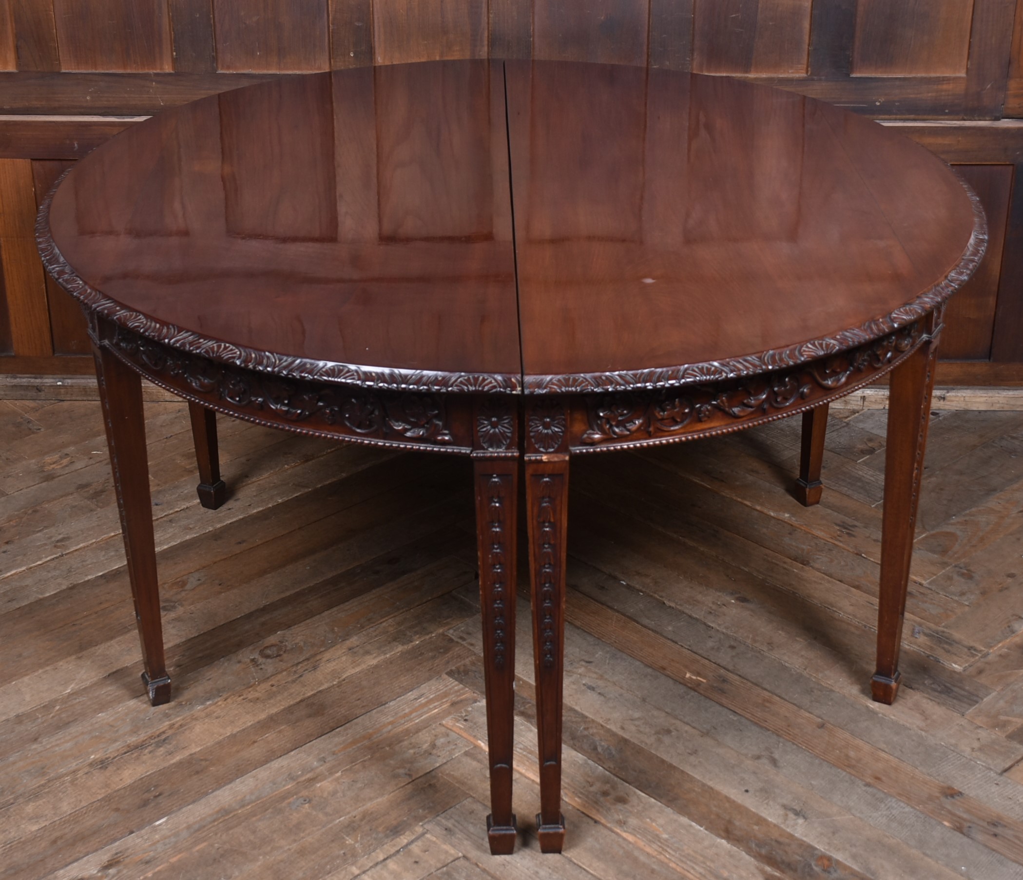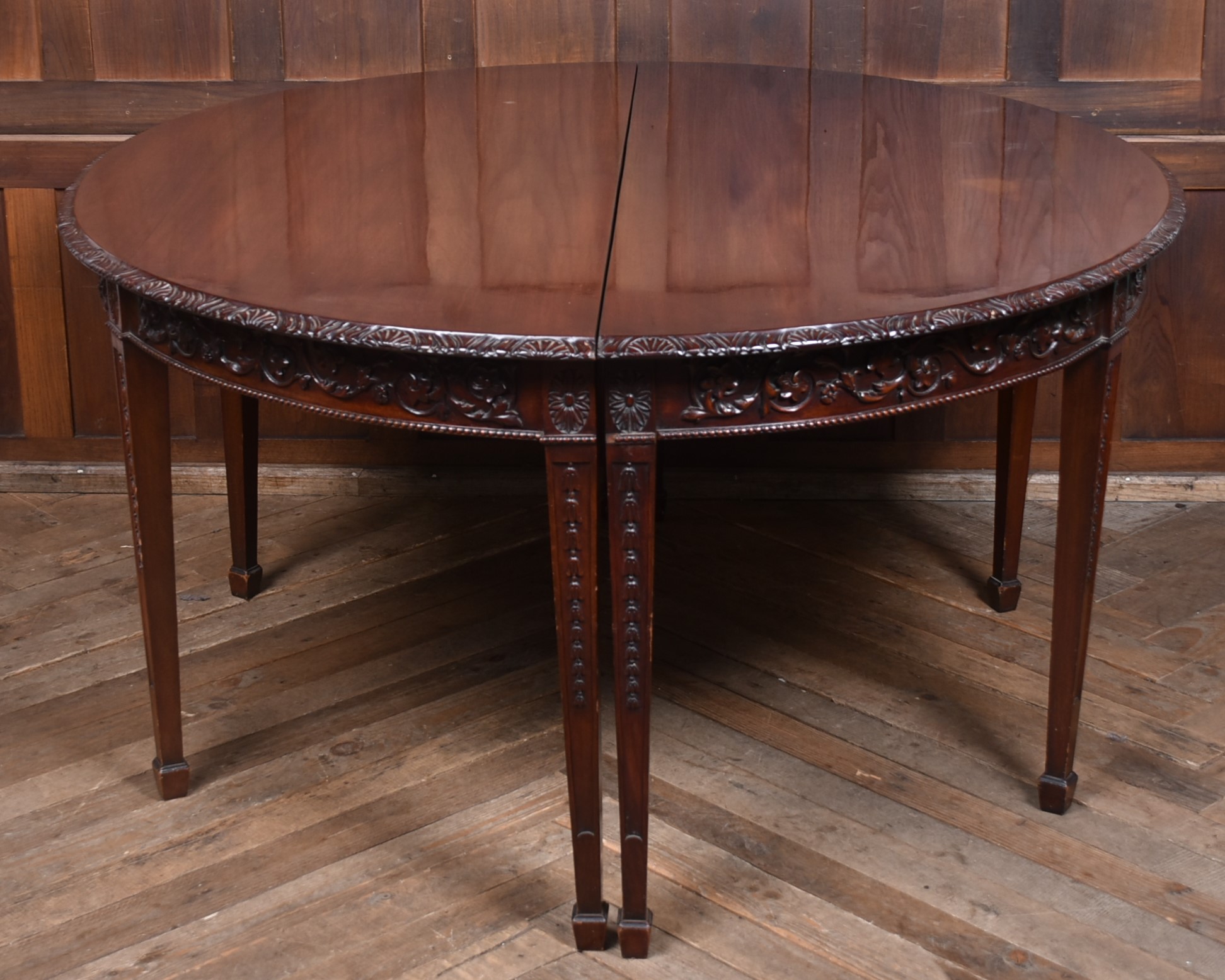 A beautifully matched pair of 19th‑century mahogany demi‑lune console tables, an increasingly scarce find in today’s market. Each table is crafted from richly toned mahogany with a warm, lustrous finish that accentuates the natural grain. The shaped apron is finely carved with scrolling foliate motifs. Standing on slender, tapering legs with carved detailing, the pair has a refined, balanced presence—ideal for framing an entrance hall, flanking a fireplace, or adding symmetry to any interior. Their scale and craftsmanship make them both practical and decorative, embodying the understated sophistication of late Georgian and early Victorian design. A rare opportunity to acquire a true pair, preserved in excellent condition and ready to place.
