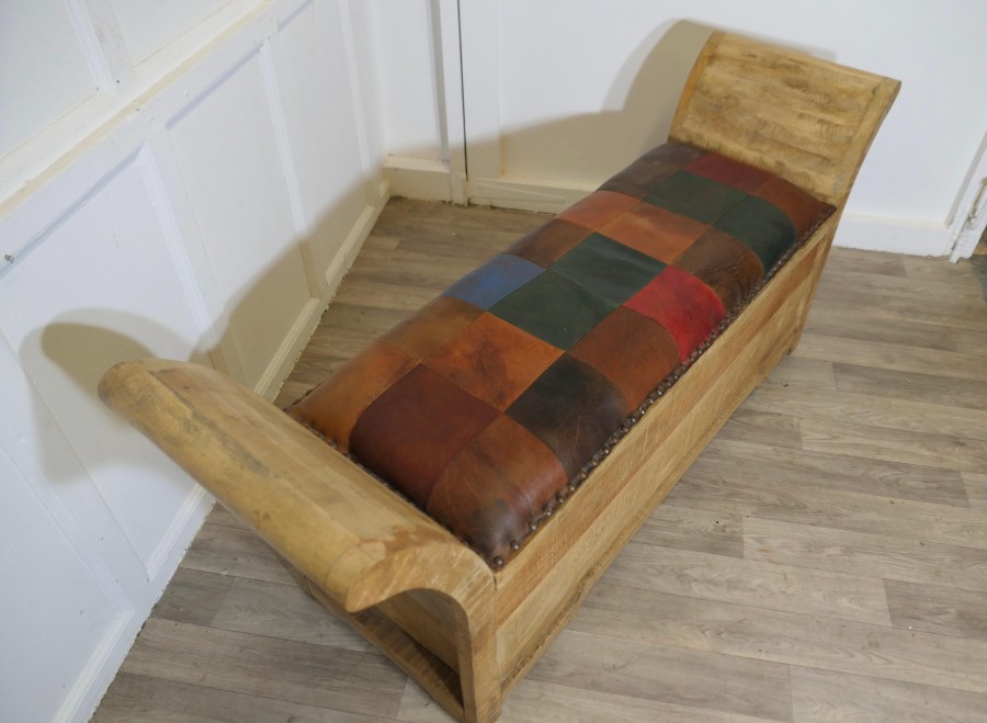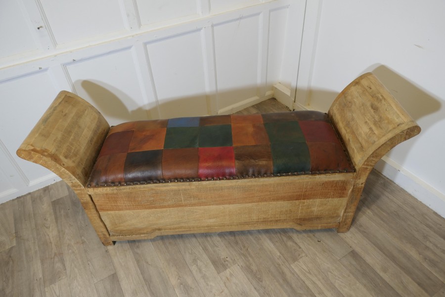 Pine and Leather Hall Seat, Storage Sleigh Bench This is a great piece for a hall way where storage space may be difficult, the bench is made with outward sweeping armrests and has soft leather patchwork upholstery This very stylish piece has lots of useful storage for shoes etc. inside the seat in good vintage condition The bench is 25” high at the sides 58” wide, 17” deep and the seat height is 19” ZX326 Manufacture Date : 1960 Materials : , Oak