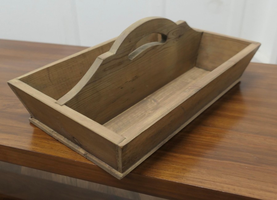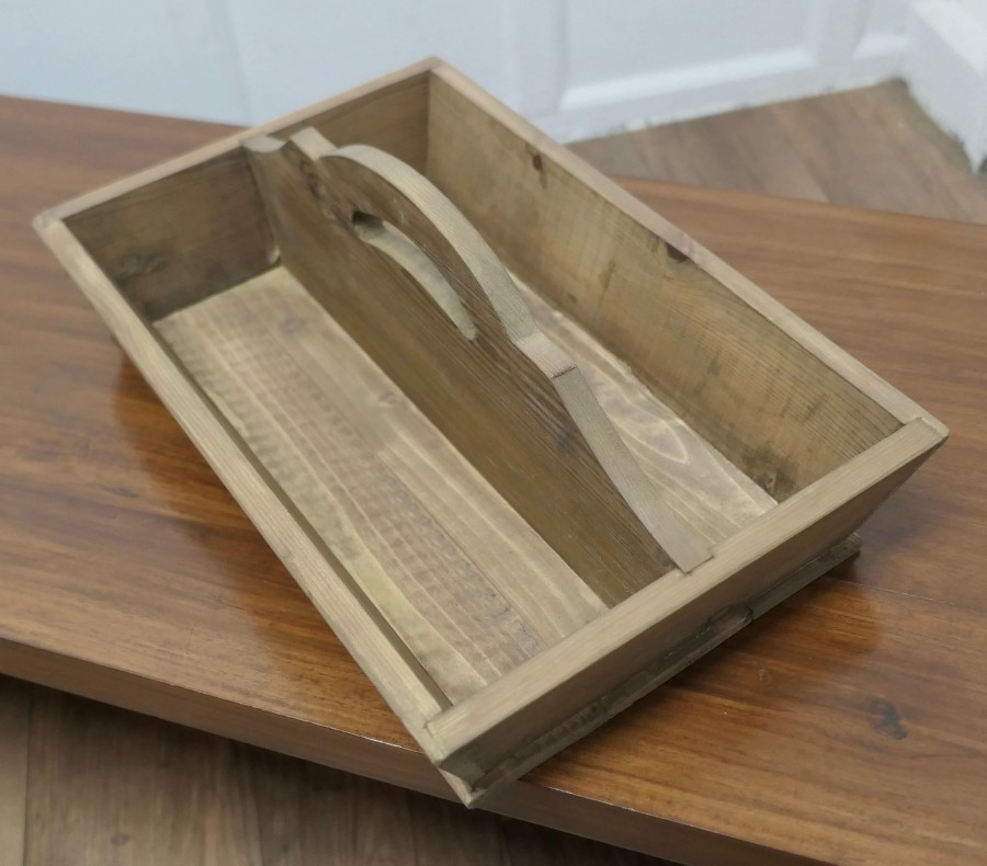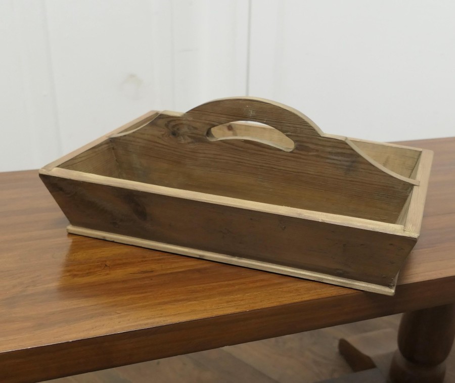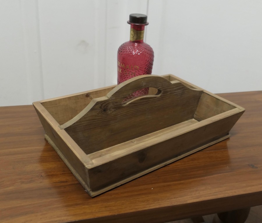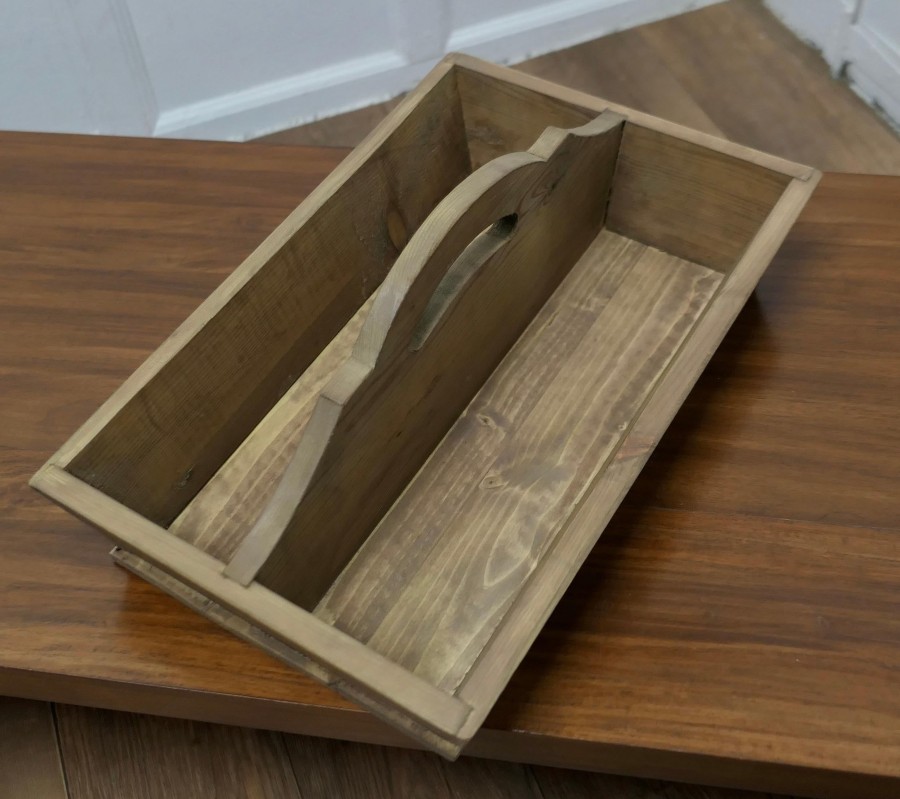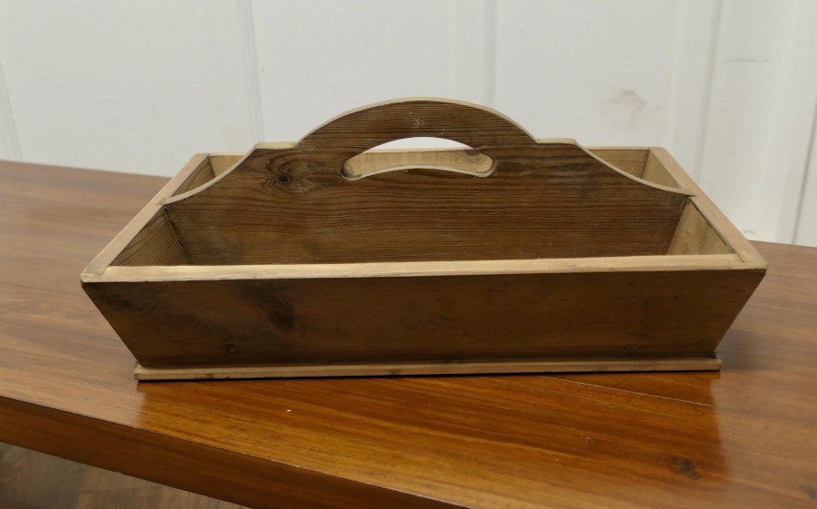 Pine Cutlery Tray or Housemaids Carrier, Tidy The Carrier has 2 compartments and a central divider that has a cut out carrying handle. This Cutlery tray can could also be used for any number of purposes – sewing box, spice box, condiments etc. SC54 Manufacture Date : 1960 Materials : Pine