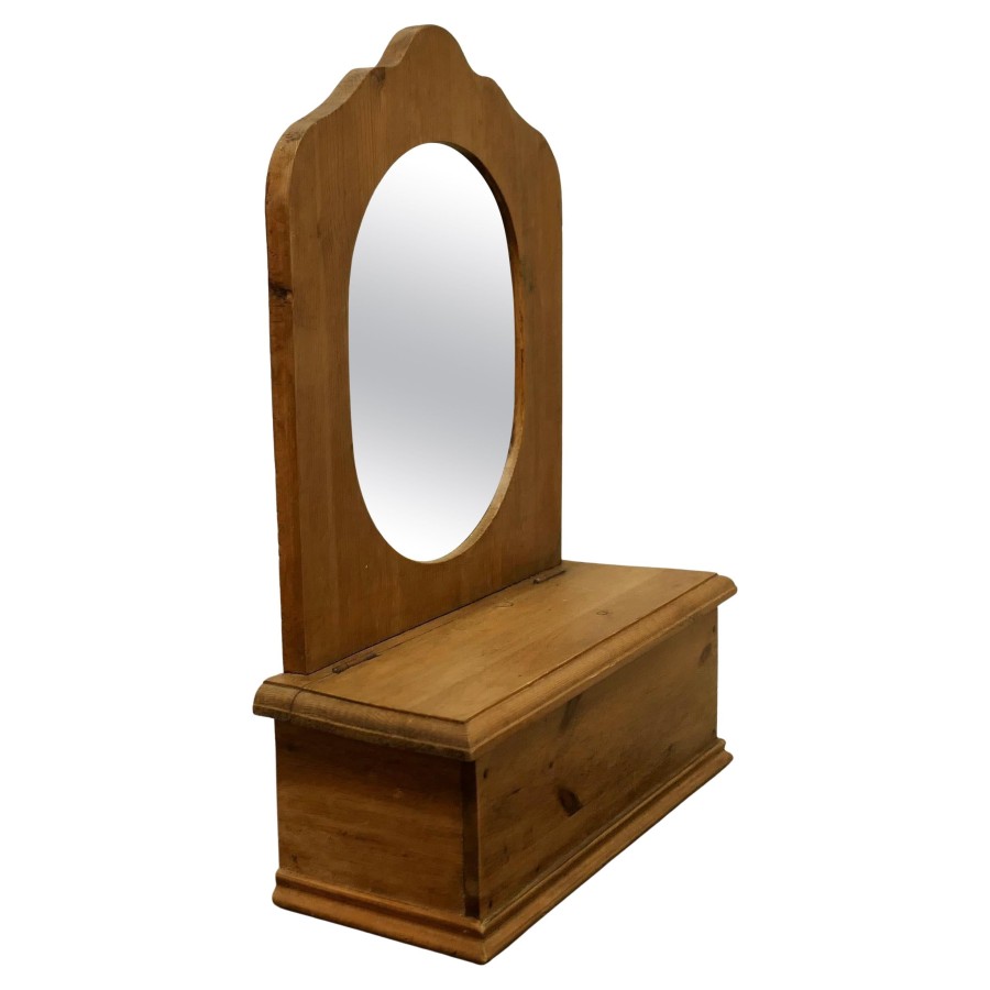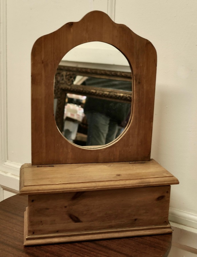 Pine toilet or vanity mirror The mirror back has as scallop shape surrounding and Oval glass Beneath there is a useful compartment with a lifting lid The mirror is 14” wide and 6” deep, it is 20”high THM166. Manufacture Date : 1900 Materials : Pine