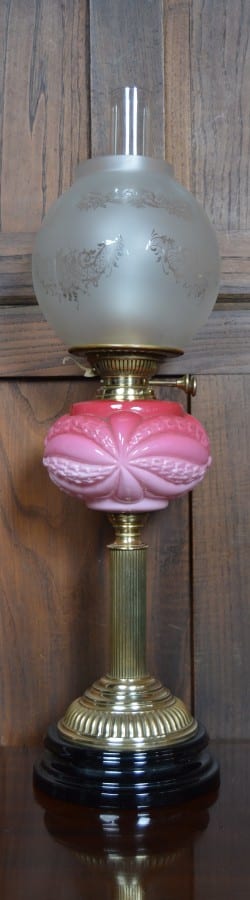 Beautiful Victorian brass oil / paraffin lamp with attractive reeded brass column and circular black base. This lamp has a frosted globe shade with etched floral detail, clear funnel and a two tone pink glass reservoir. Its burner section has twin adjusters stamped Youngs Screw Fitting. This is still fully functional and in great condition and will light up any room.