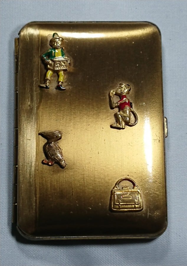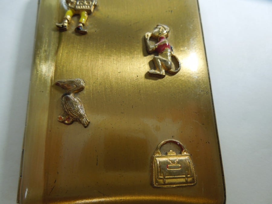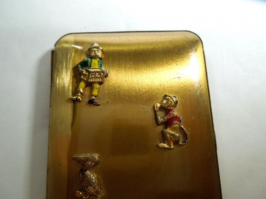 Quirky Powder Compact by Foster, USA with individual figures of a moustached man playing a music box, a monkey holding something to his mouth, a pelican and a travel case set onto the cover.