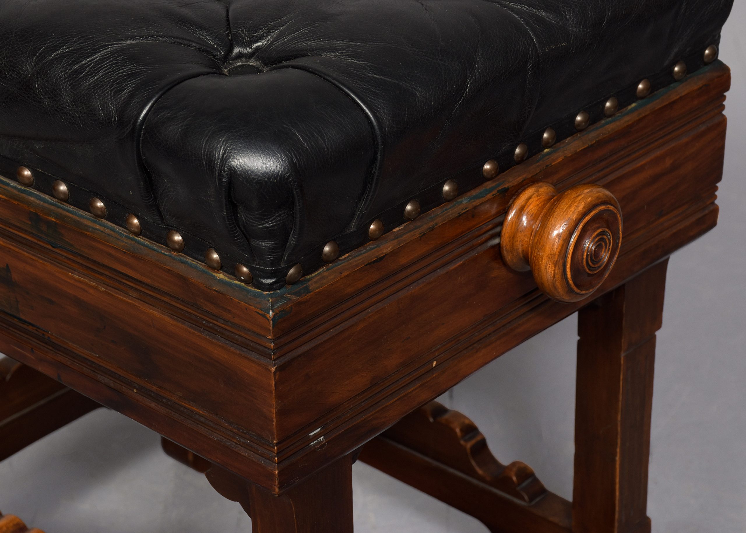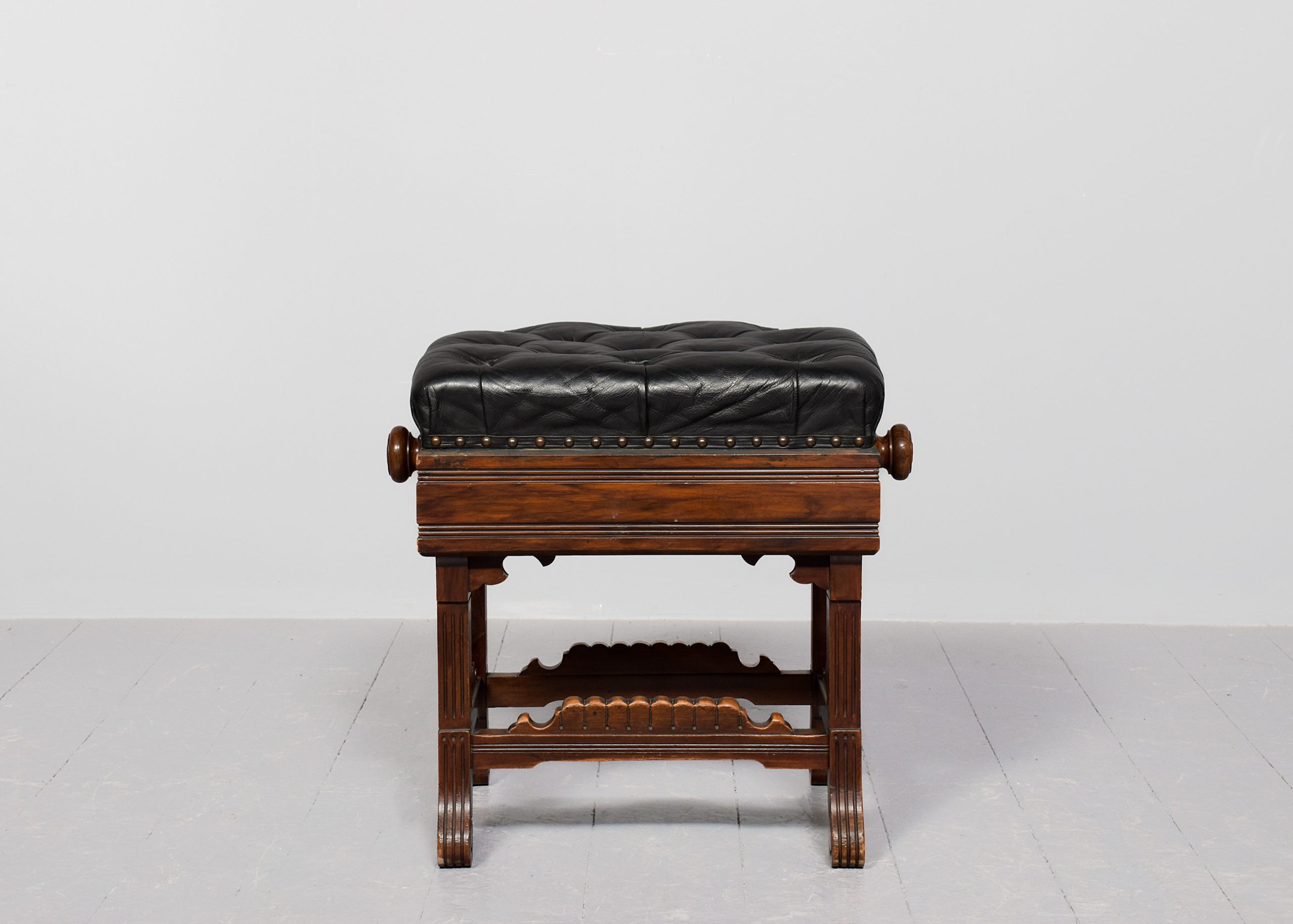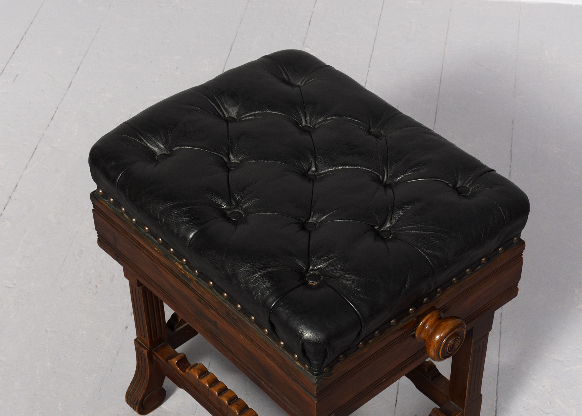 Circa 1880. A late Victorian Rosewood and leather upholstered professional adjustable piano stool, the rectangular top in pleated and deep buttoned black leather with studding to the sides. The deep frieze with ribbing to the top and bottom, the ends with a pair of large turned knob handles for adjusting the height, the underside with patented metal mechanism, resting on four square legs with ribbing on the facings, braced by unusual stylish stretchers with a raised section, finishing on ribbed curled feet, the stool is in excellent condition and working order.