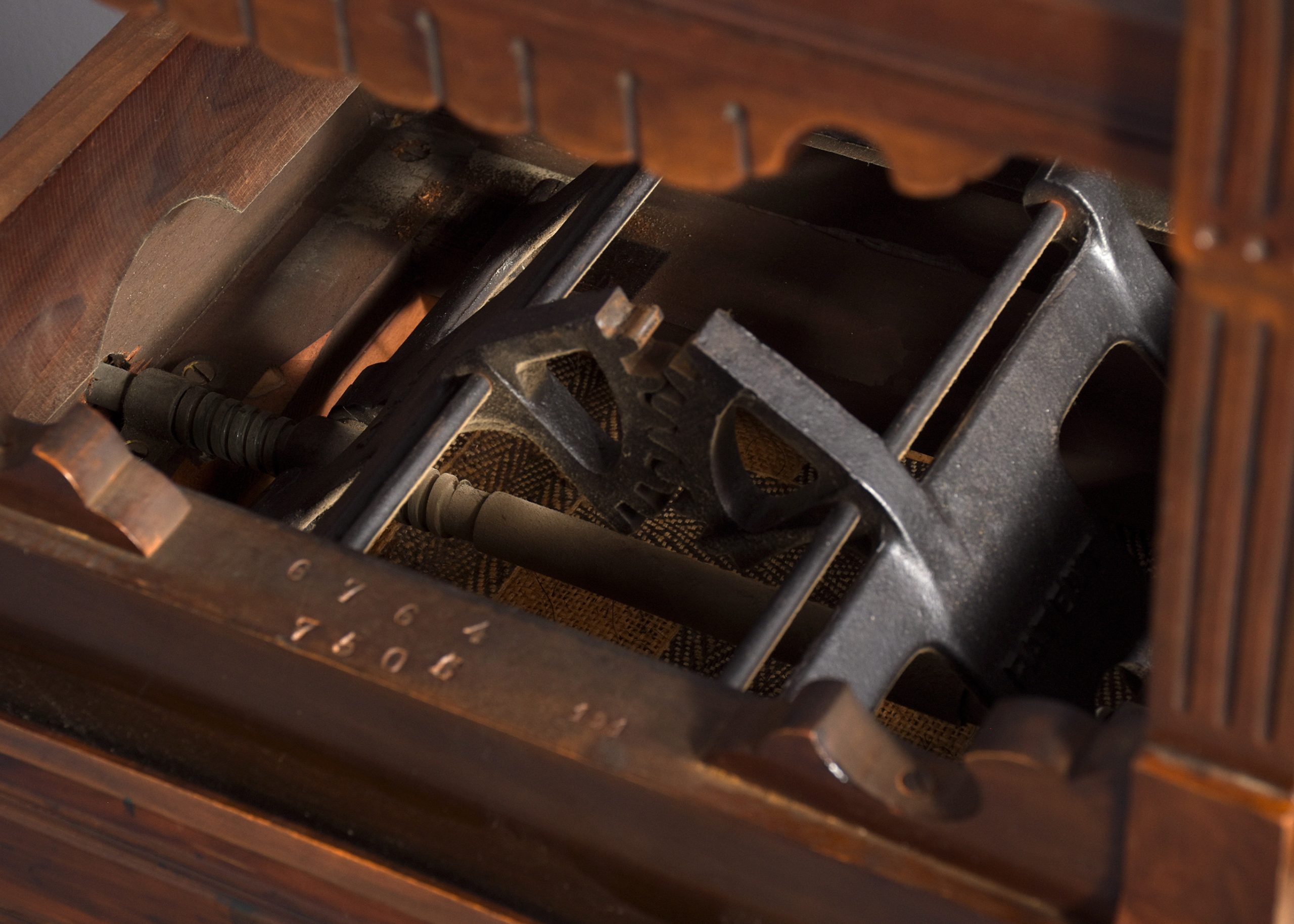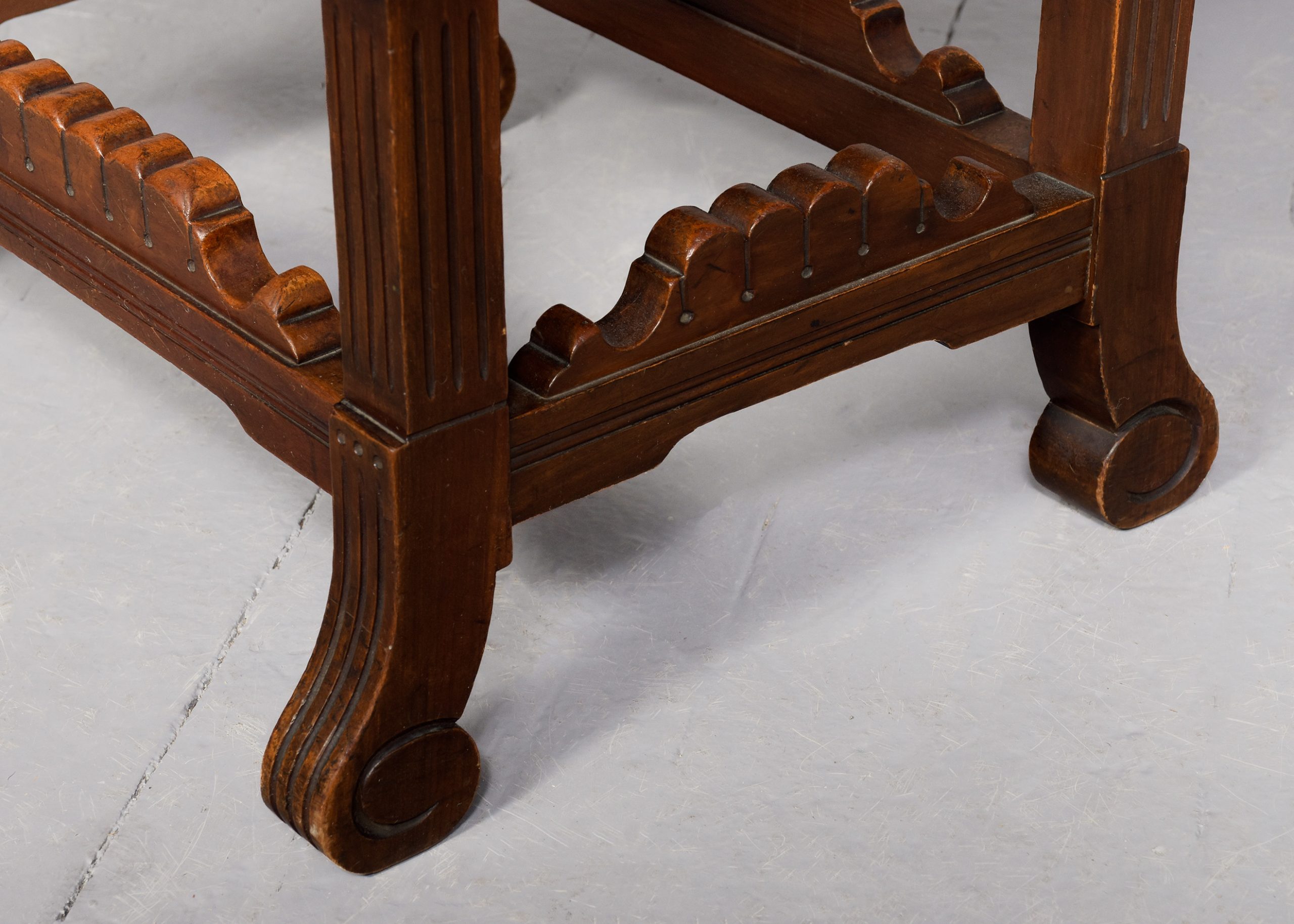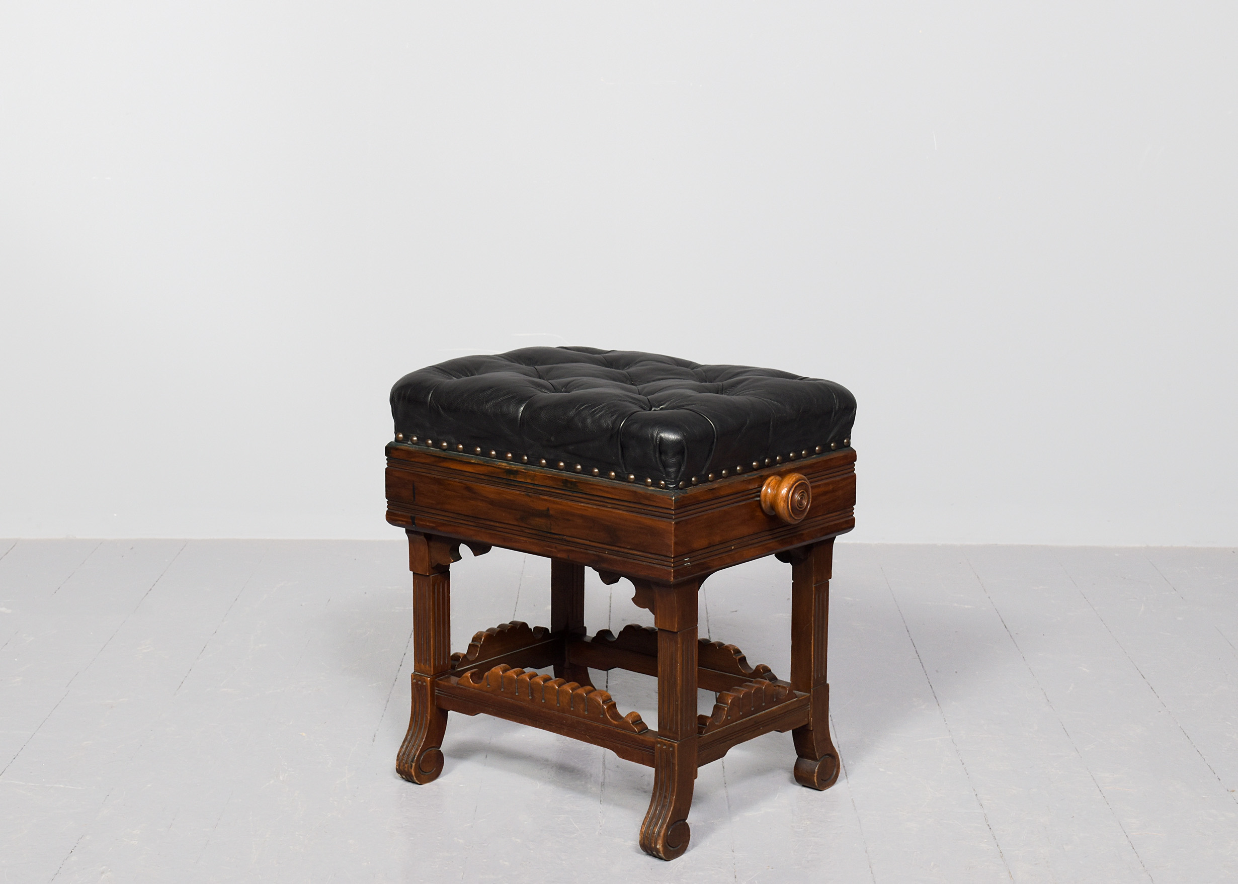 Circa 1880. A late Victorian Rosewood and leather upholstered professional adjustable piano stool, the rectangular top in pleated and deep buttoned black leather with studding to the sides. The deep frieze with ribbing to the top and bottom, the ends with a pair of large turned knob handles for adjusting the height, the underside with patented metal mechanism, resting on four square legs with ribbing on the facings, braced by unusual stylish stretchers with a raised section, finishing on ribbed curled feet, the stool is in excellent condition and working order.