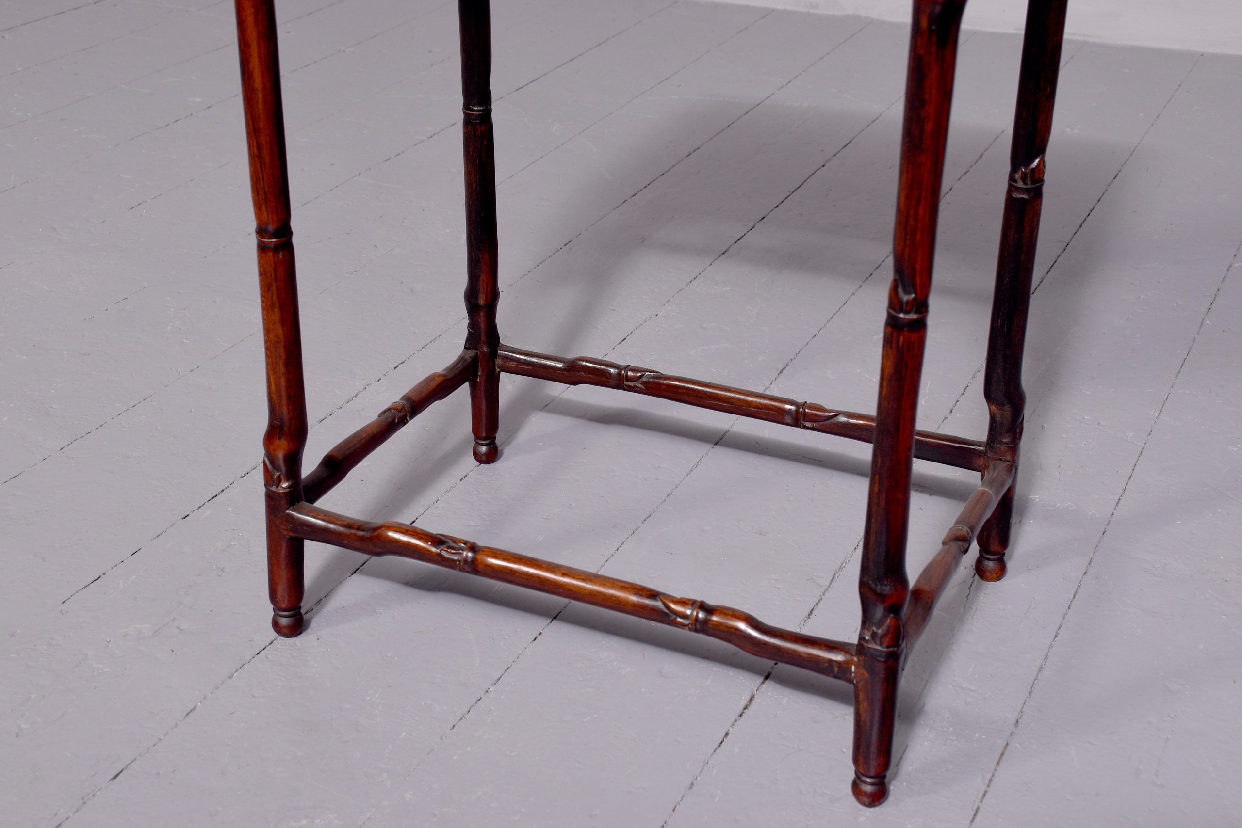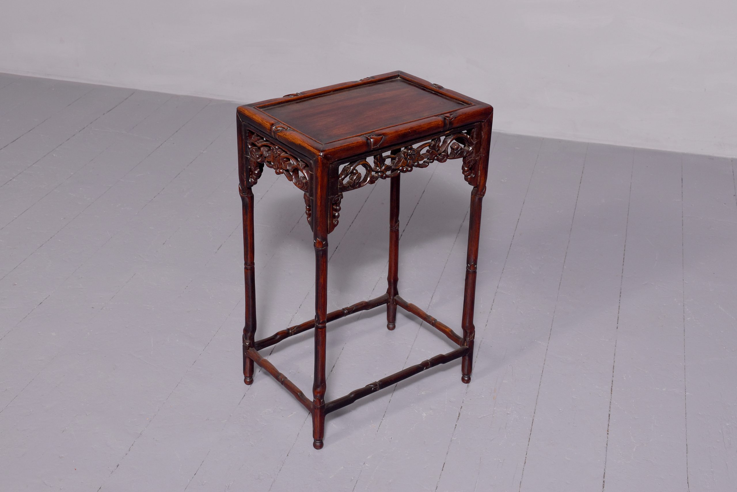 Qing period neat-sized Chinese carved Hongmu occasional table. The rectangular top with a beaded central panel and with foliate carved moulded edges above a frieze with open fret carving of vines and foliage. All supported on 4 faux bamboo legs with faux bamboo peripheral stretchers, lovely colour and patina