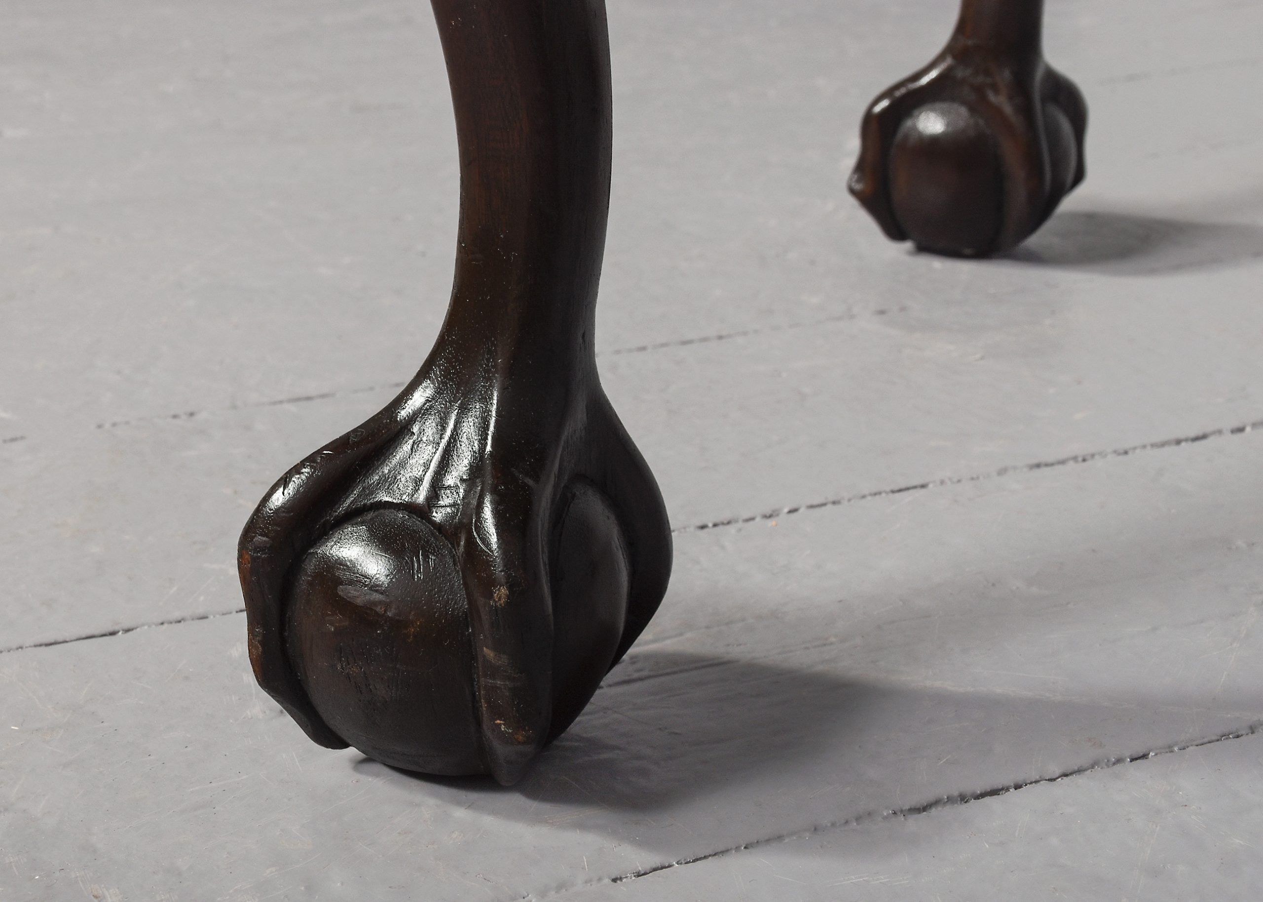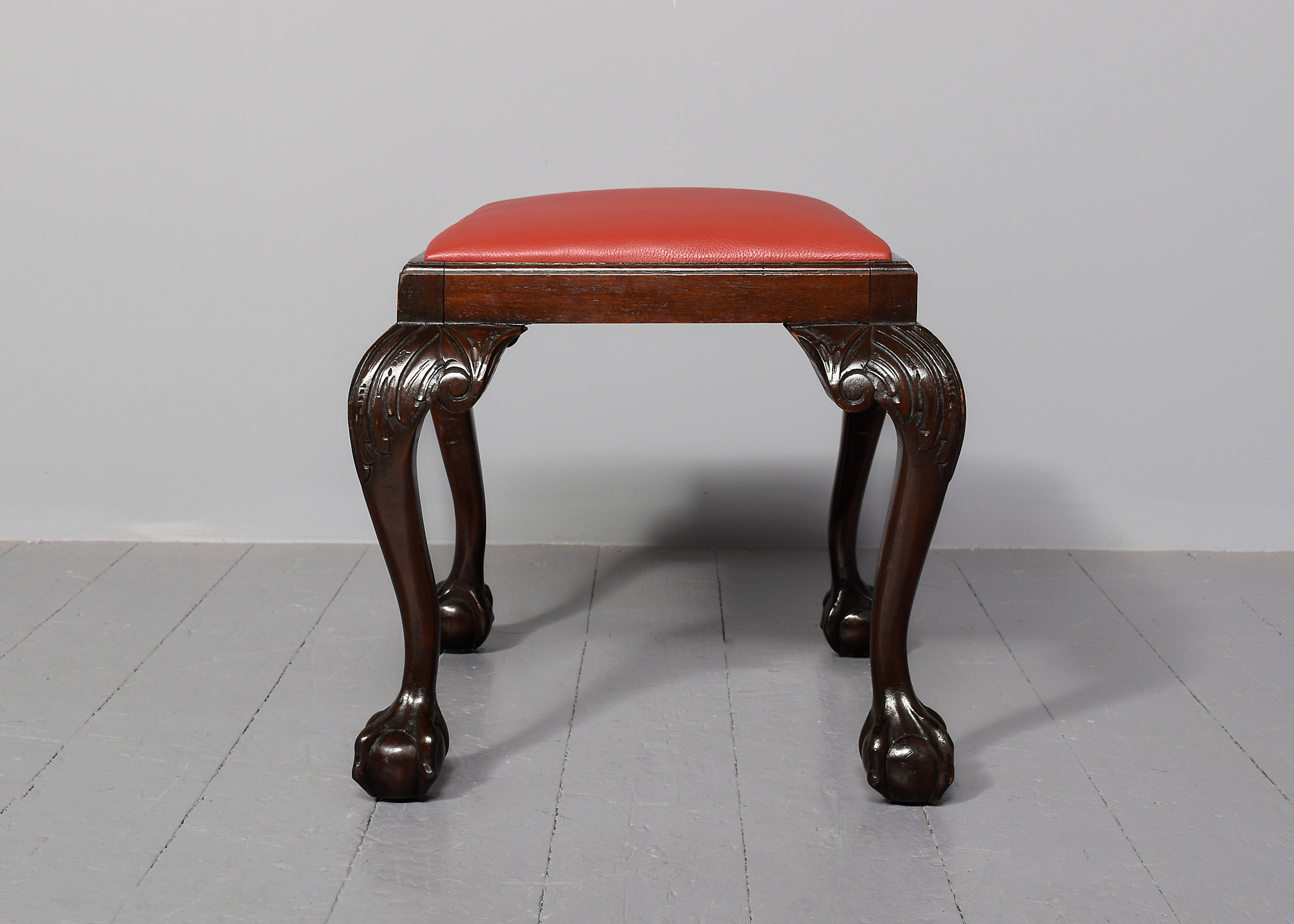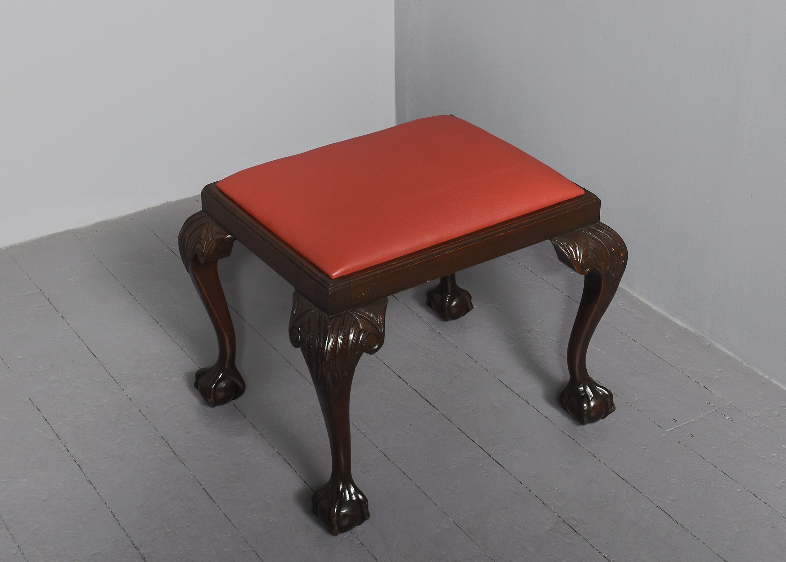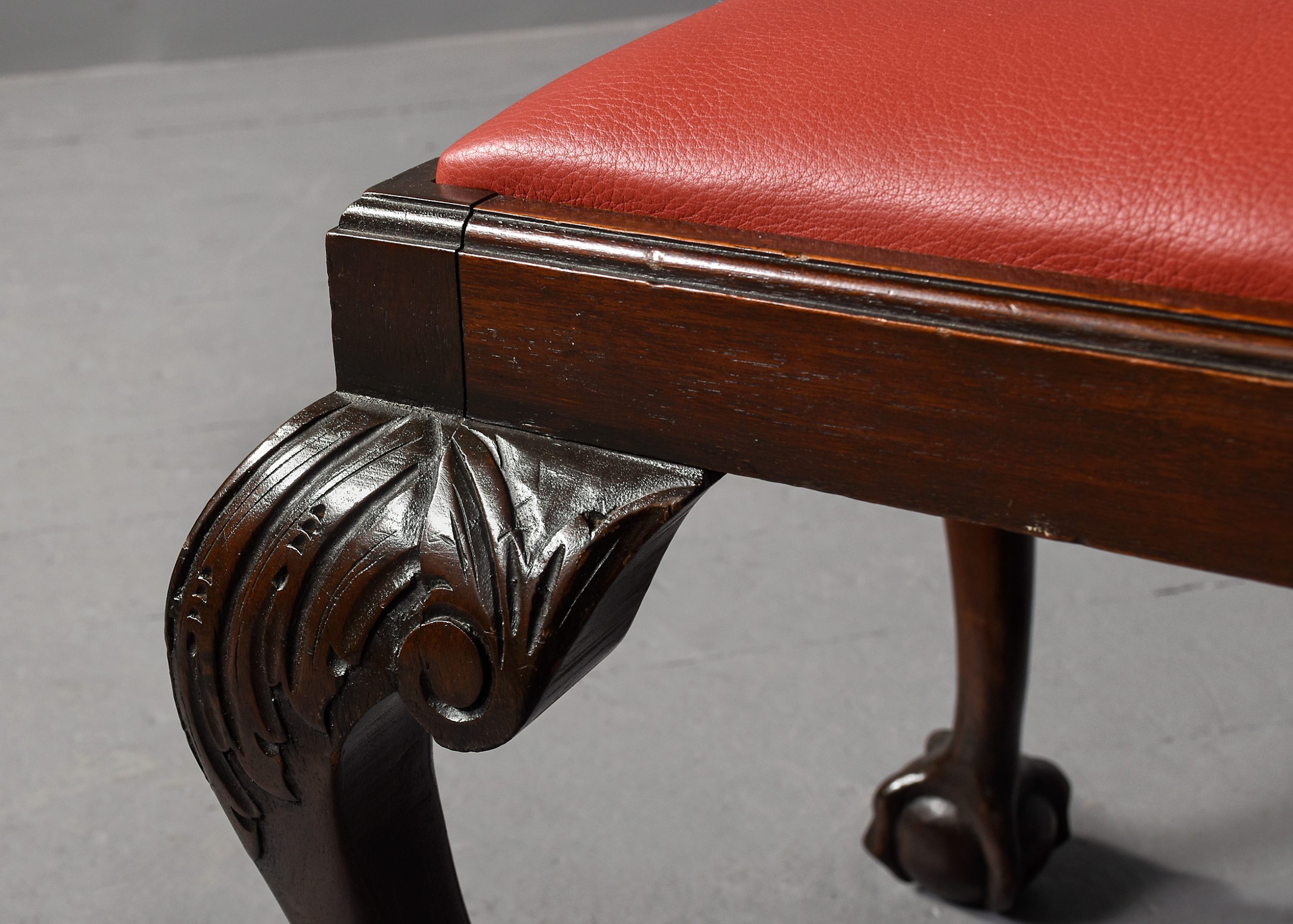 Circa 1890. Quality 19th century Georgian-style carved mahogany cabriole leg stool. The lift-out seat recently reupholstered in quality burgundy hide, within a simple seat rail and supported on bold cabriole legs with acanthus carved knees and ball and claw feet.