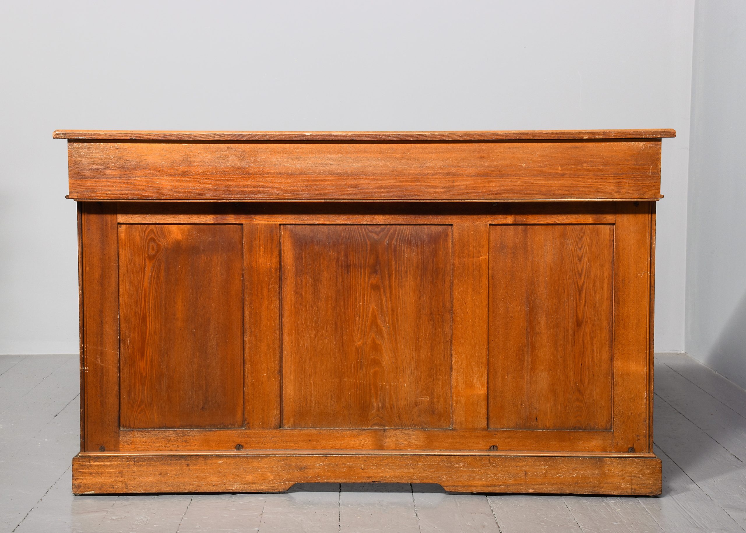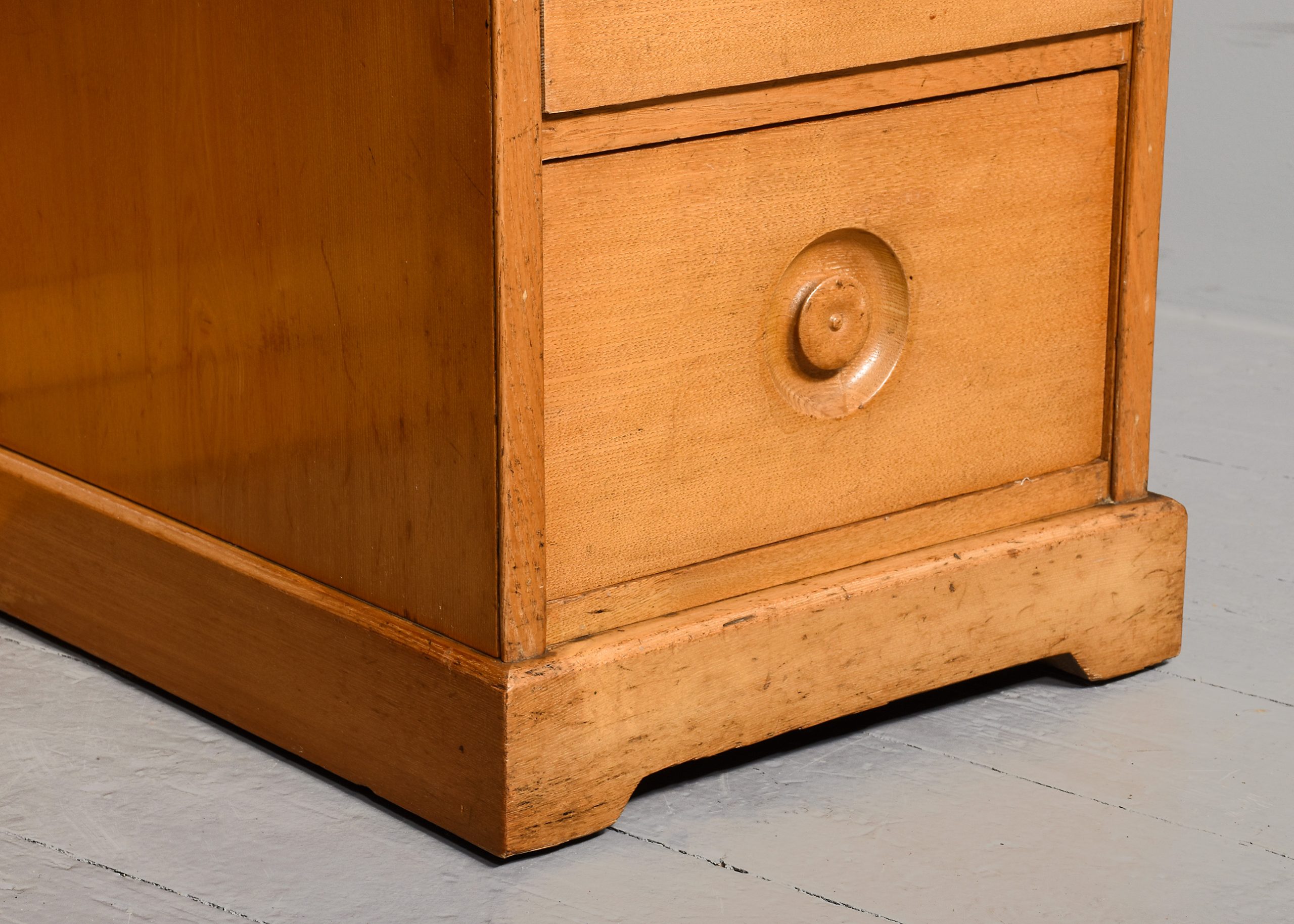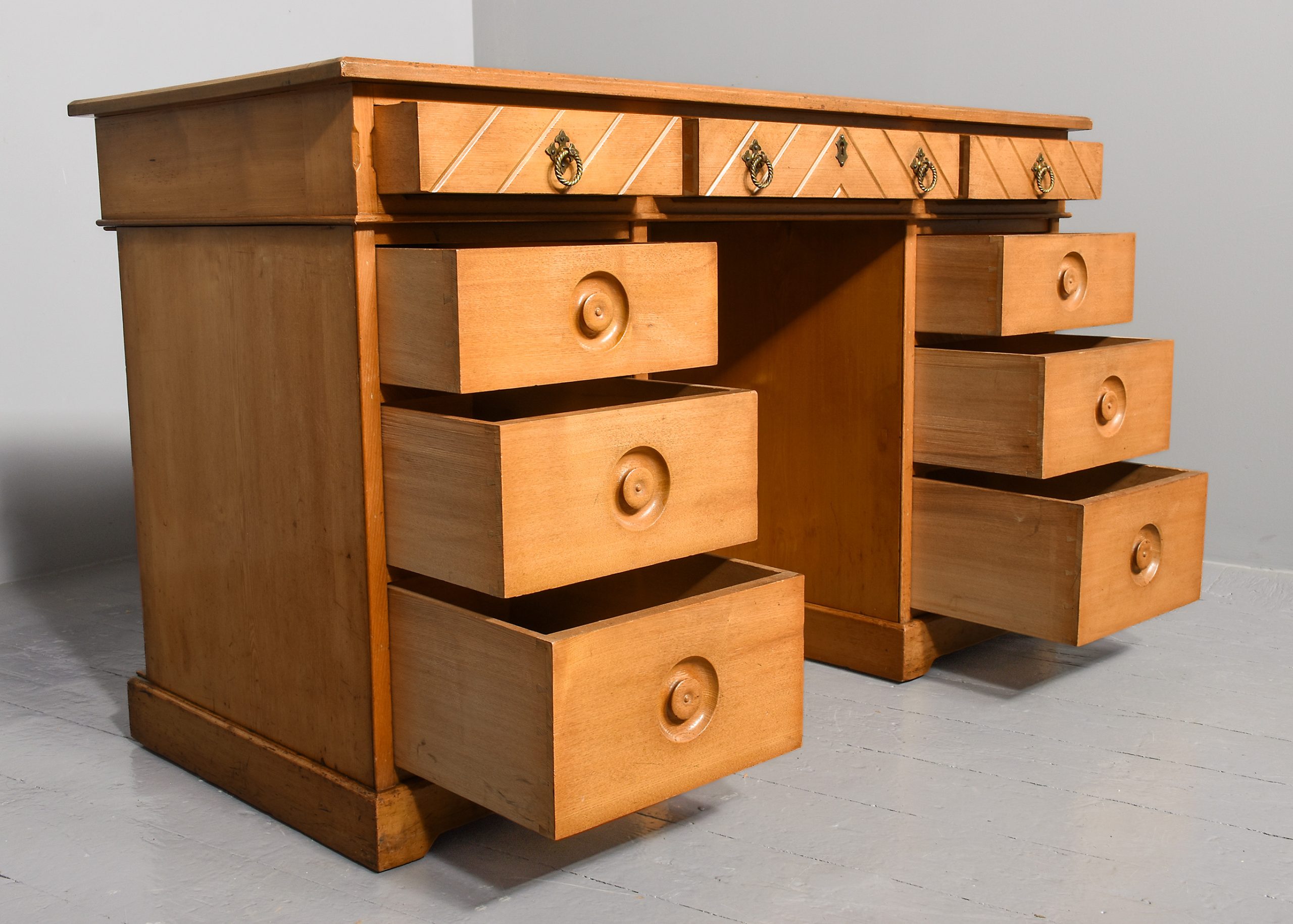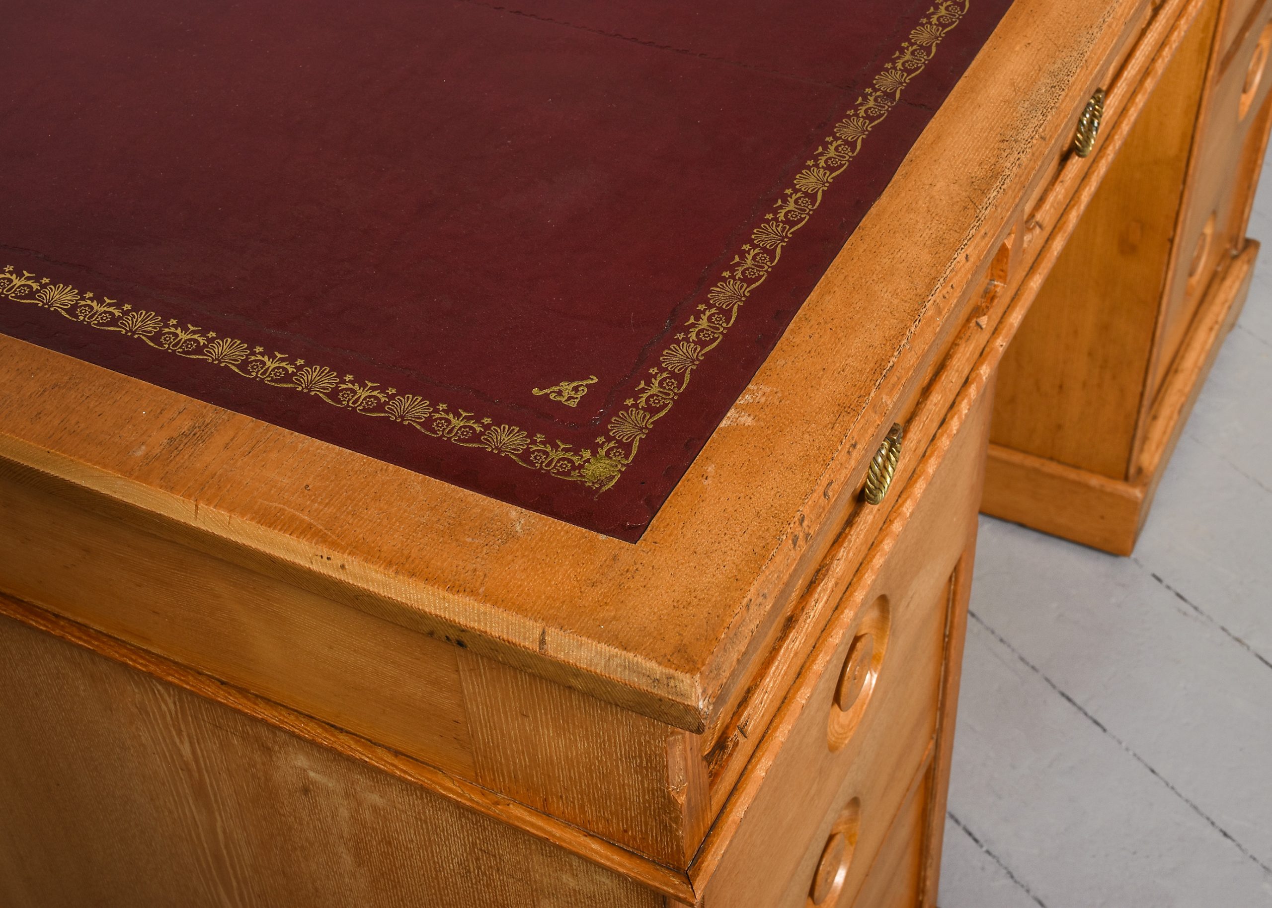 Circa 1880. Quality ash Arts and Crafts style knee hole writing desk in the manner of Charles Bevan. The rectangular top with gilt-tooled burgundy leather writing surface above three frieze drawers with Arts and Crafts diagonal grooving and original gilded brass handles, supported on two banks of graduated drawers with unusual inset turned handles, and drawer linings in solid ash (sign of quality Scottish cabinetmaking). In excellent condition.