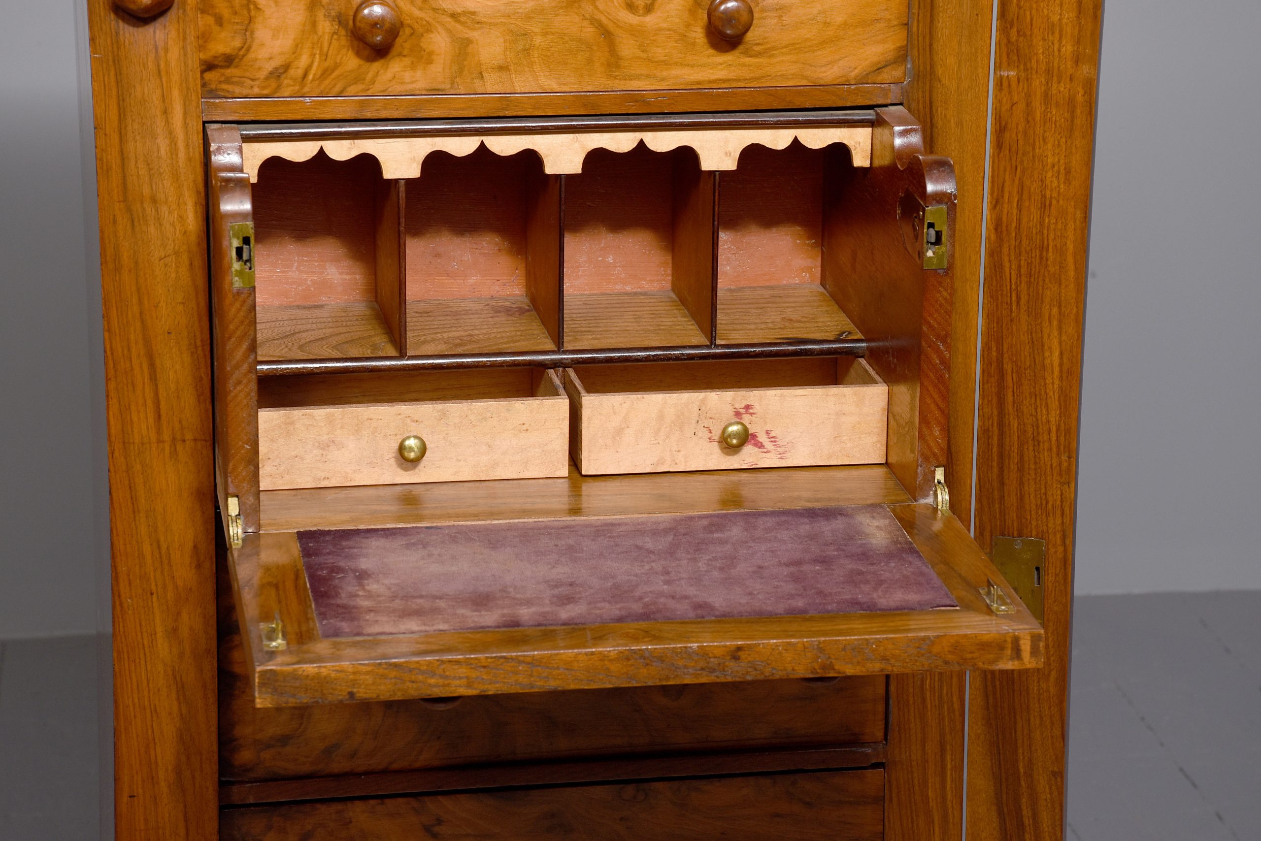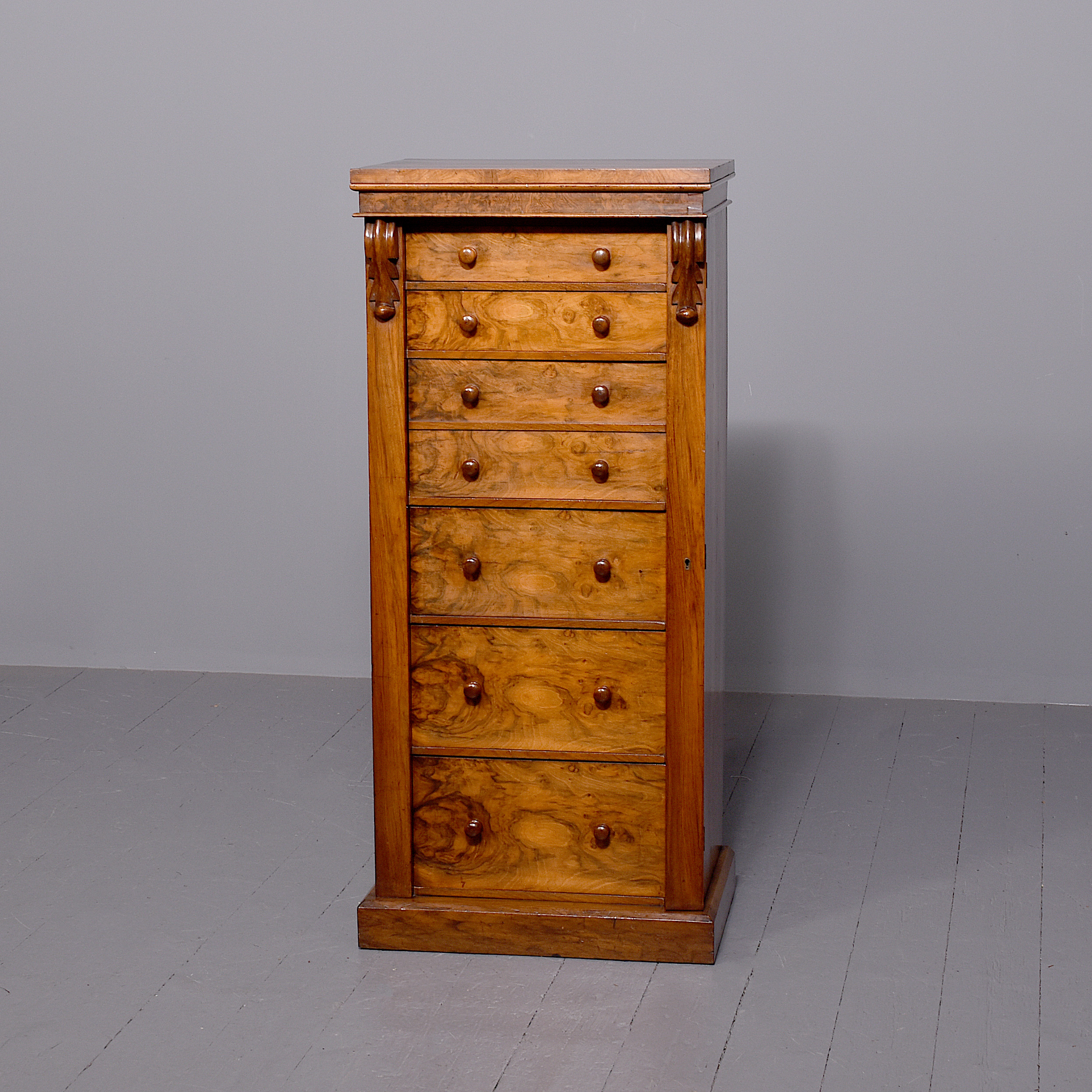 Circa 1860. Quality mid-Victorian figured walnut Wellington secretaire chest. Surmounted by a polished top in highly figured walnut with a simple fore-edge and beaded frieze. With a locking pilaster on the right-hand side above seven graduated drawer fronts, the third and fourth drawer front dropping down to reveal a fitted secretaire interior with satinwood drawers and pigeon holes. All sitting on an enclosed plinth base. Lovely colour and patina and in excellent condition.