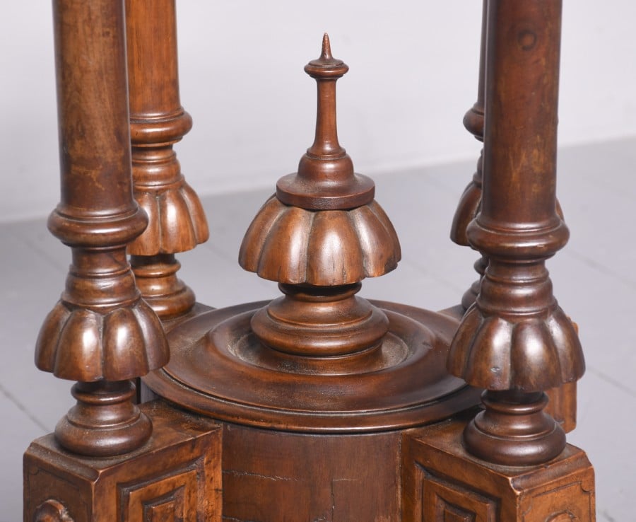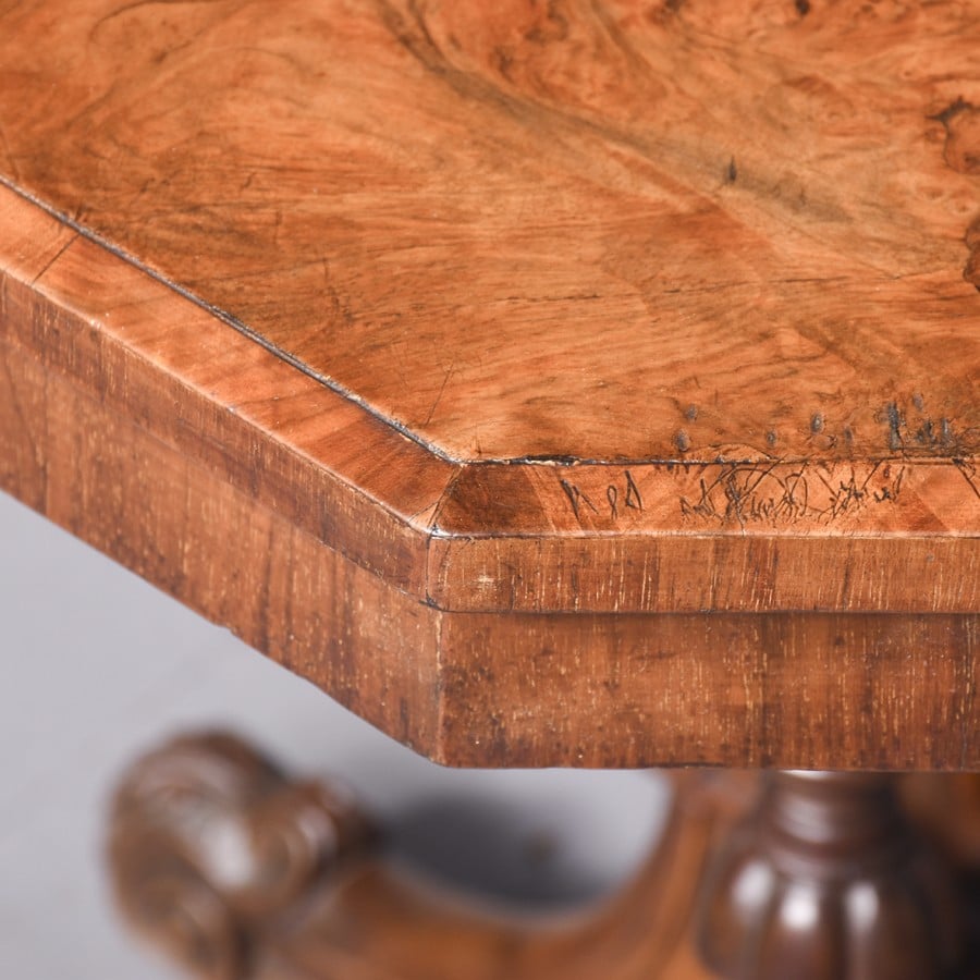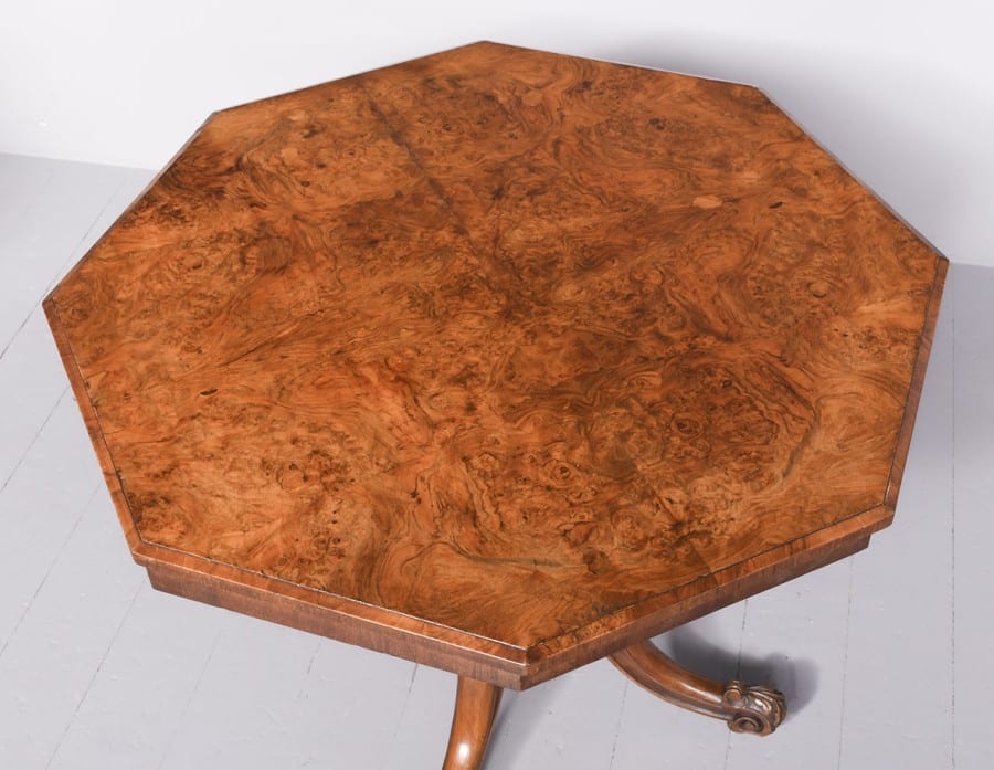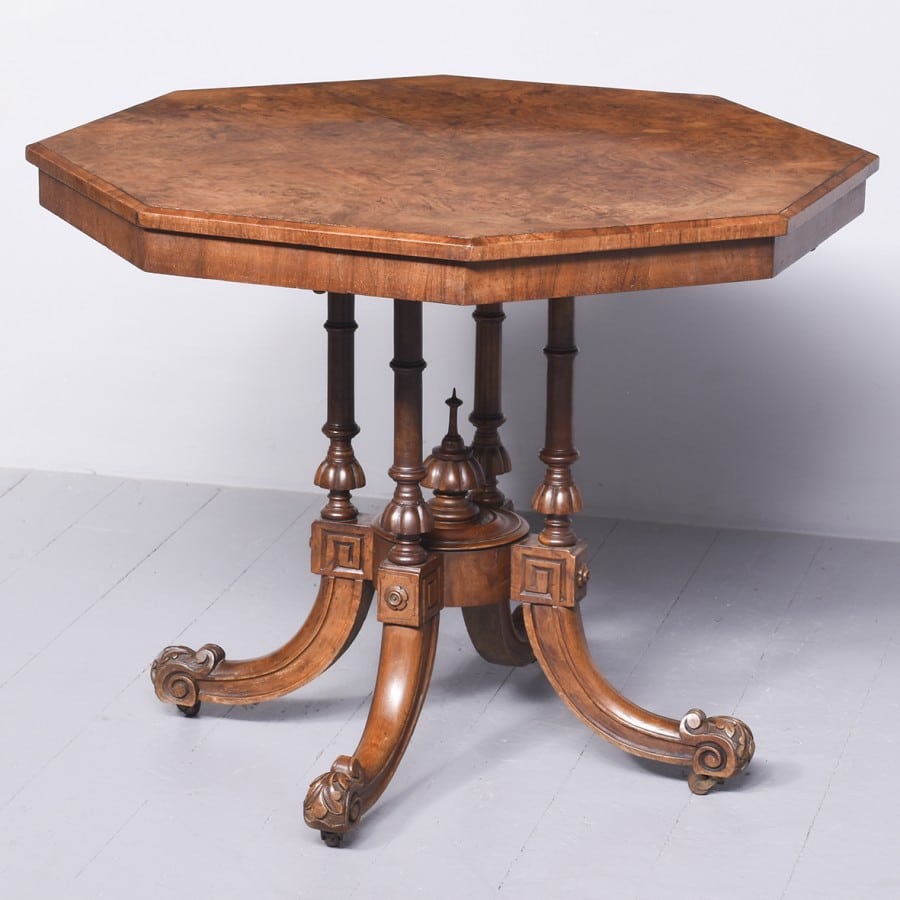 Circa 1860. A quality Mid-Victorian octagonal burr-walnut centre table in excellent condition. The octagonal top in beautiful mirror-matched burr-walnut with excellent figuring and with chamfered cross-banded edges above a simple cross-banded frieze. Supported on four ring-turn legs over curved cabriole legs with canted carved toes and original brass and porcelain castors the four legs surrounding a circular lower tier with a carved finial.