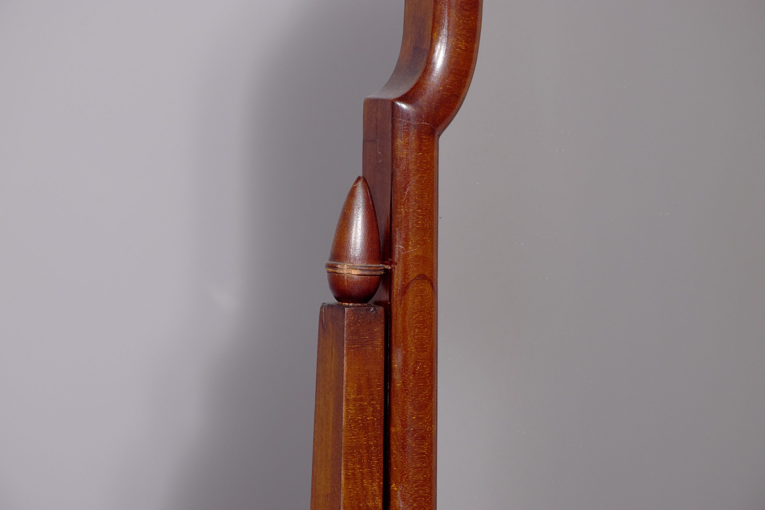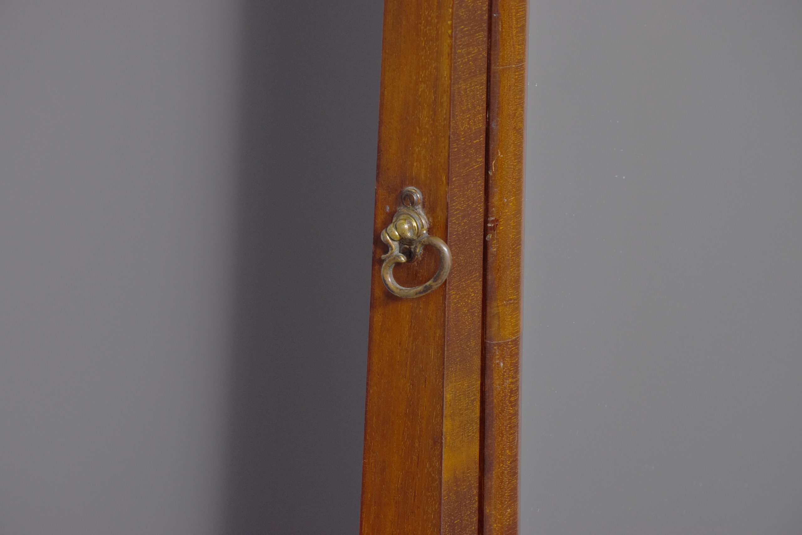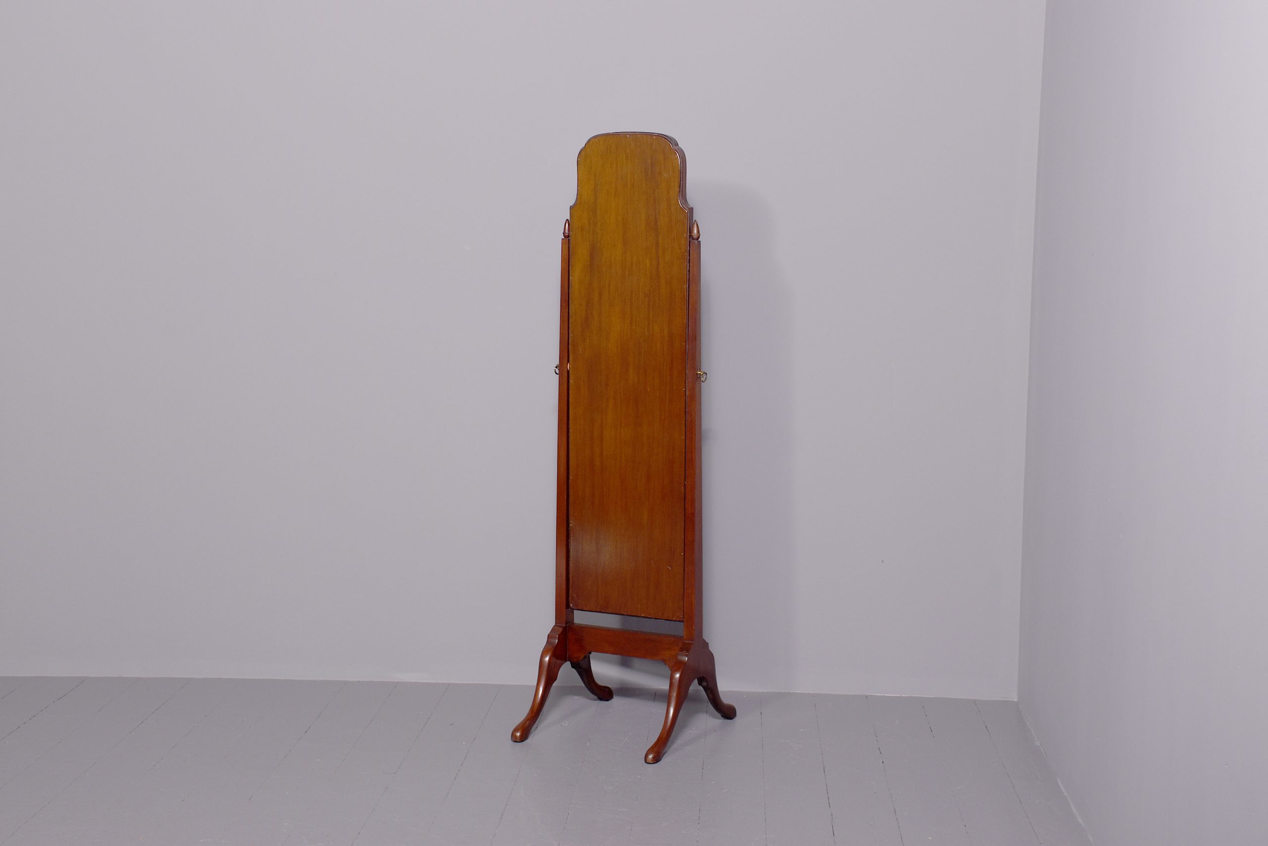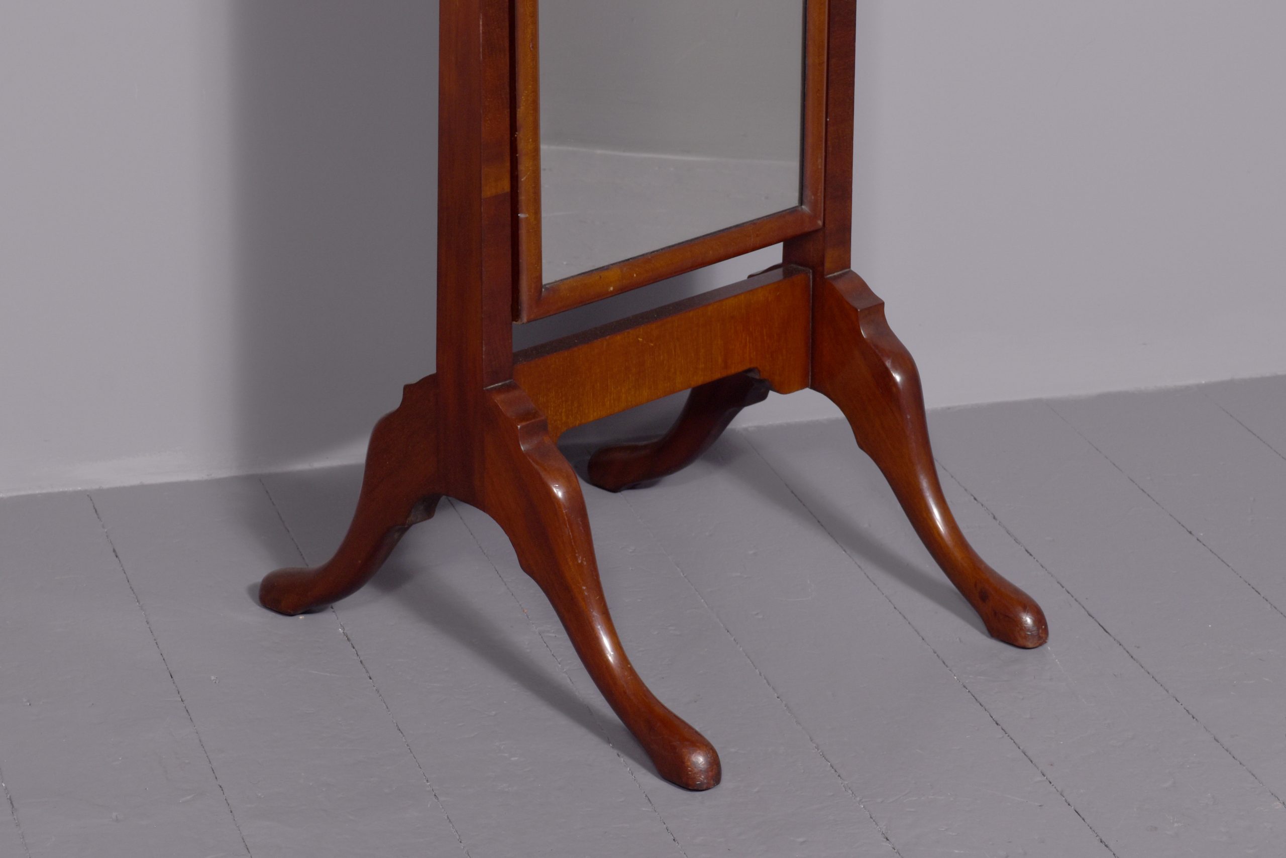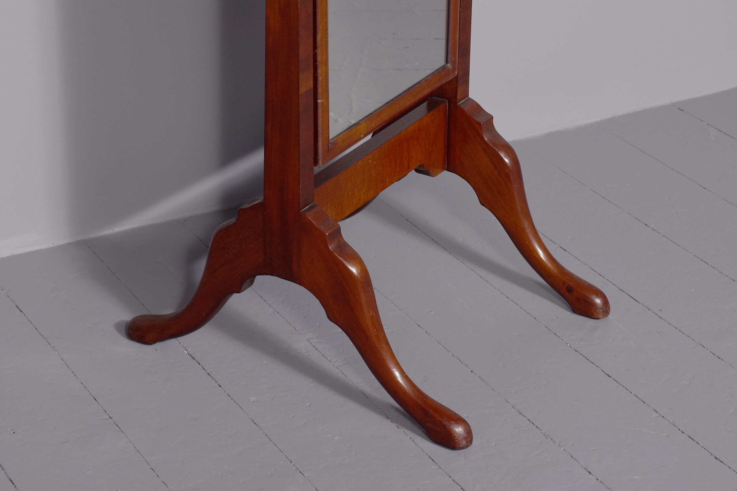 Circa 1920 Quality Queen Anne style neat-sized mahogany cheval mirror in Spanish mahogany. The tall rectangular mirror with a shaped top and its mirror plate in perfect condition within moulded flame mahogany frame. On square tapering supports with acorn finials and brass axe head handles over a shaped stretcher and supported cabriole legs with pad feet