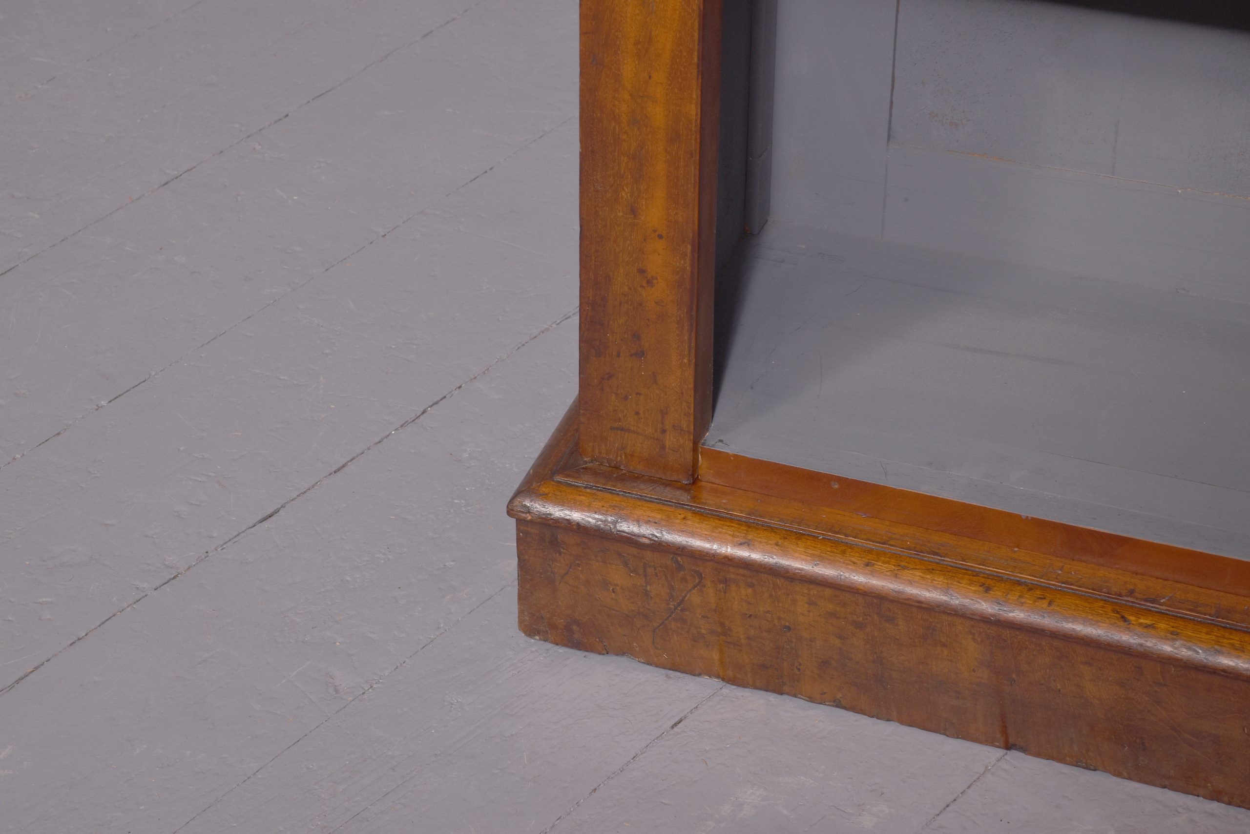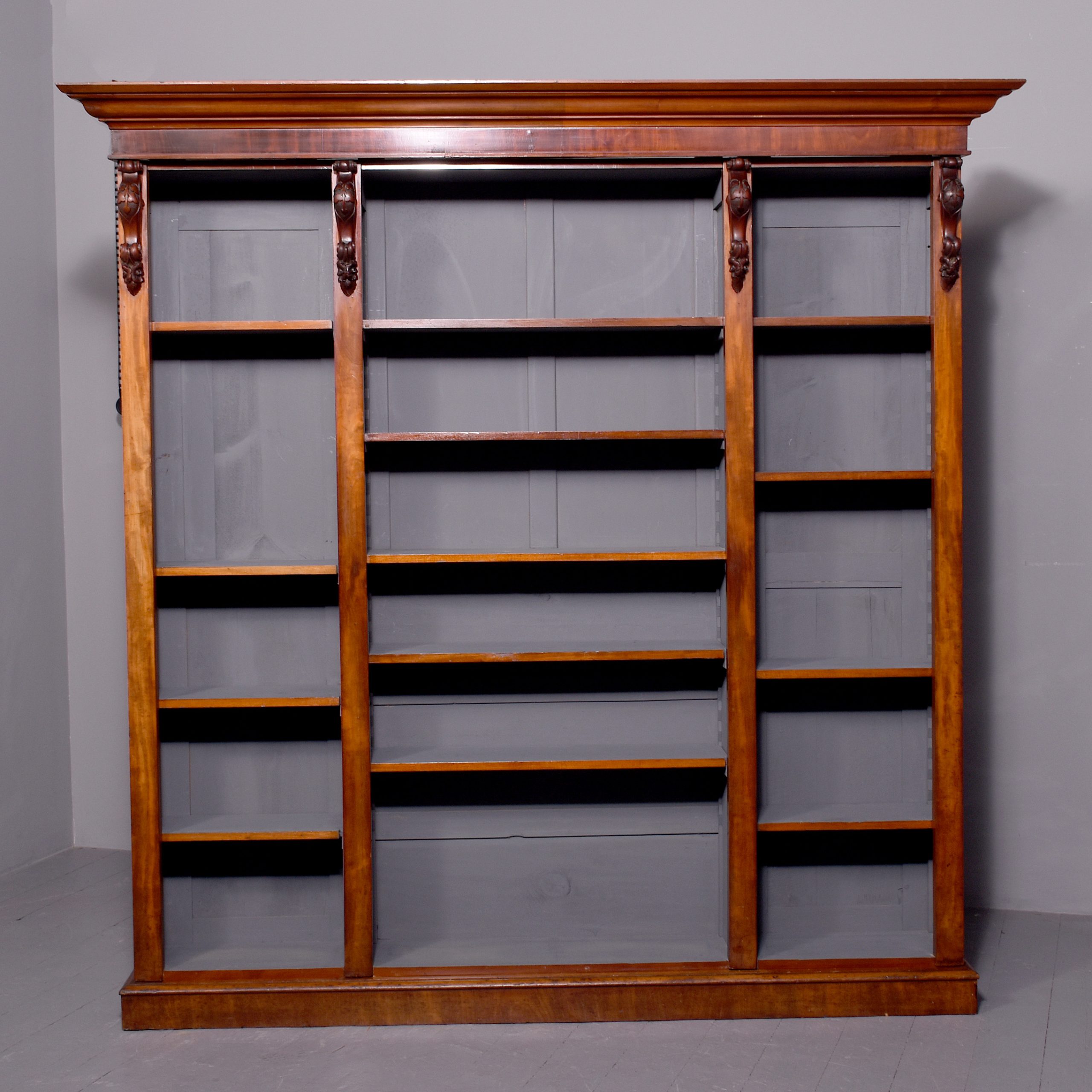 Circa 1860 with adaptations. Quality three-section, mid-Victorian mahogany open bookcase. Surmounted by a molded cornice above a simple cross-banded frieze, the three bookcase sections (wider middle section) and the sides are separated and flanked by figured mahogany pilasters with carved corbels on top and each containing five adjustable shelves. The sides in a beautiful mellow figured mahogany and sitting on a molded and enclosed plinth base. Attractive and functional.