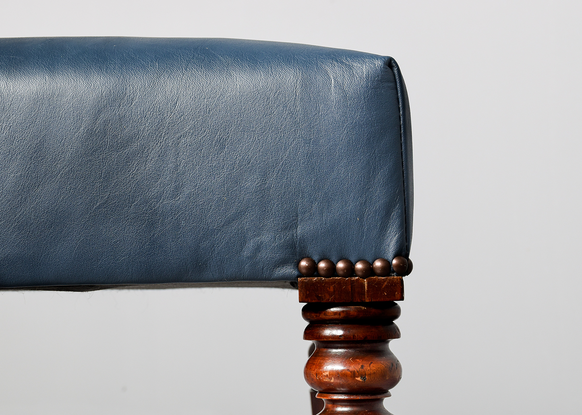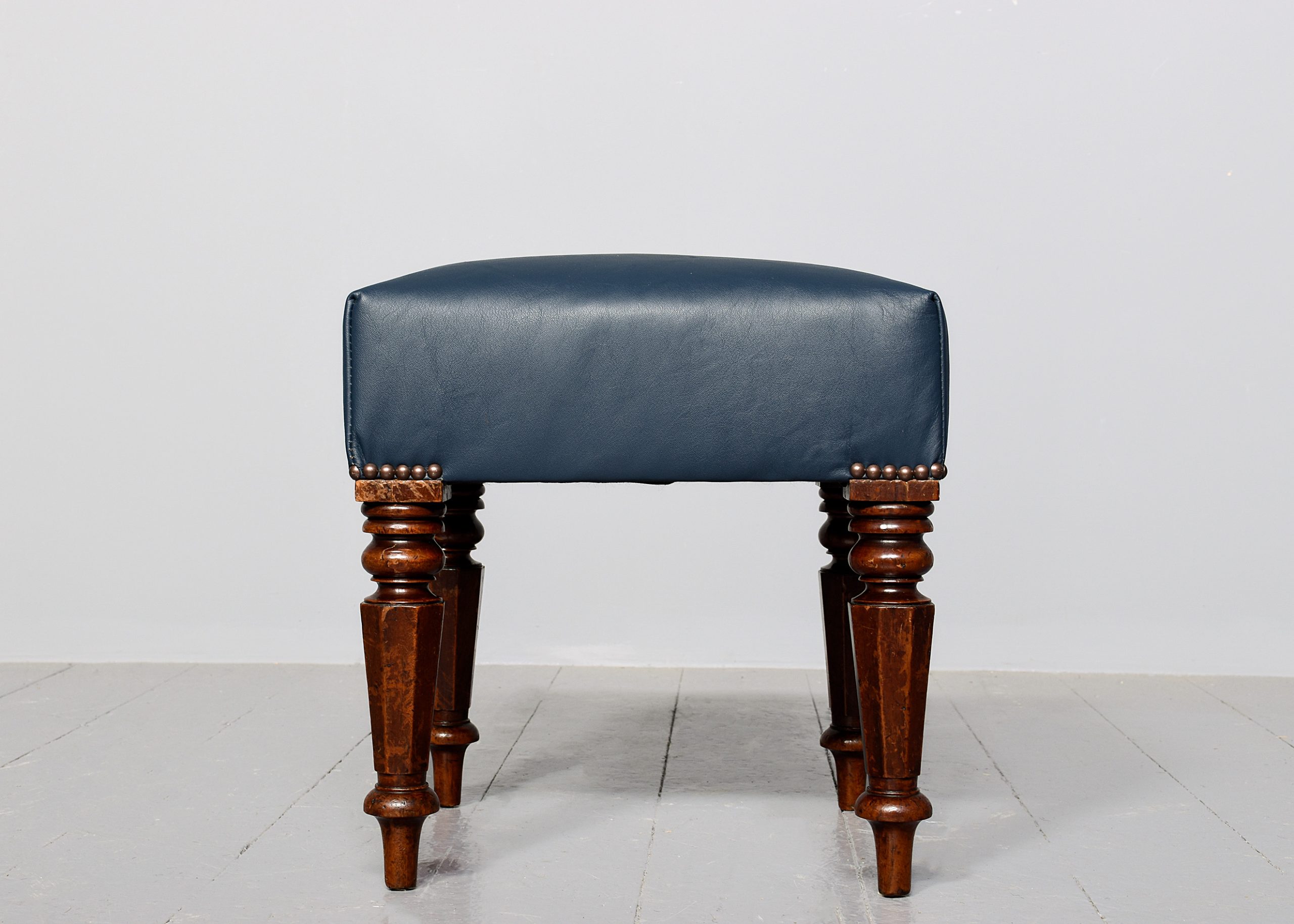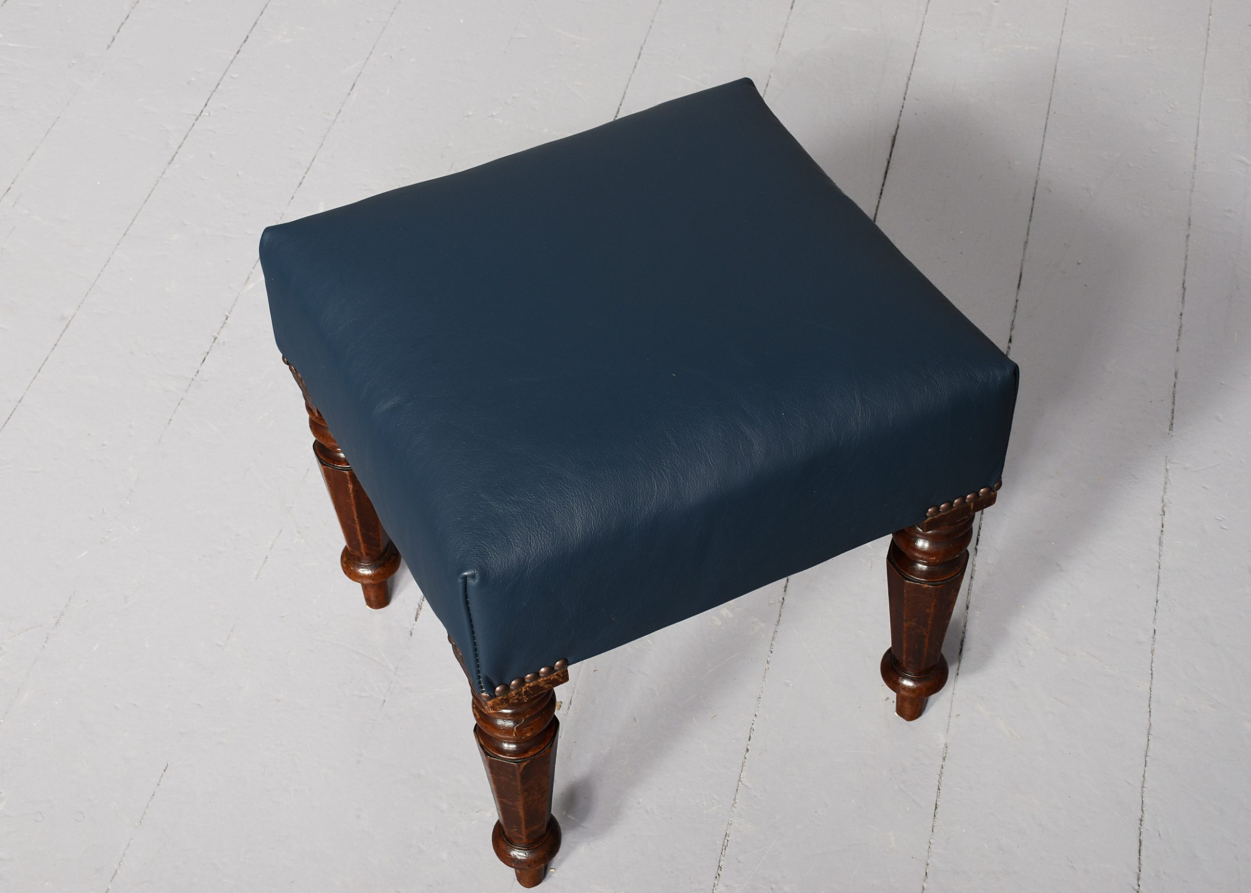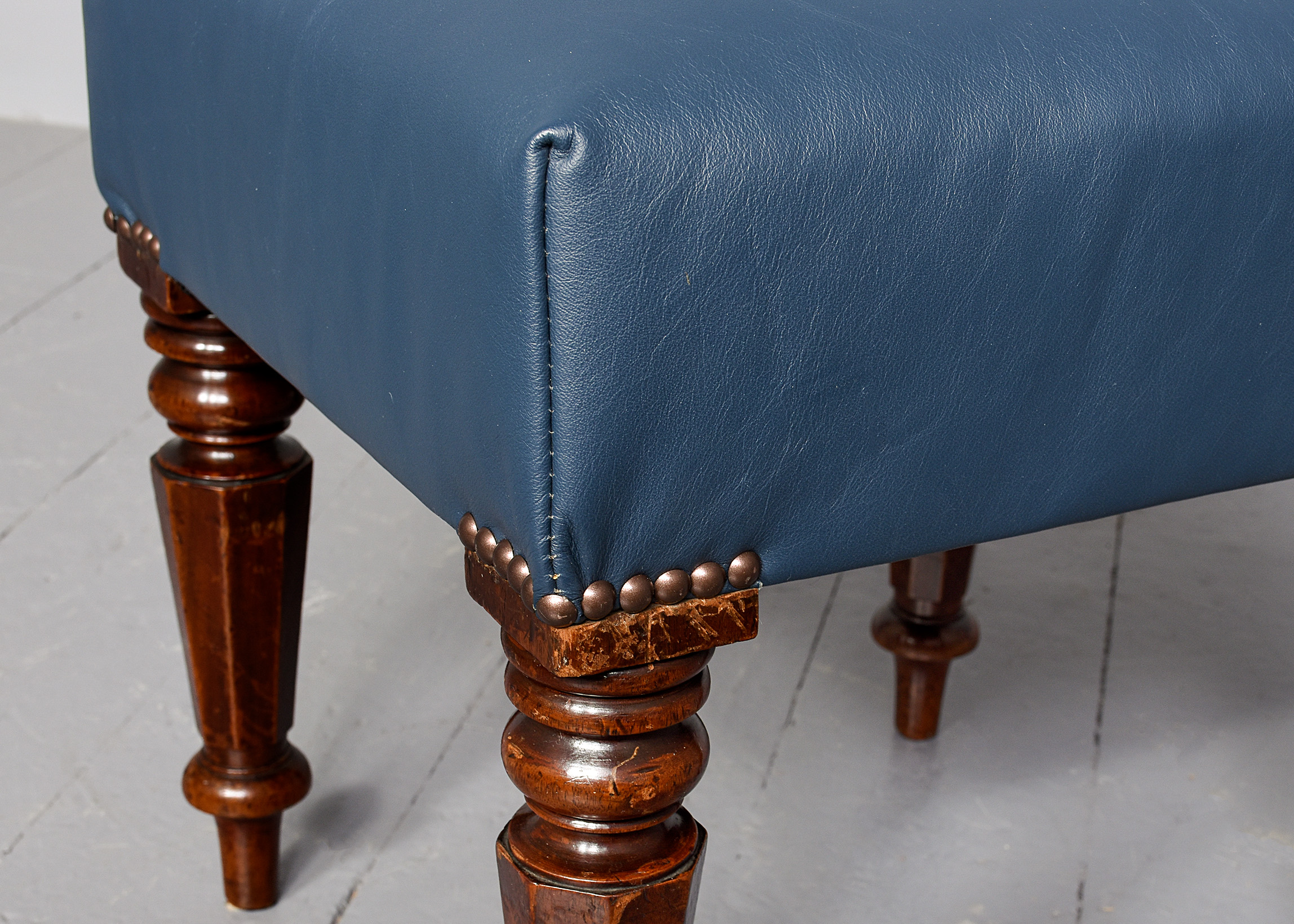 Circa 1830. Quality William IV mahogany-framed leather upholstered stool. The rectangular top with deep upholstery and brass studding above the turned and tapering octagonal mahogany legs, with a lovely colour and patina. Recently reupholstered in top-quality blue-green hide.