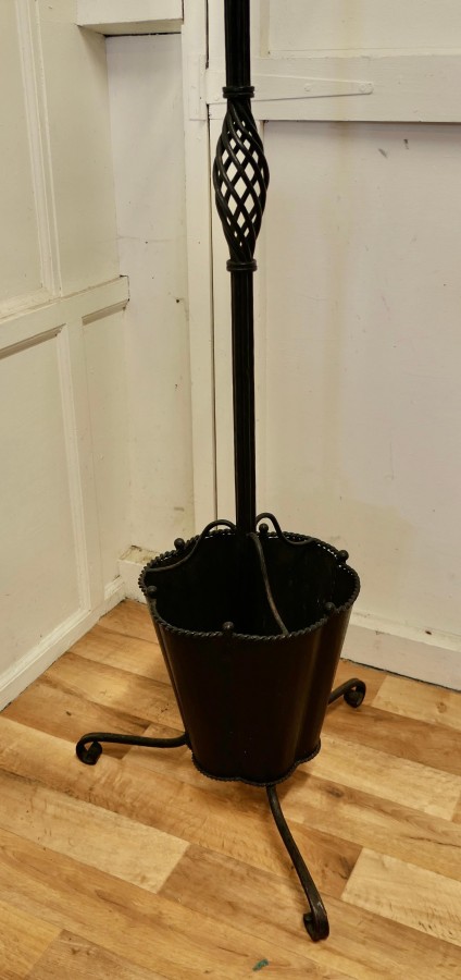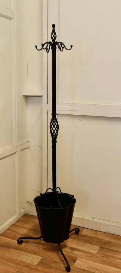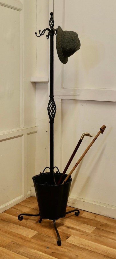 Quirky retro wrought iron hall stand, hats coats and umbrellas This is an Unusual Hat %26 Coat Hall Stand it has Large Hat and Coat pegs at the top, and lower down there is a 4 section holder for umbrellas, in the shape of a giant Umbrella The stand sits firmly on 3 curled splayed legs, it is heavy and sturdy it is 68” tall, and at the floor it is 22” across TCC43. Manufacture Date : 1960 Materials : Wrought-iron