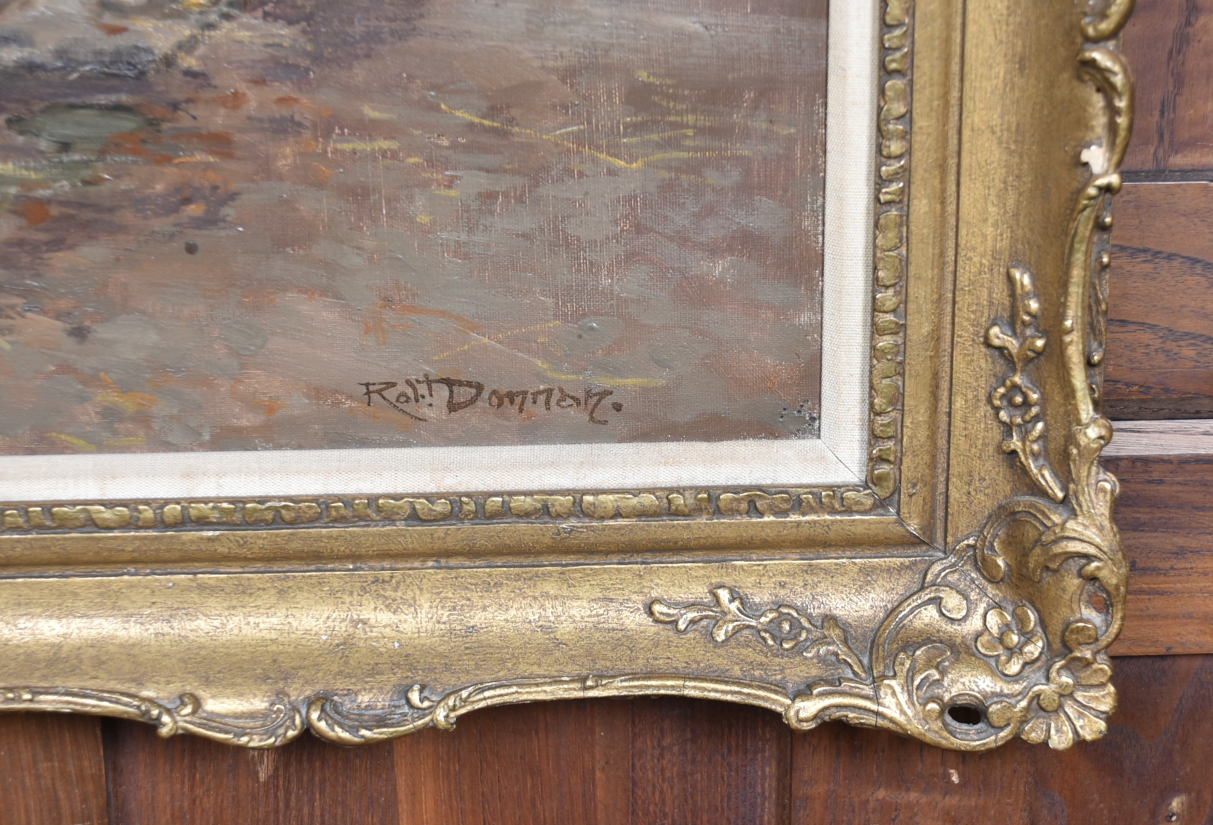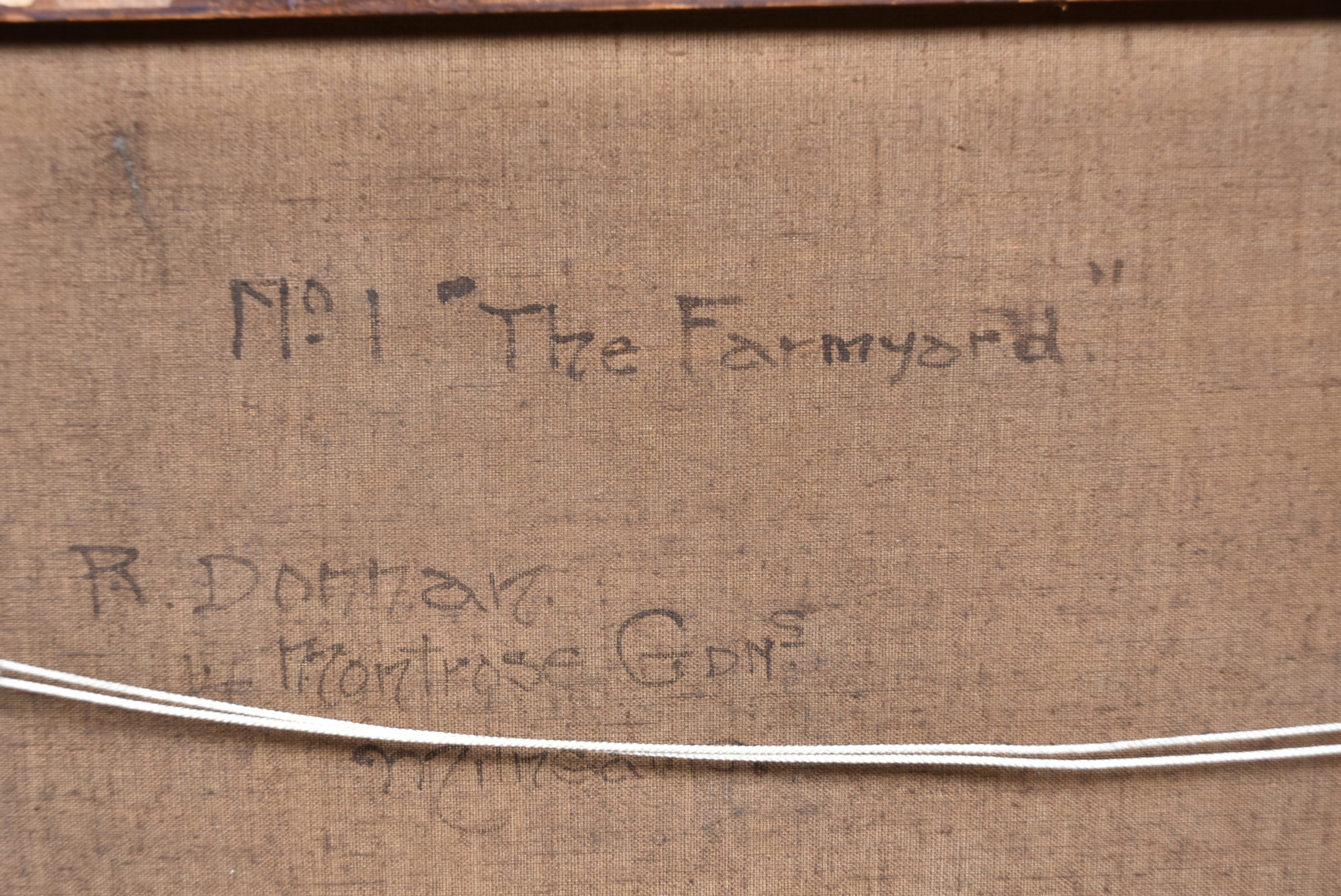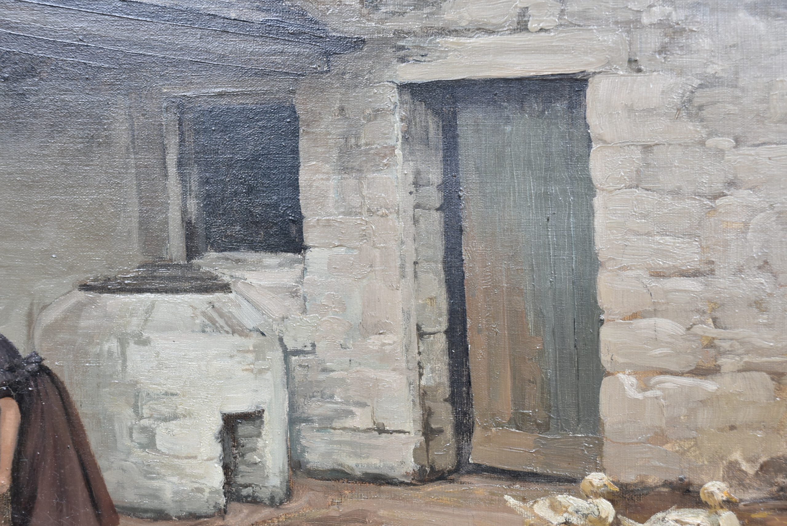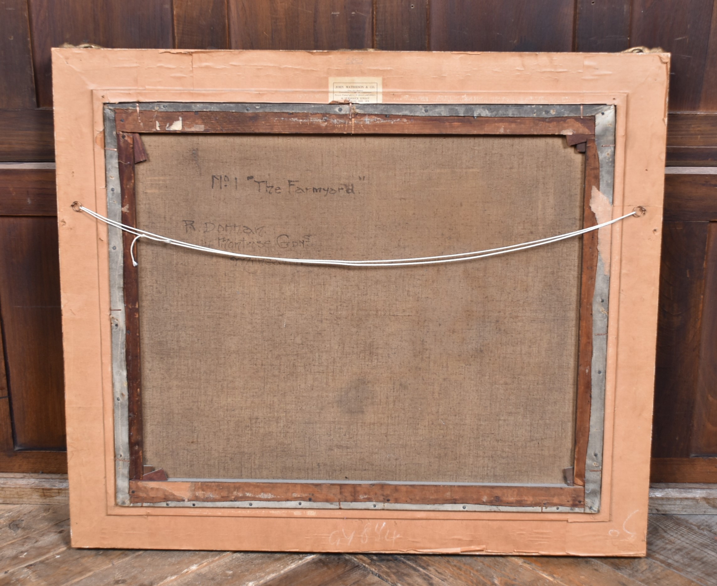 A beautifully composed rustic landscape, this painting captures a quiet moment of daily life in a traditional farmyard setting. At its heart, a woman bends over a wooden trough, absorbed in her task—perhaps washing or preparing food—dressed in a long dark gown and apron that evoke 19th-century rural attire. Surrounding her, white ducks or geese meander across a stone-paved courtyard, adding gentle movement and pastoral charm. The backdrop features weathered stone buildings and a large white cylindrical structure, possibly a water tank or outdoor oven, lending architectural interest and context. Scattered objects—a bucket, a cabbage—enrich the scene with lived-in detail. Framed in an ornate gilt frame with floral embellishments, the painting is signed by Ralph Dorrance in the lower corner.