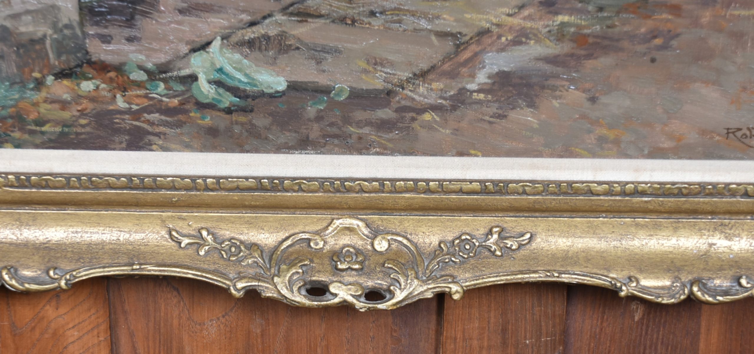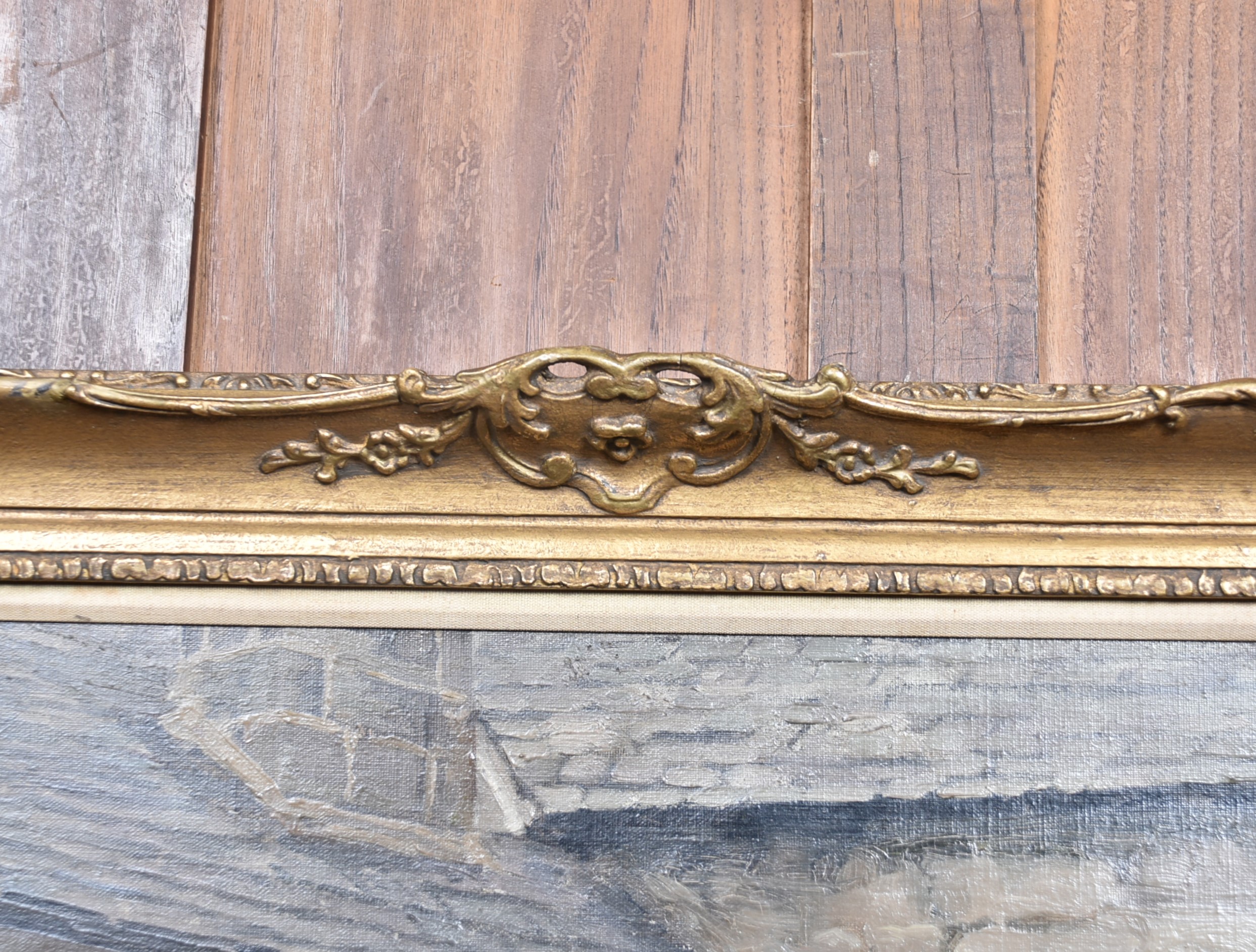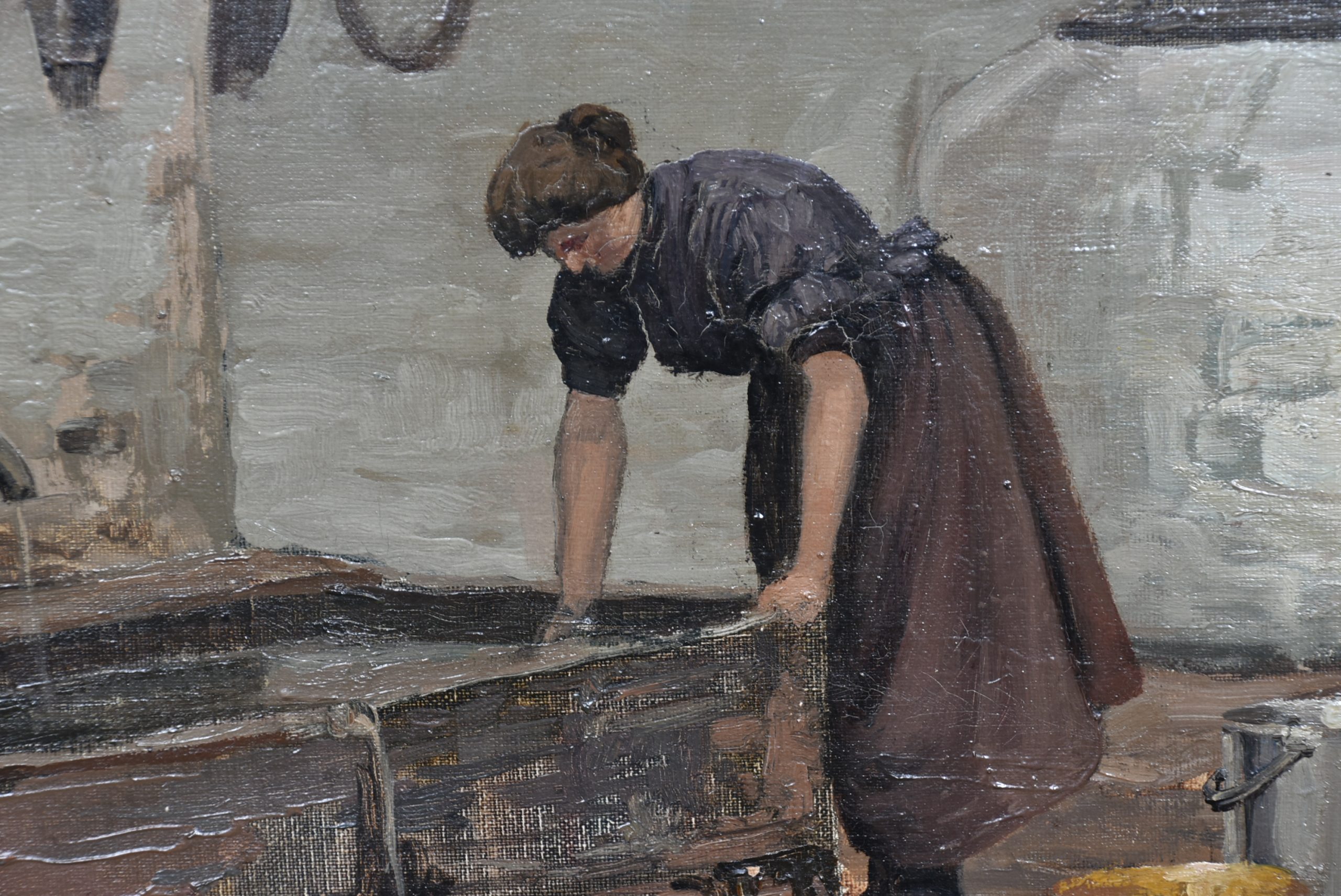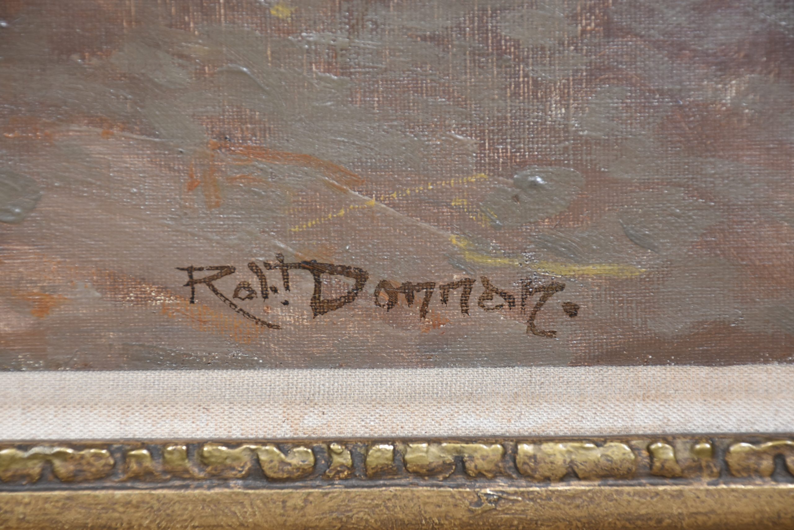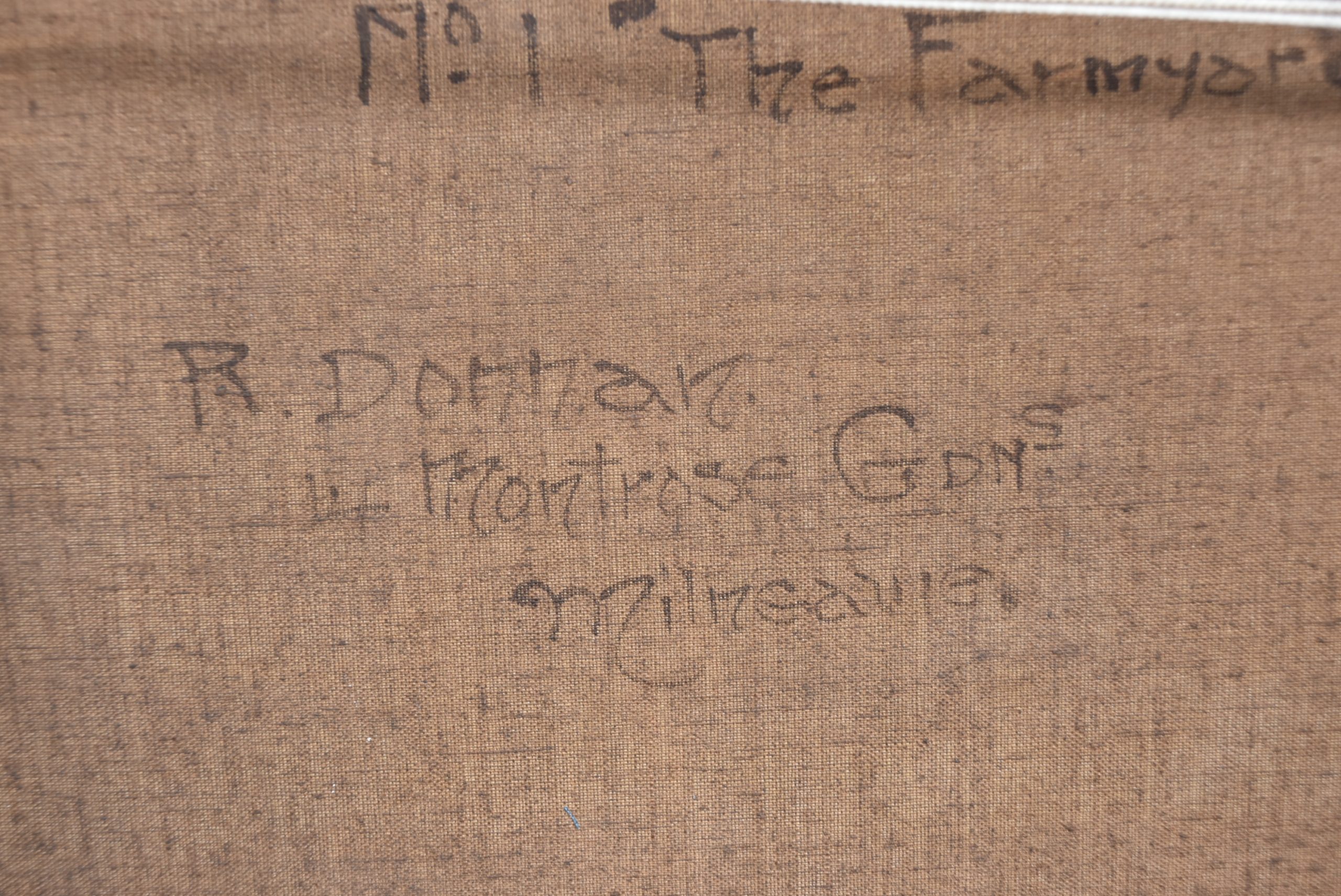 A beautifully composed rustic landscape, this painting captures a quiet moment of daily life in a traditional farmyard setting. At its heart, a woman bends over a wooden trough, absorbed in her task—perhaps washing or preparing food—dressed in a long dark gown and apron that evoke 19th-century rural attire. Surrounding her, white ducks or geese meander across a stone-paved courtyard, adding gentle movement and pastoral charm. The backdrop features weathered stone buildings and a large white cylindrical structure, possibly a water tank or outdoor oven, lending architectural interest and context. Scattered objects—a bucket, a cabbage—enrich the scene with lived-in detail. Framed in an ornate gilt frame with floral embellishments, the painting is signed by Ralph Dorrance in the lower corner.