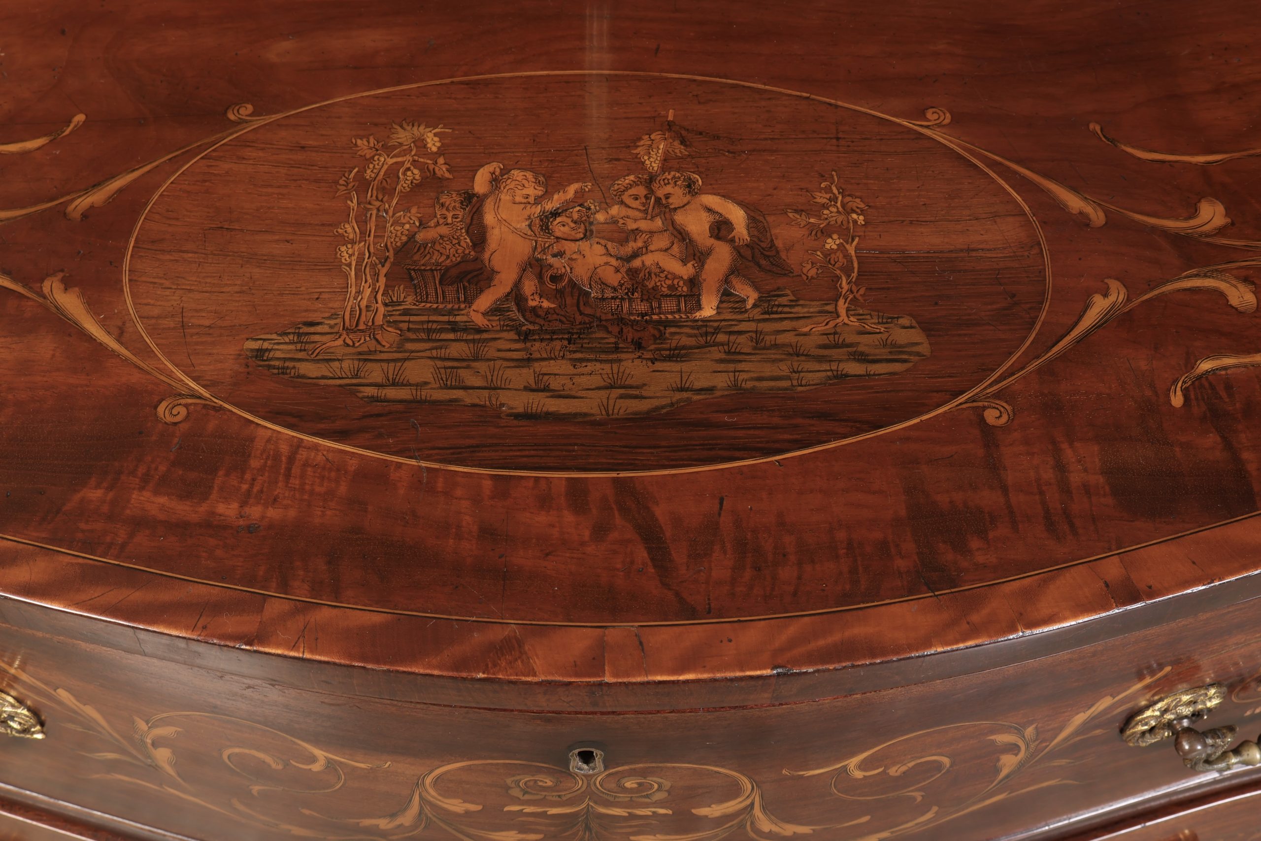 The lower chest top features a decorative inlaid design and comprises of 3 serpentine-fronted drawers, each finely dovetailed and in good working order. The drawers have brass swan-neck handles and are adorned with further marquetry inlaid detail.