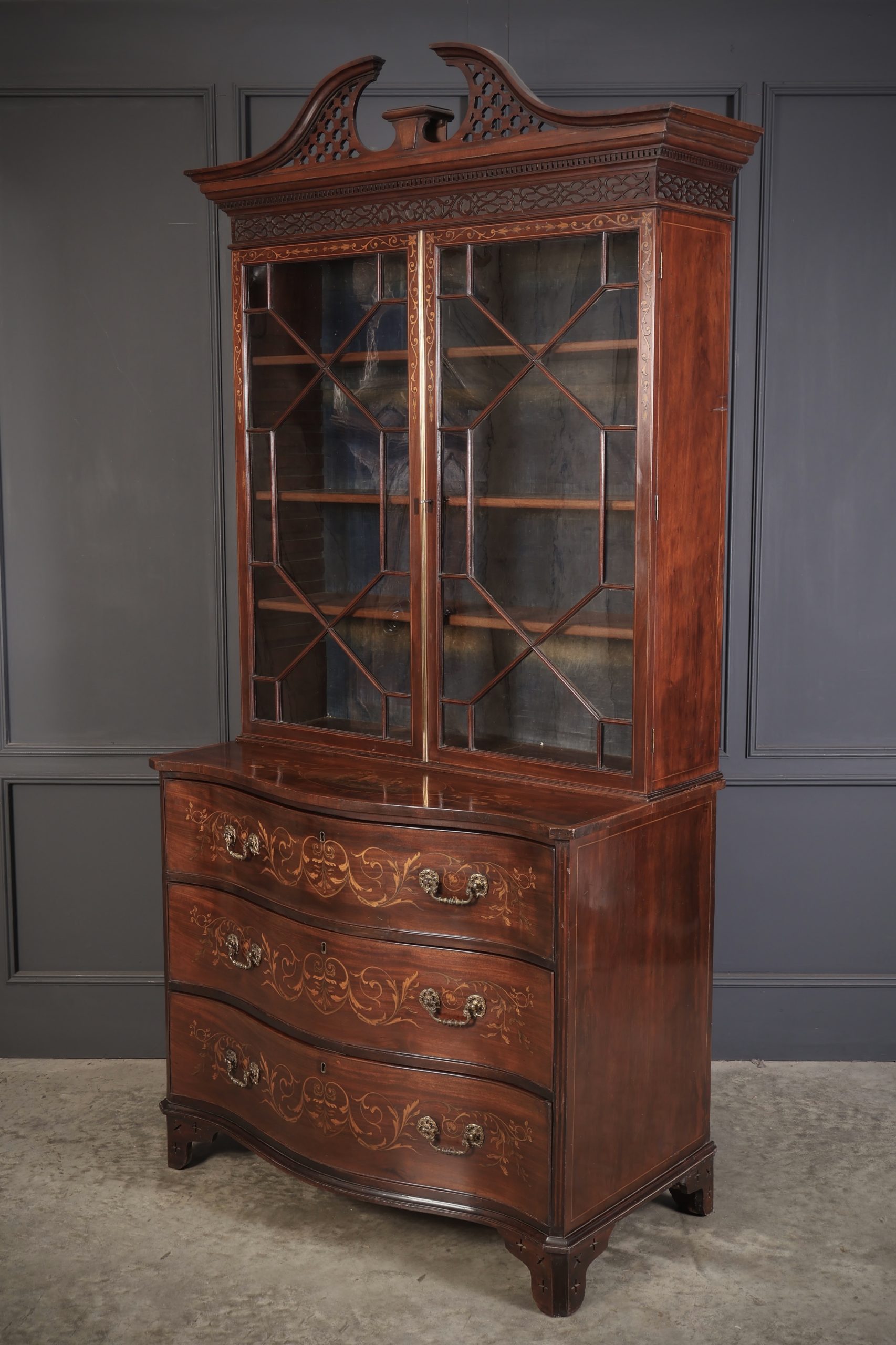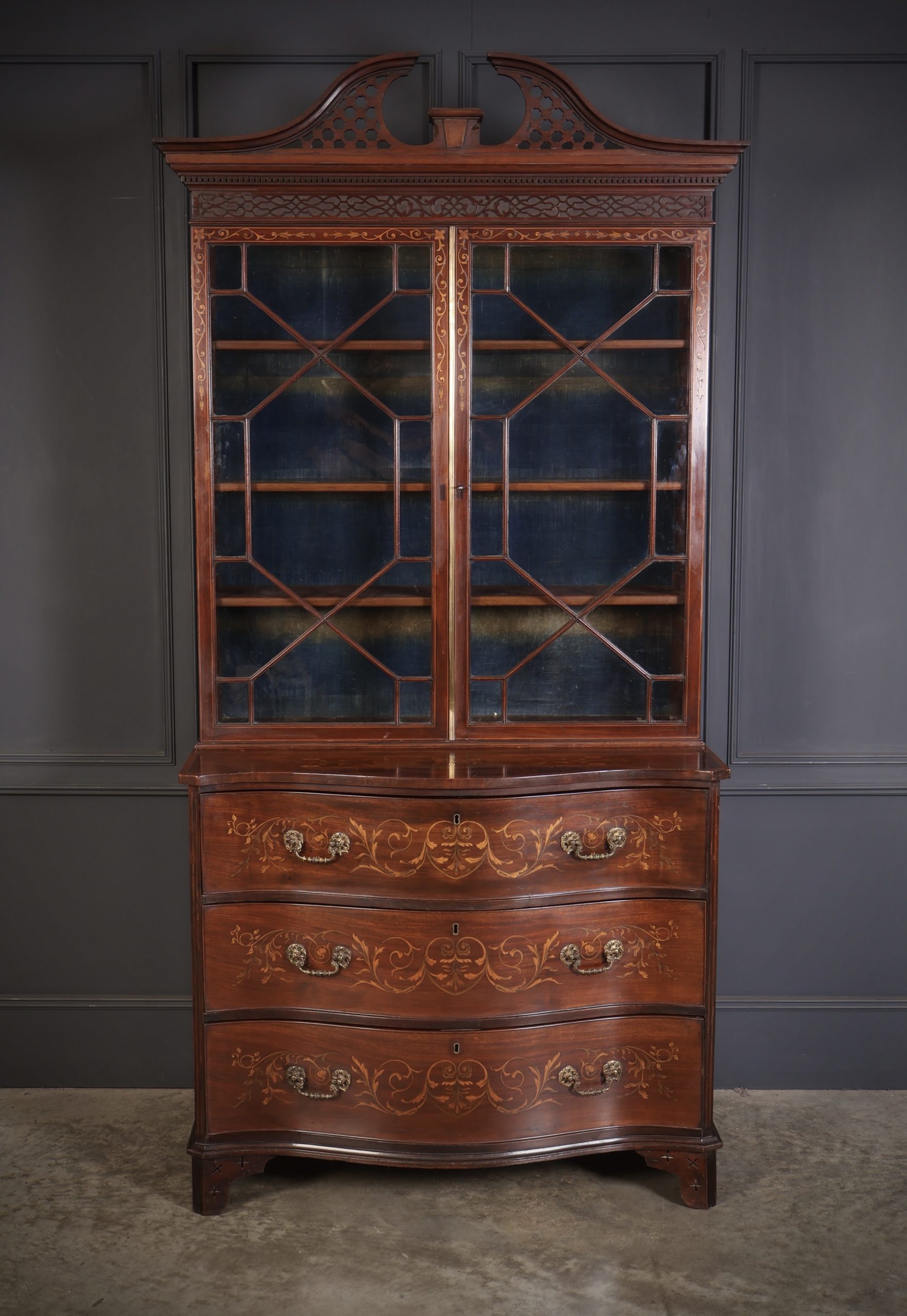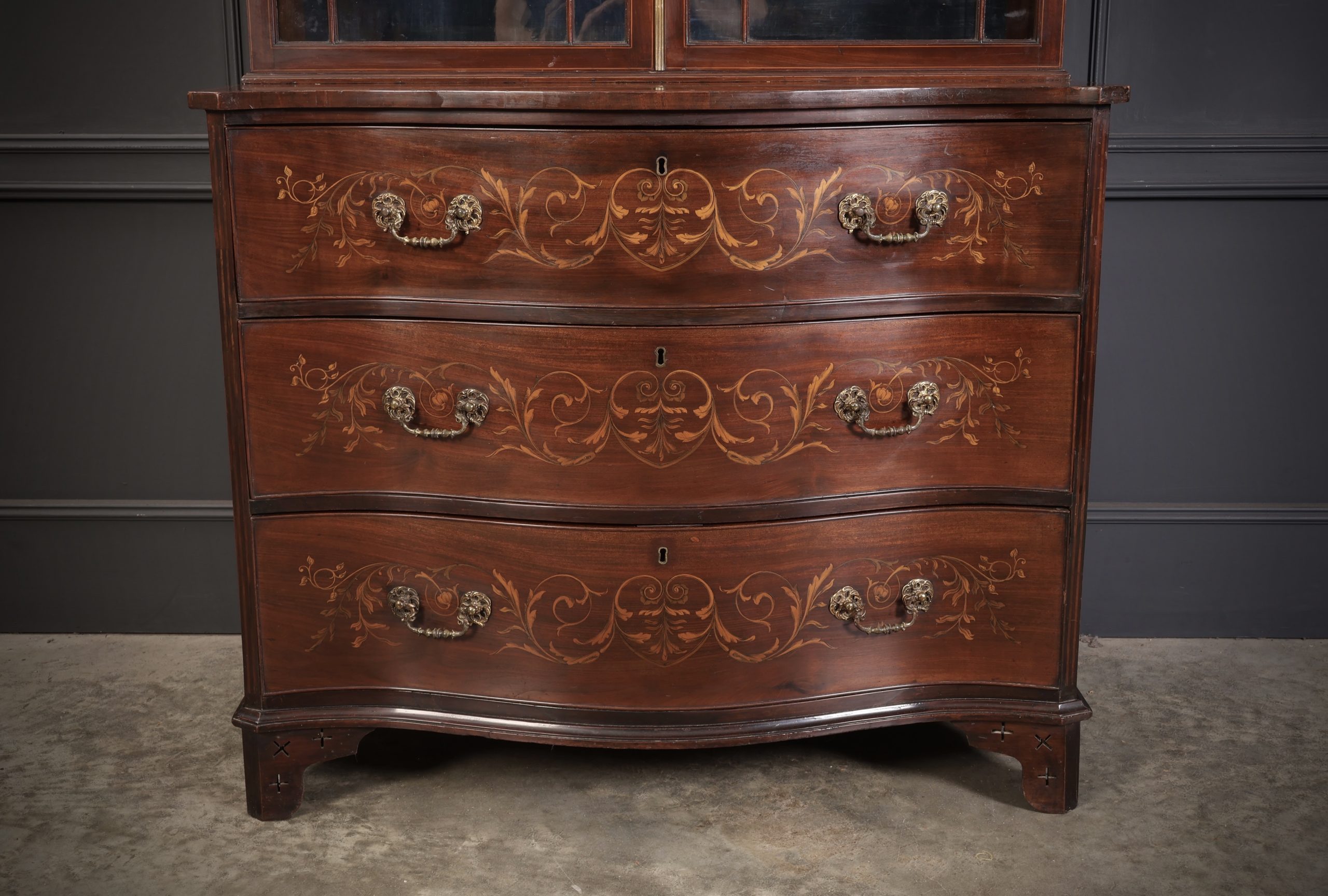 This rare and elegant George III period bookcase is a superb example of late 18th-century English furniture, constructed from rich mahogany with refined marquetry inlay throughout. The upper bookcase section features 2 astragal glazed doors and framed by beautiful marquetry inlaid patterns.