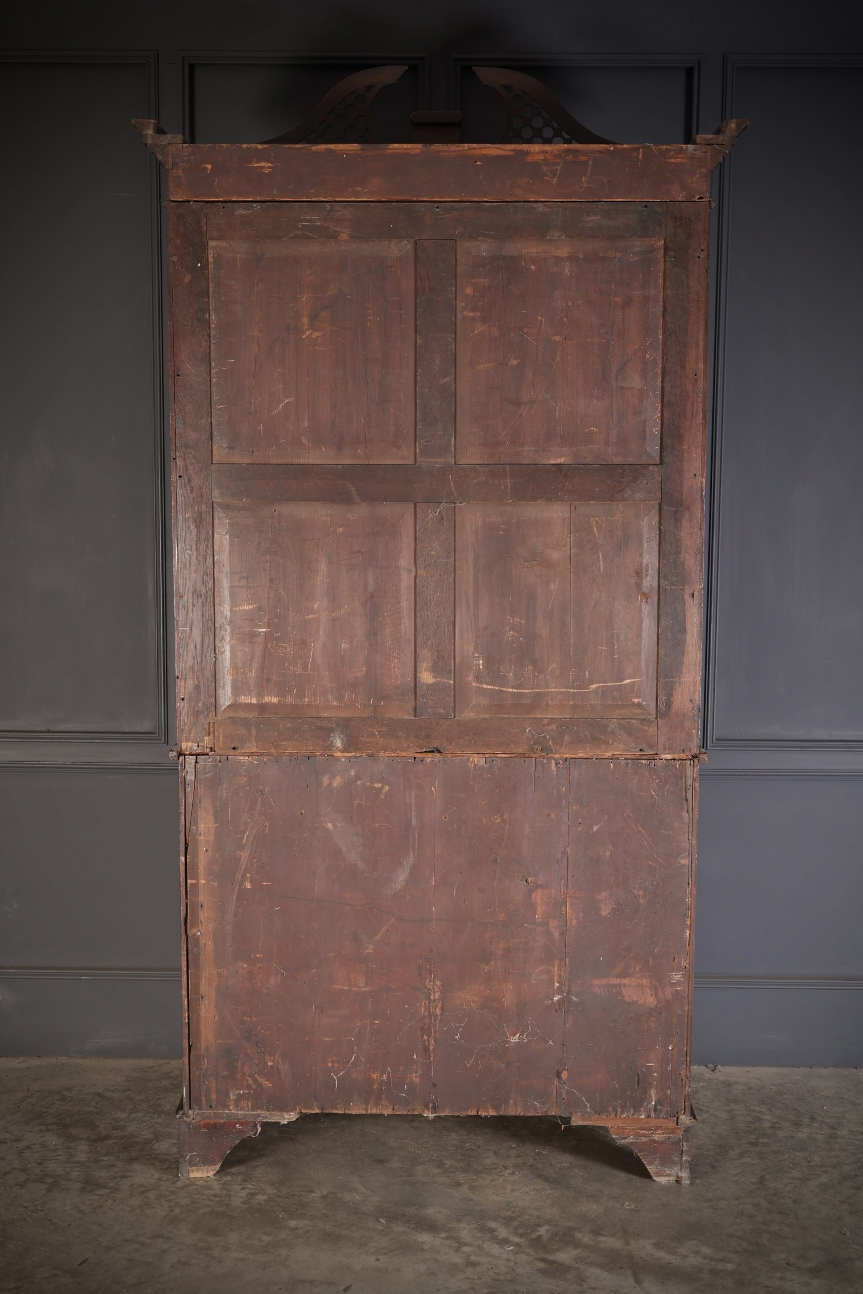 A striking break arch pediment is adorned with intricate pierced fretwork above a dentil cornice and additional blind fretwork adding architectural presence and visual sophistication.