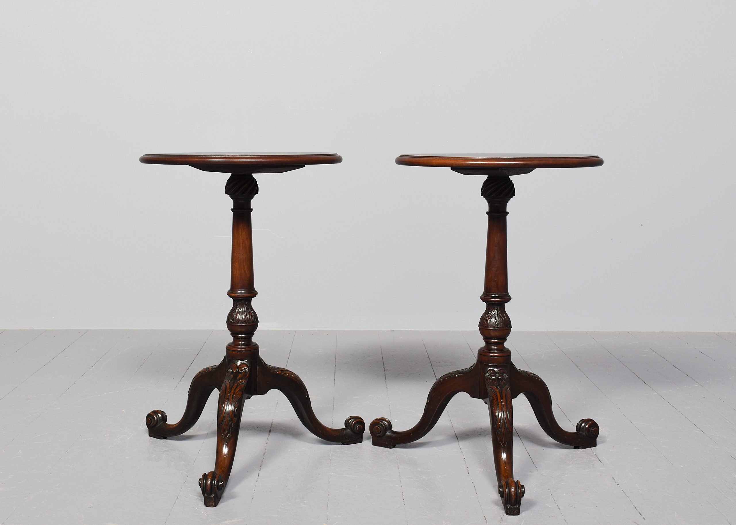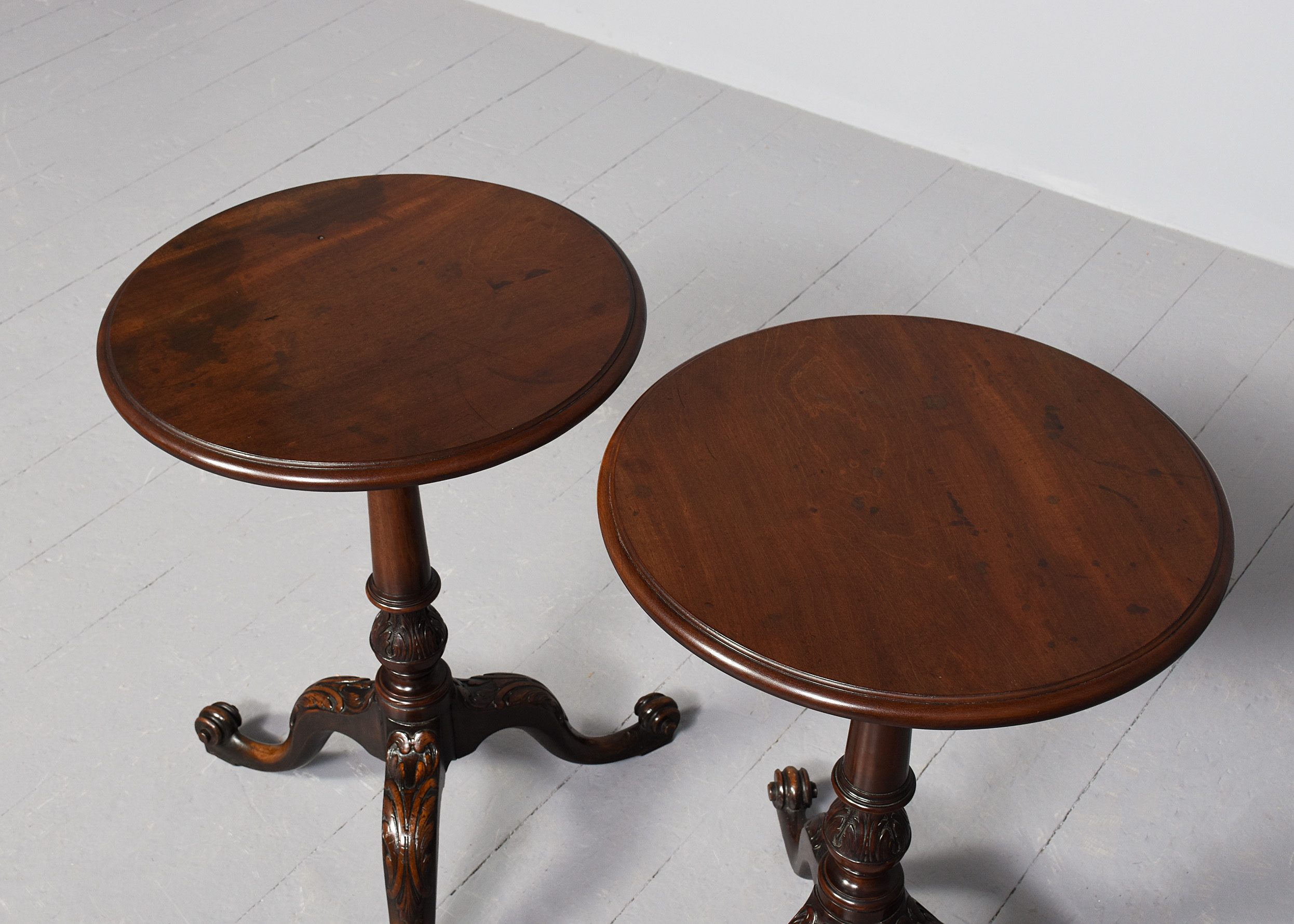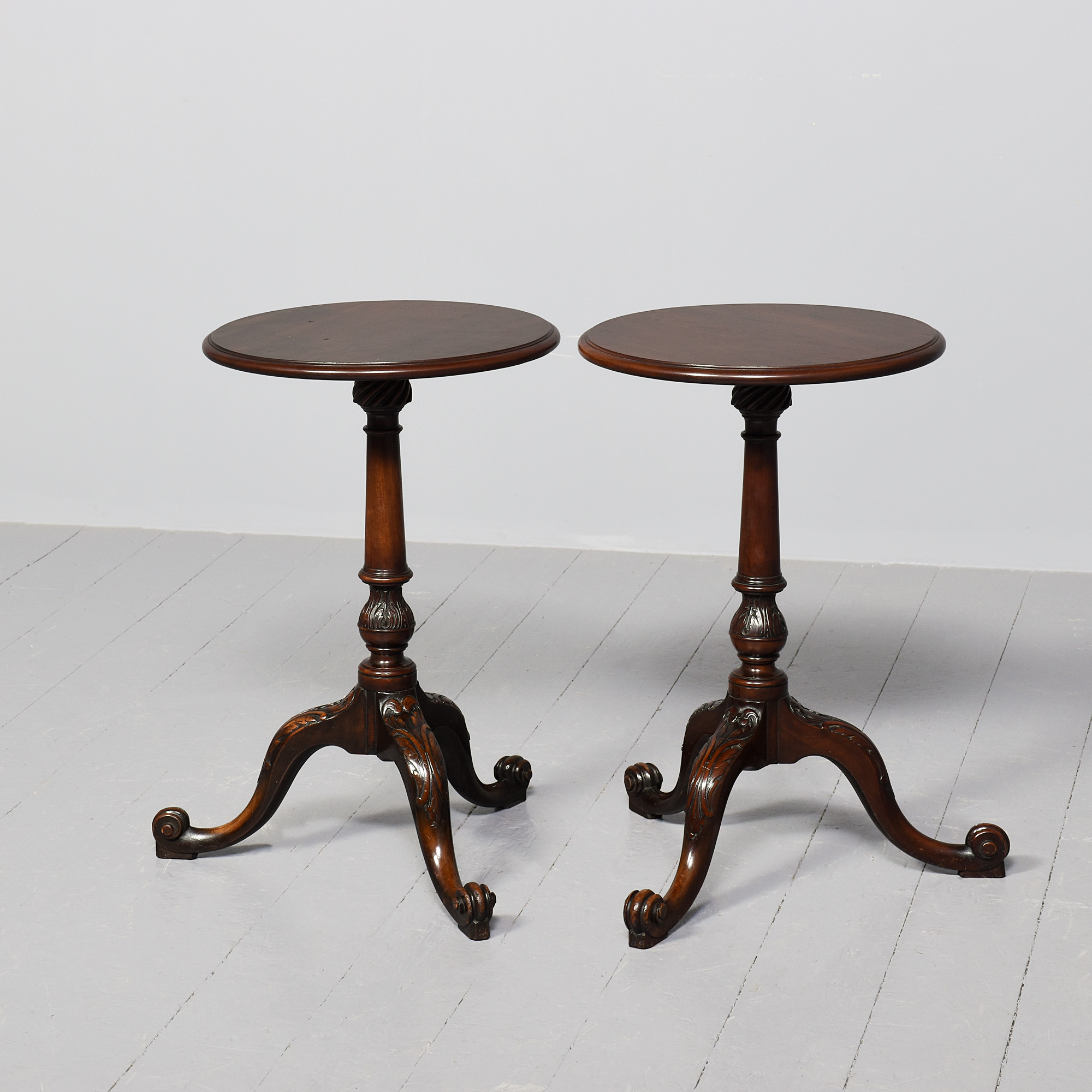 Circa 1860 (with restorations). Rare pair of 19th Century, George 3rd style mahogany occasional tables. The circular tops with moulded edges with a nice colour and degree of wear supported on tapering ring turned stems with acanthus carved bases over three cabriole legs with acanthus carved knees and scrolled toes. Provenance: these were “select items from the estate of the late Lady Penn and Sir Athur Penn, sold by Puttick and Simpson, December 1932 for £4-14s-06d the pair. Puttick and Simpson was a famous London auction house.