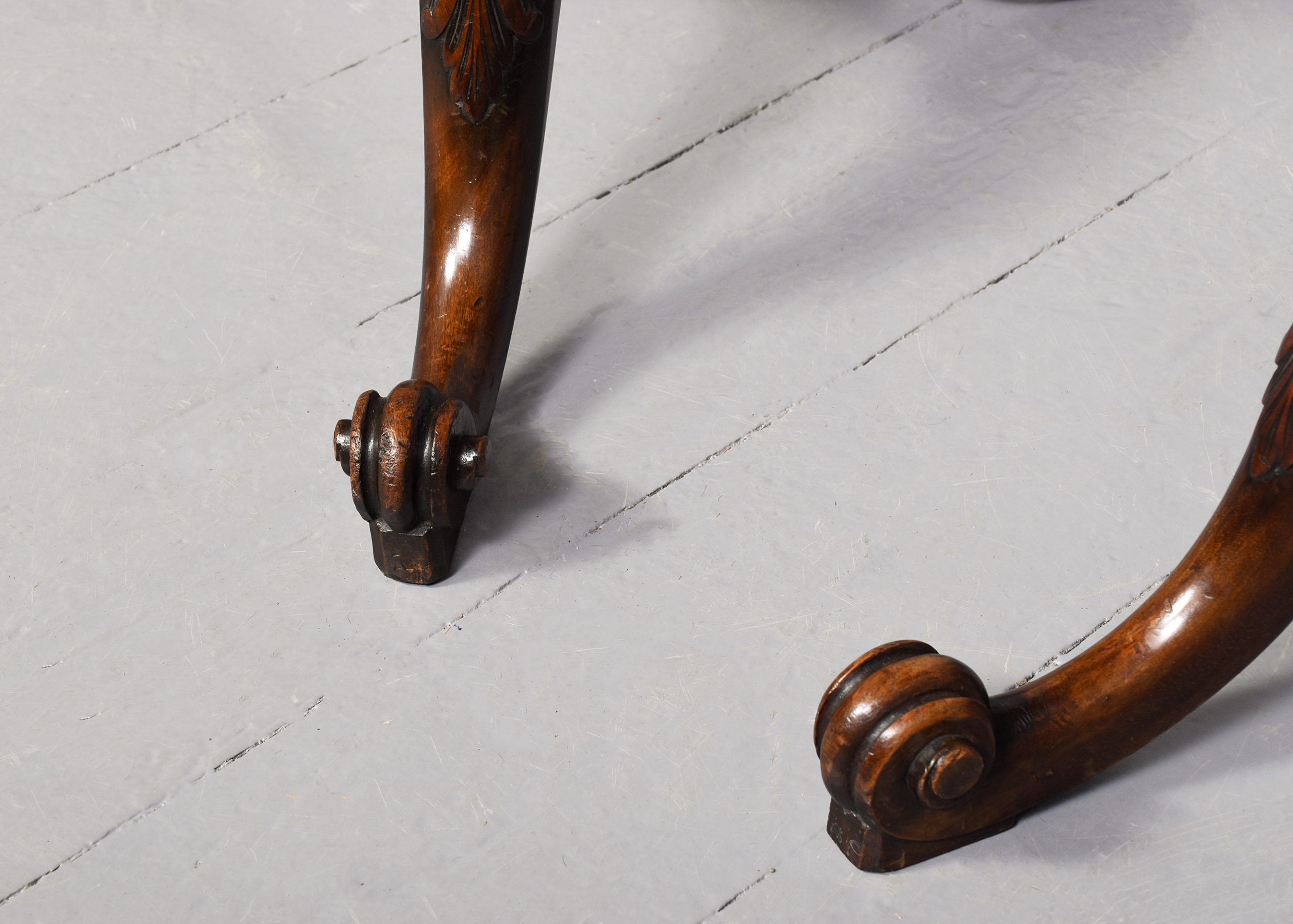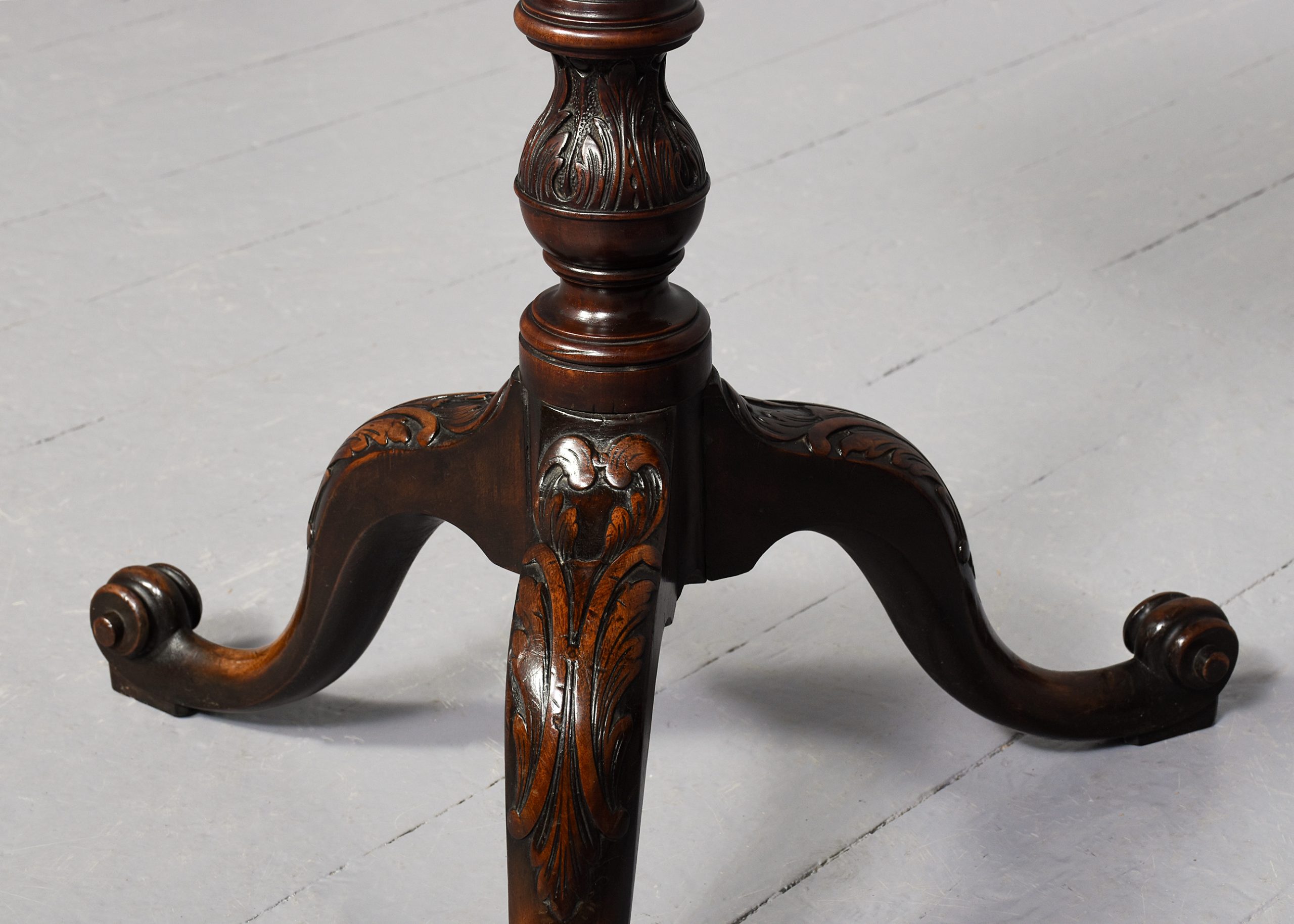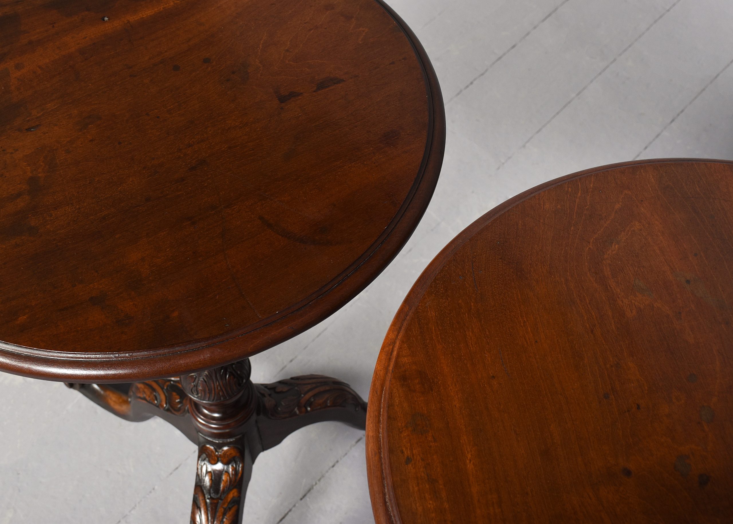 Circa 1860 (with restorations). Rare pair of 19th Century, George 3rd style mahogany occasional tables. The circular tops with moulded edges with a nice colour and degree of wear supported on tapering ring turned stems with acanthus carved bases over three cabriole legs with acanthus carved knees and scrolled toes. Provenance: these were “select items from the estate of the late Lady Penn and Sir Athur Penn, sold by Puttick and Simpson, December 1932 for £4-14s-06d the pair. Puttick and Simpson was a famous London auction house.