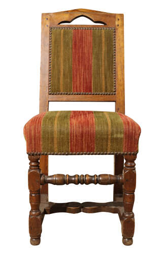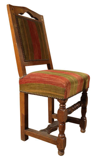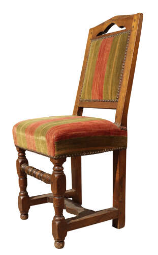 A rare and characterful pair of late 17th/early 18th century French fruitwood back stools, likely originating from South-West France. Beautifully crafted with turned front legs, elegant stretcher supports, and a shaped back rail, these stools showcase the timeless craftsmanship of the period. The bases have been professionally restored for stability, and the seats and backs are upholstered in a later striped velvet, adding comfort while preserving their historic charm.
