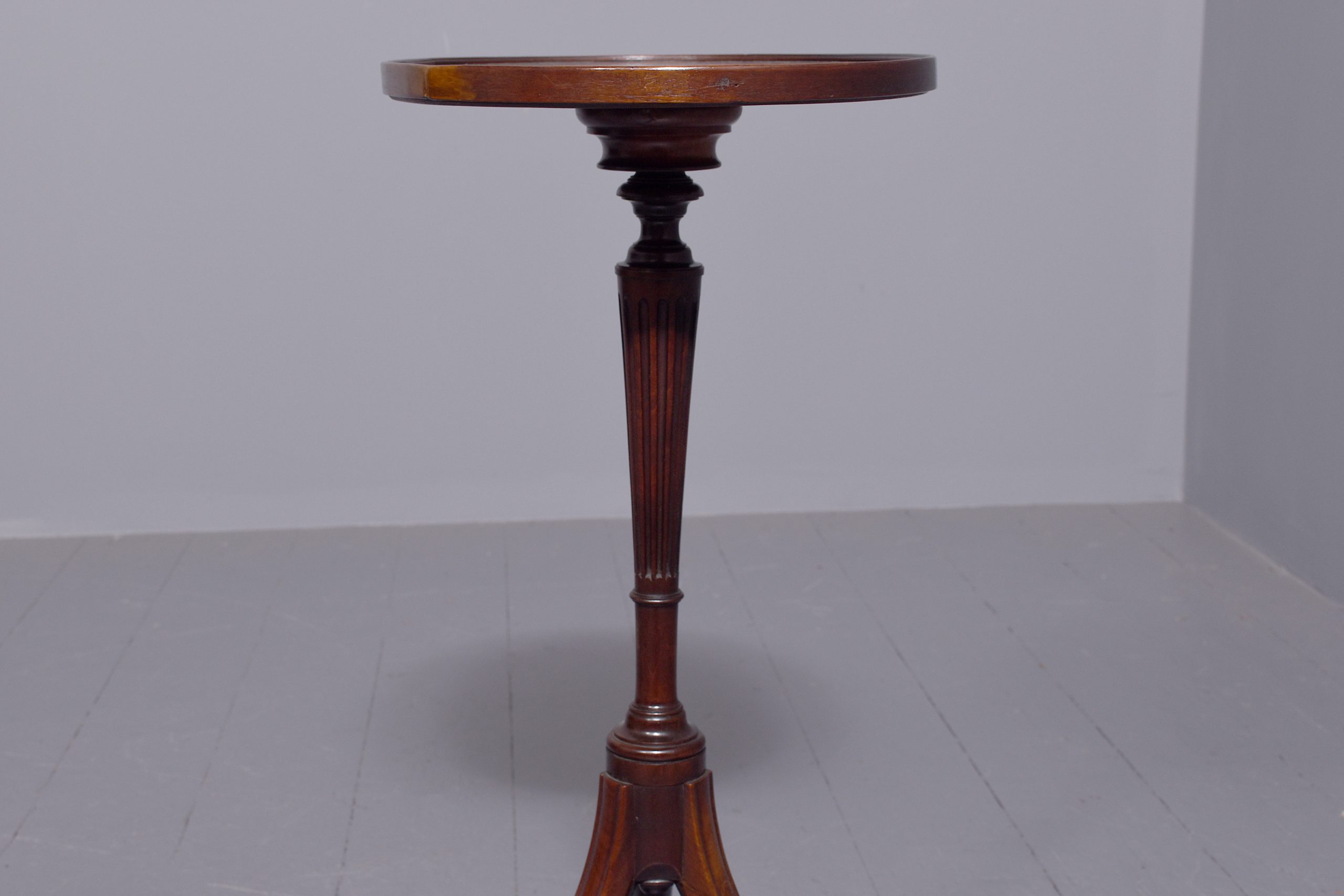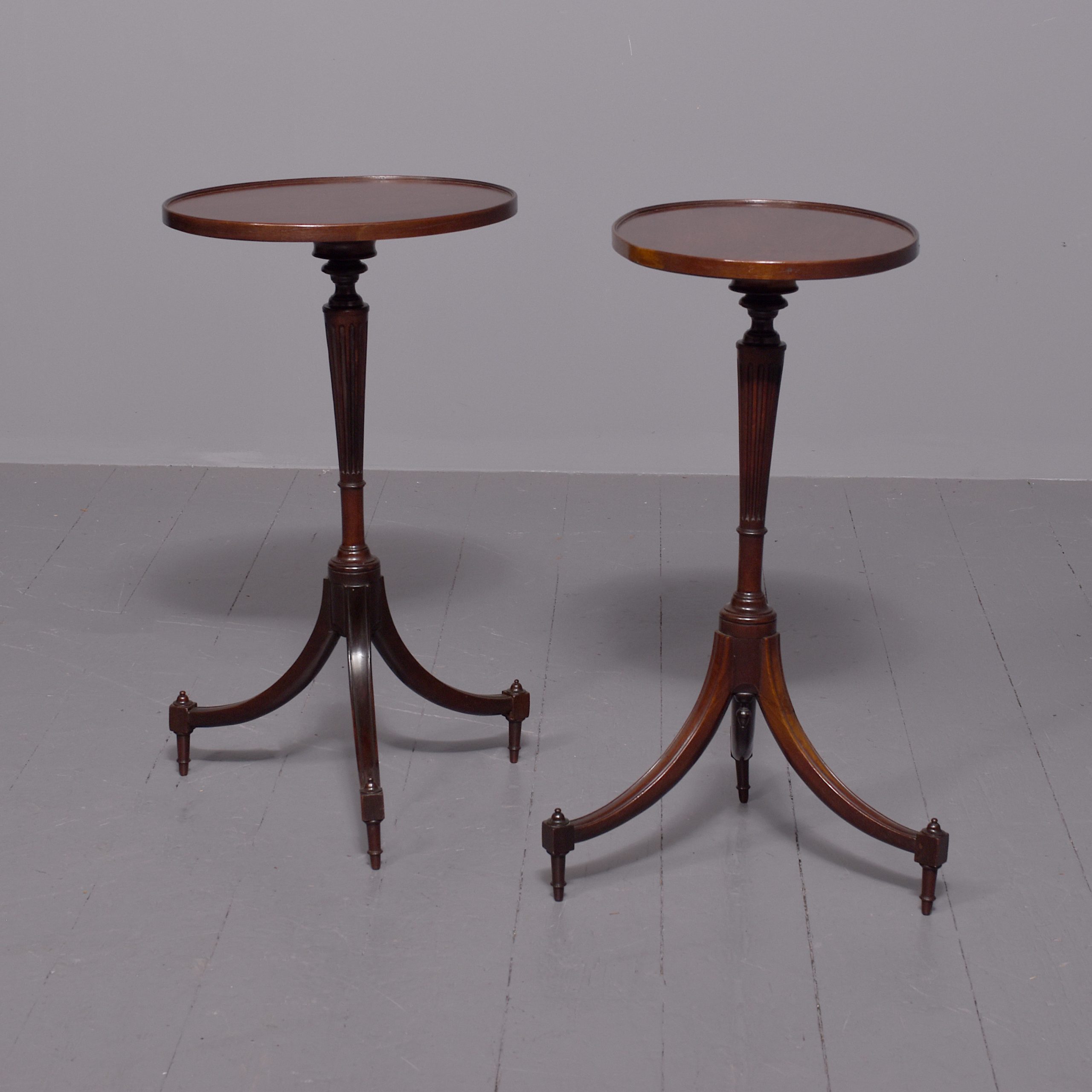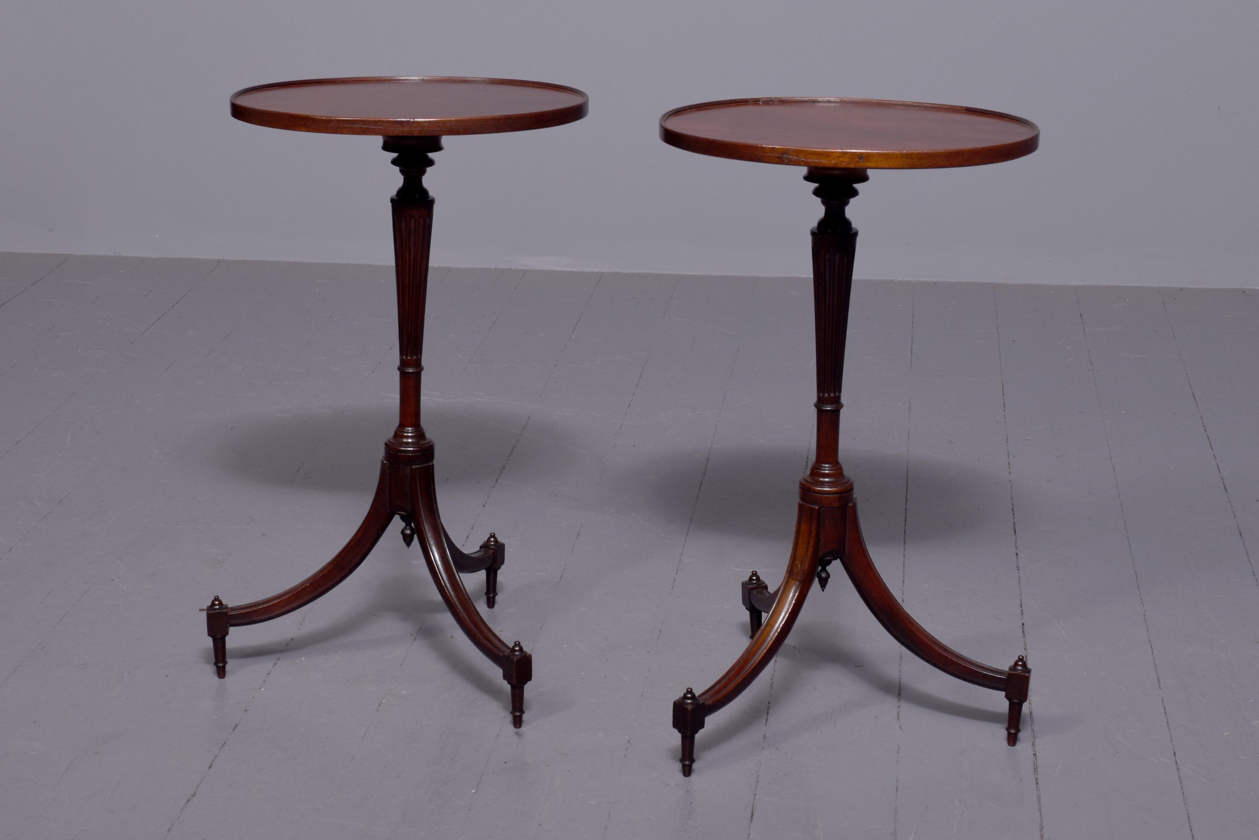 Circa 1820, with adaptations. Rare pair of Regency mahogany wine tables. The oval tops with a deep rich colour and patina and with banded edges supported on tapering fluted column over three fluted splayed legs on neat turned feet.
