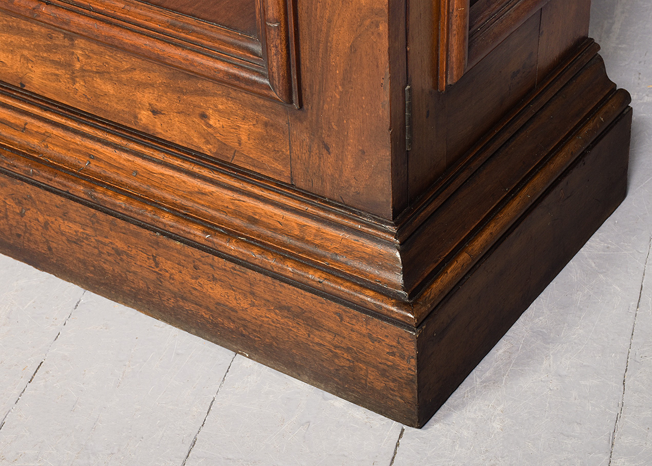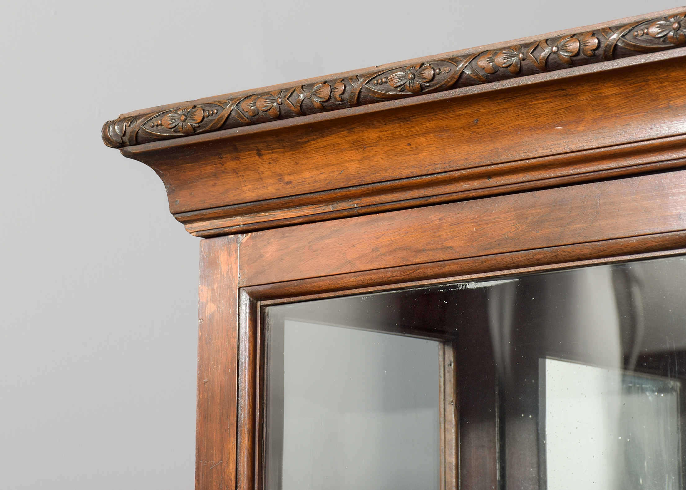 Circa 1870. Rare pair of tall Neo-Classical style display walnut cases. Surmounted by a moulded cornice with neo-classical foliate decoration, the single doors with brass drop handles and brass escutcheons, moulded astragal glazing bars and central roundels open to glazed shelved interiors. The glazed sides with matching astragal bars. The attached bases with deep moulding above single doors with mirror-matched figured walnut panels, brass handles and escutcheons opening to shelved interiors, all sitting on moulded enclosed plinth bases.