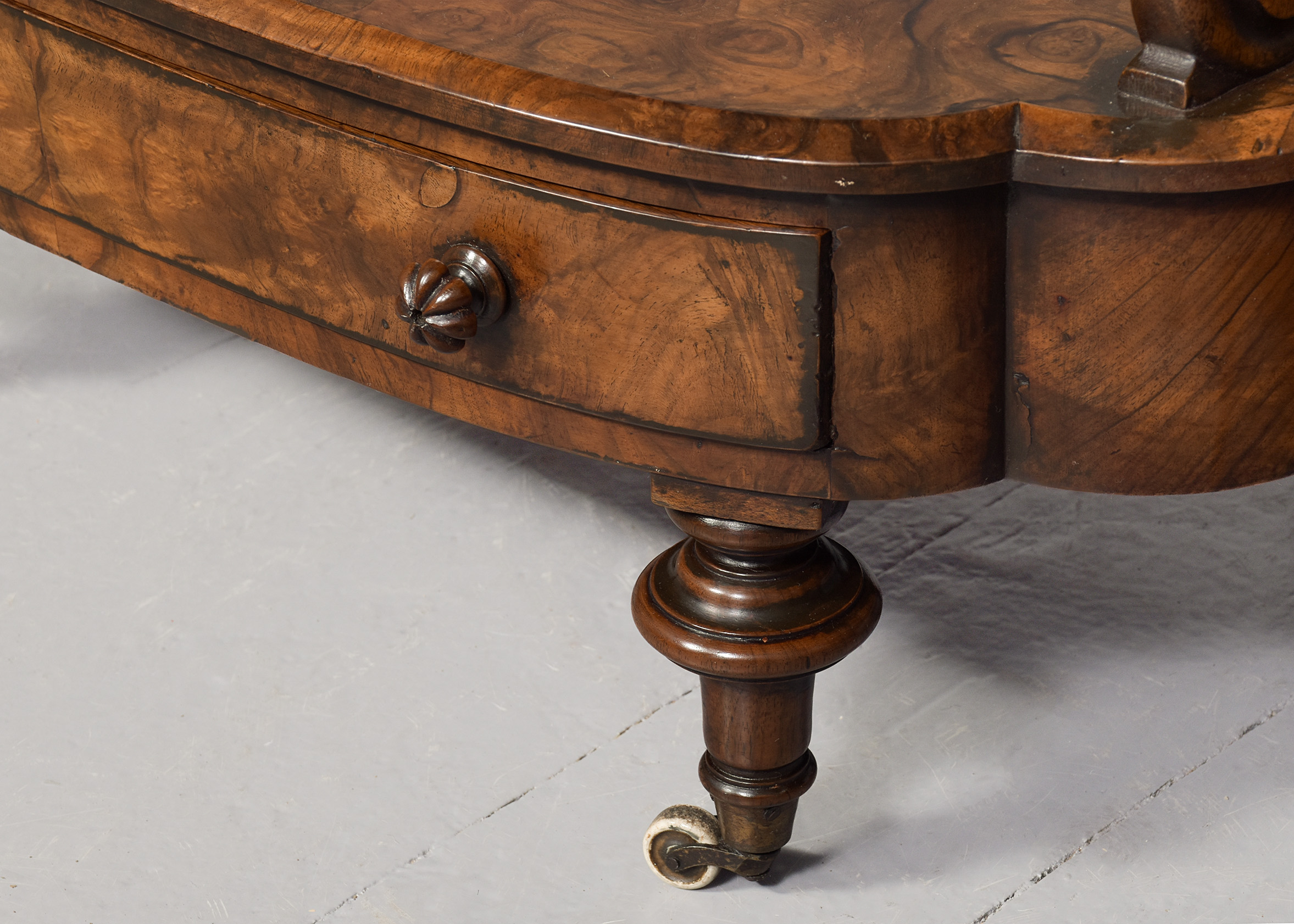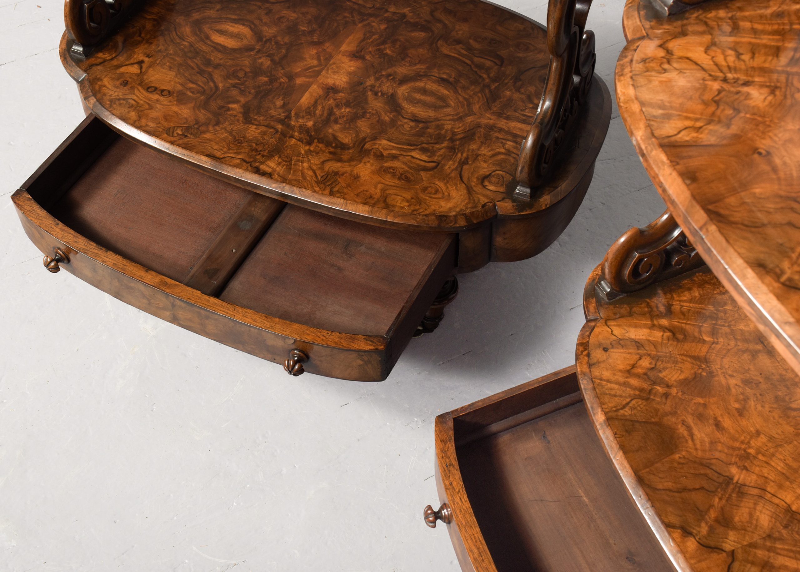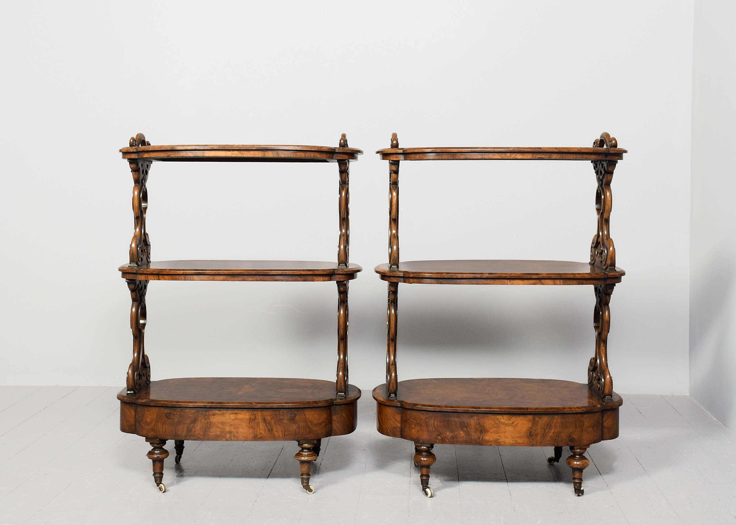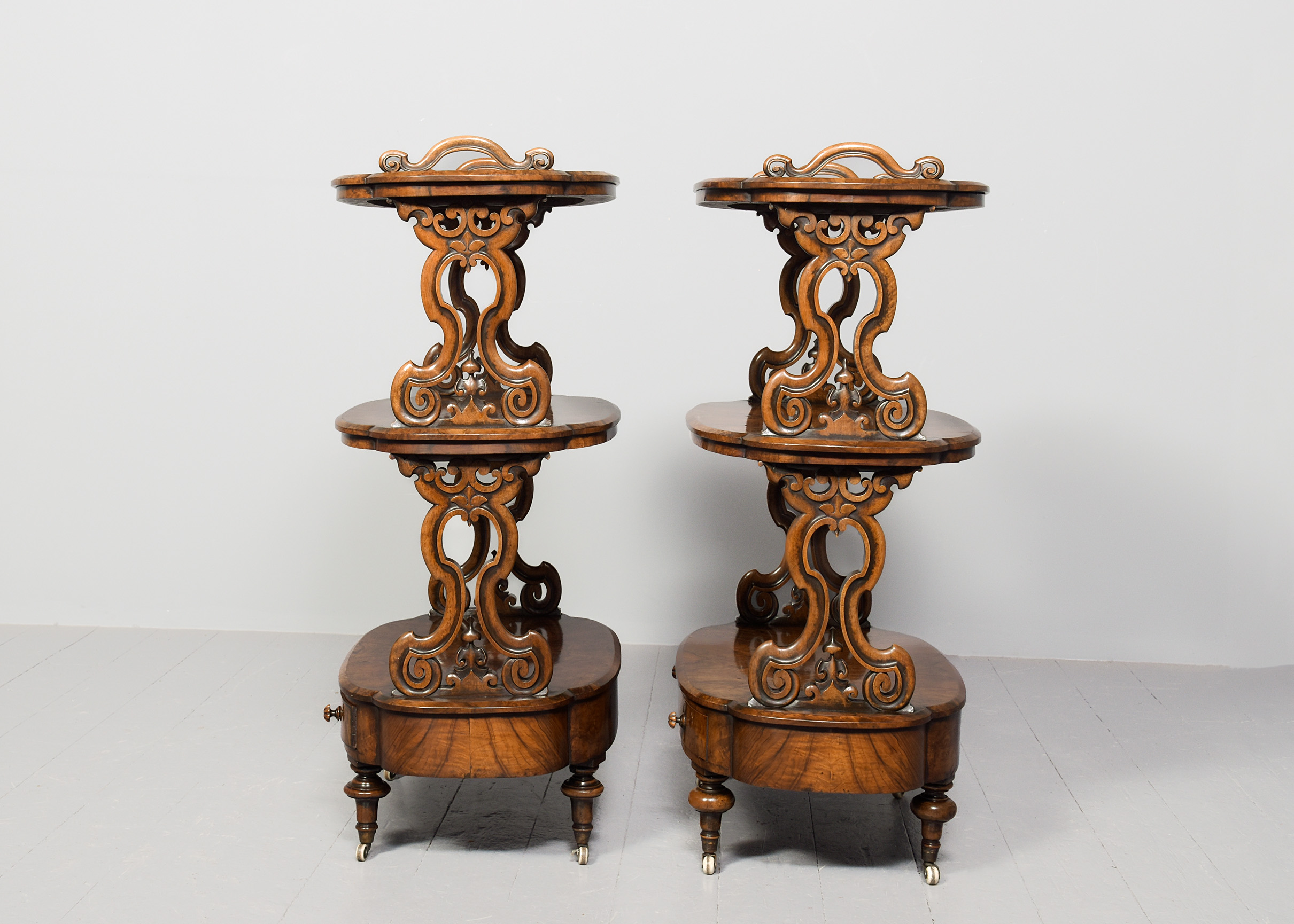 Circa 1860. An unusual and stylish rare pair of Victorian burr walnut three tier whatnots, the shaped tops in finest quarter matching bur walnut with carved lifting handles to each end, the tops with chamfered fore-edges and a simple frieze with two tiers beneath, each supported on pierced and carved uprights, beneath the bottom shelf there is a shaped full-length bow fronted drawer with fluted carved knob handles, the frieze is polished on all sides, making them freestanding, resting on four elegant bulbous turned feet finishing on brass cups and original white castors beneath.