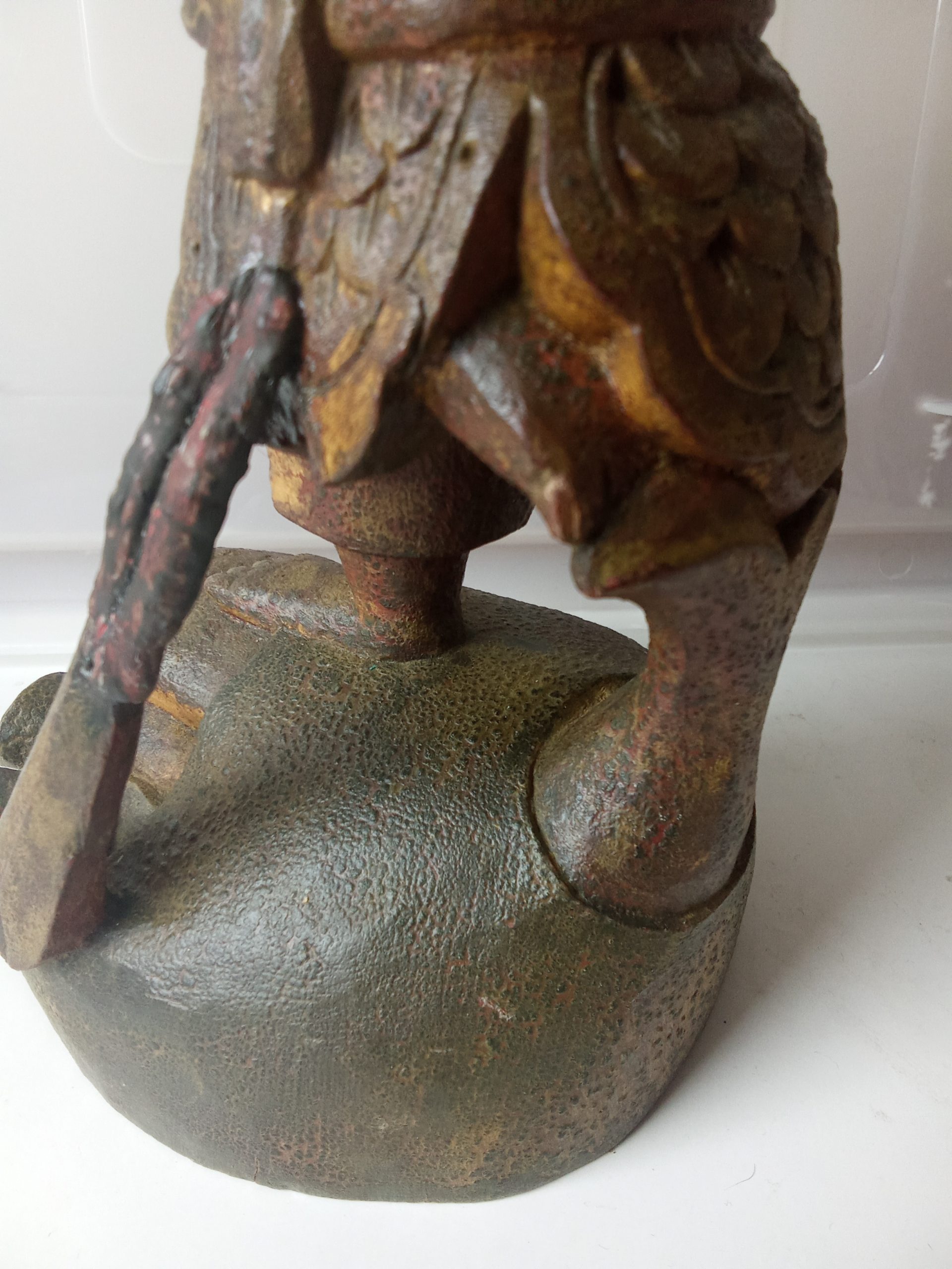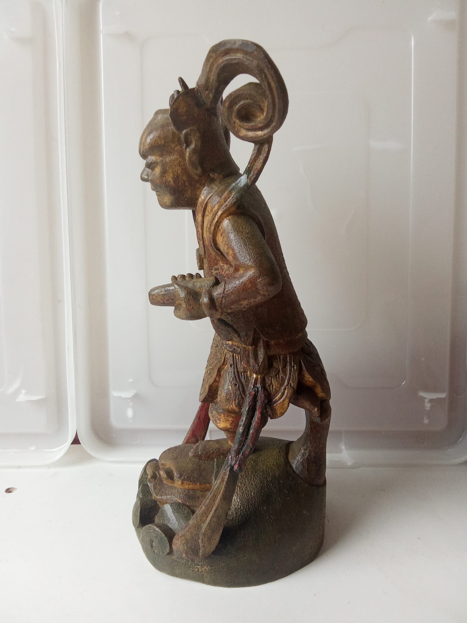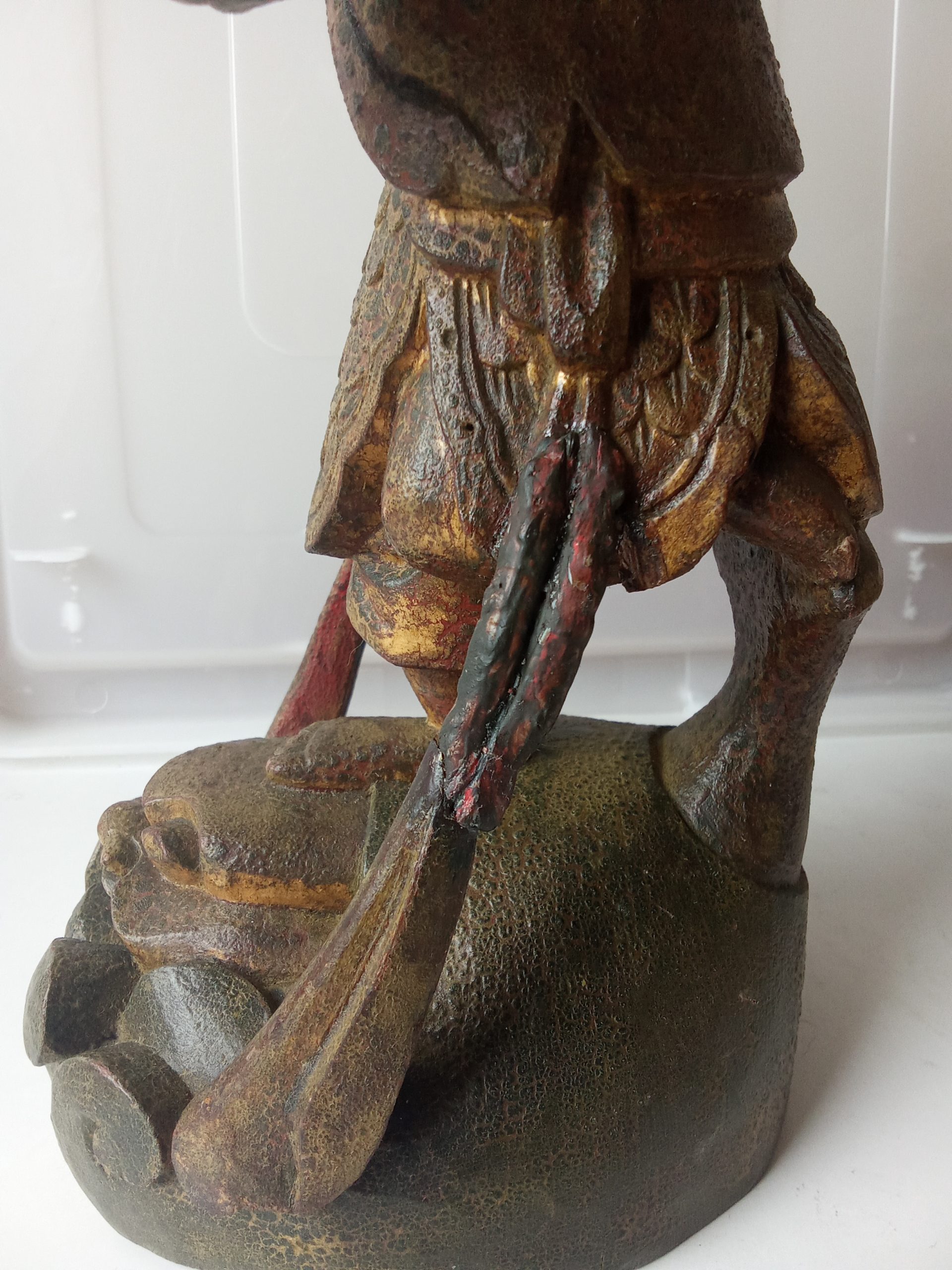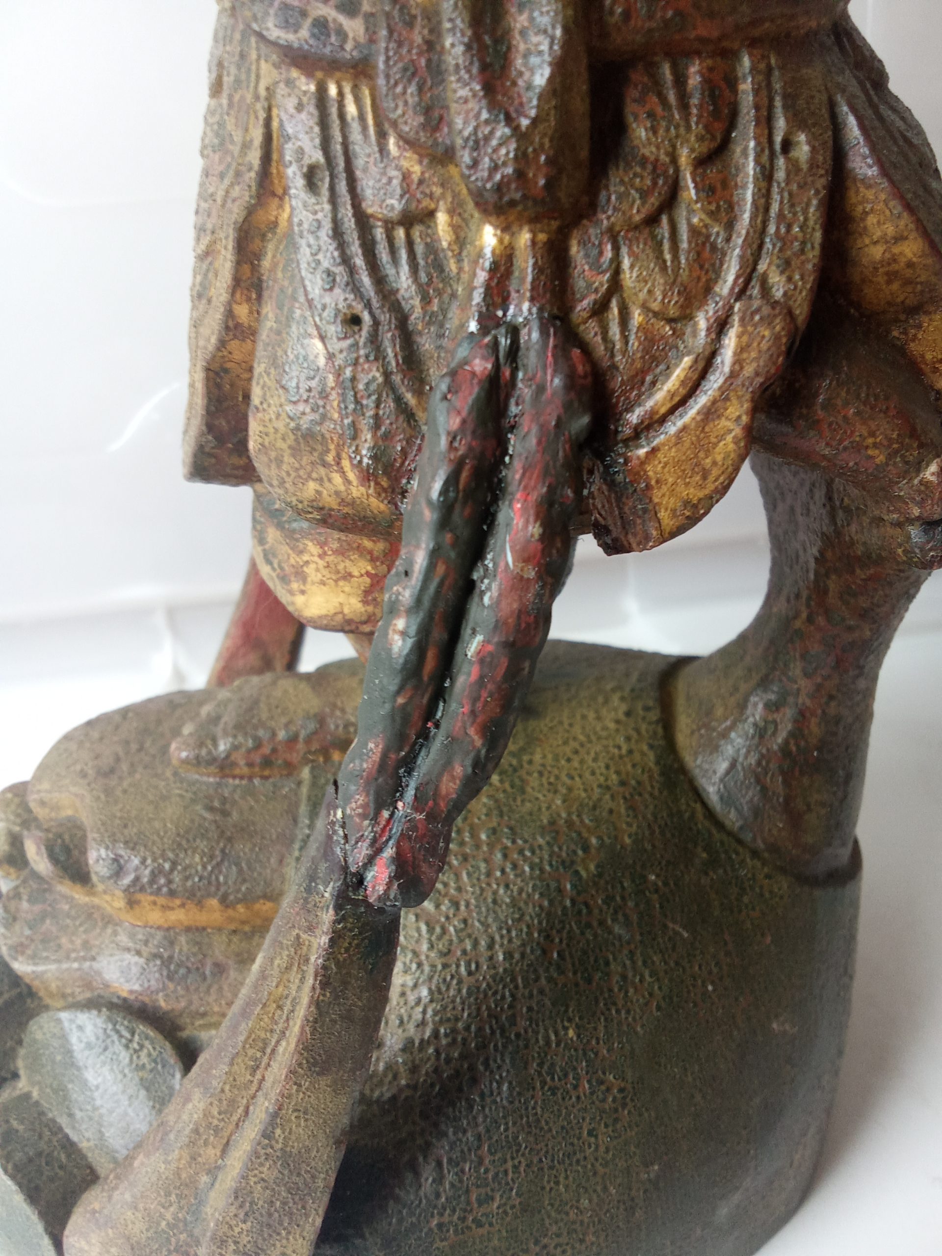 There are remnants of gilding (gilt or gold paint) and red lacquer – this statuette would have looked glorious when it was first made. Please keep in mind that it is around 200 years old so it would be expected to have had some wear & tear.