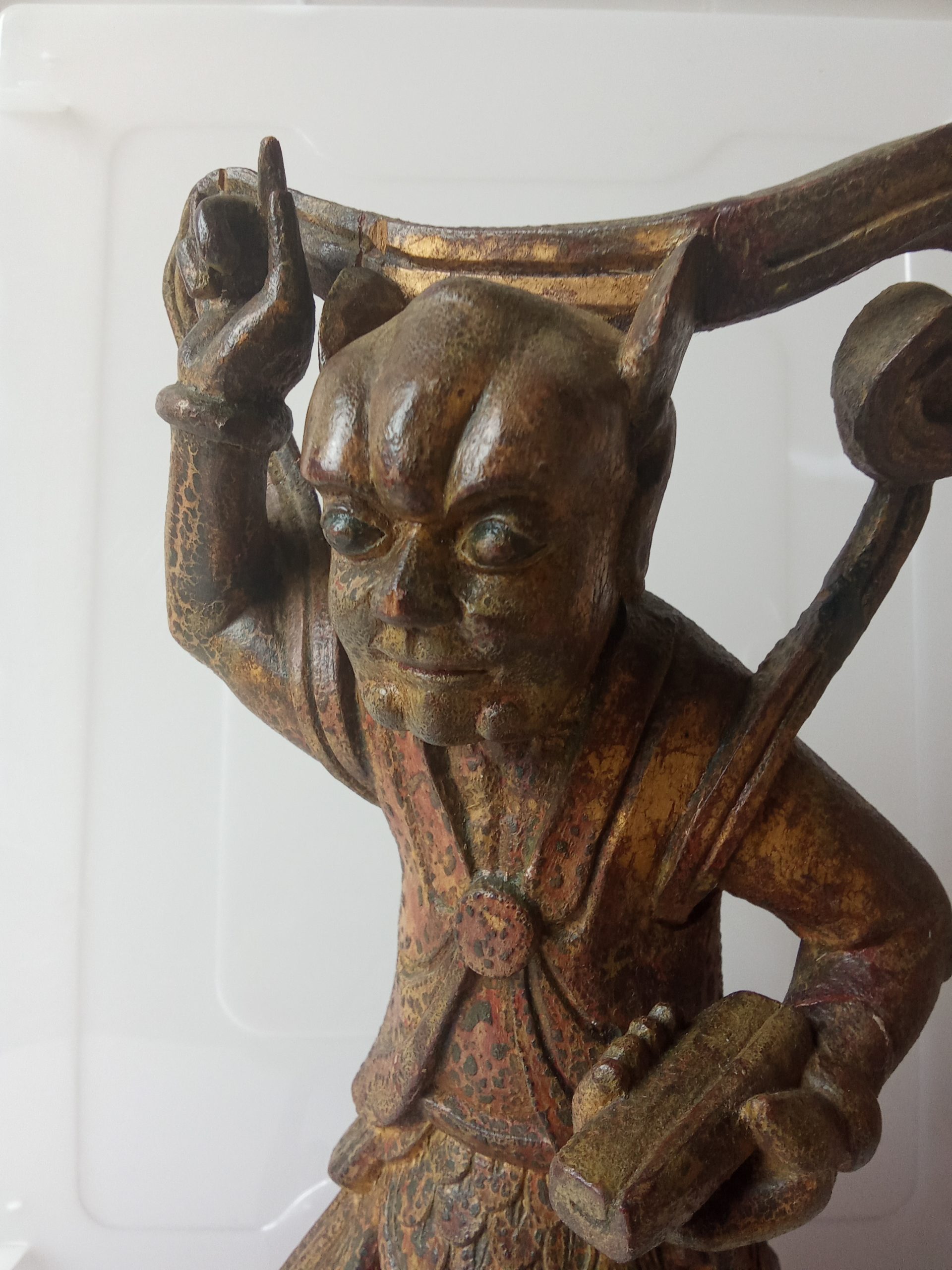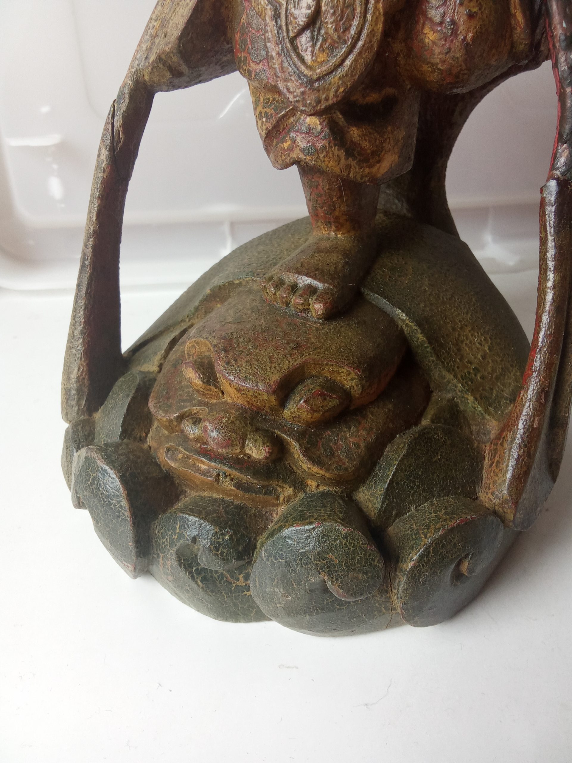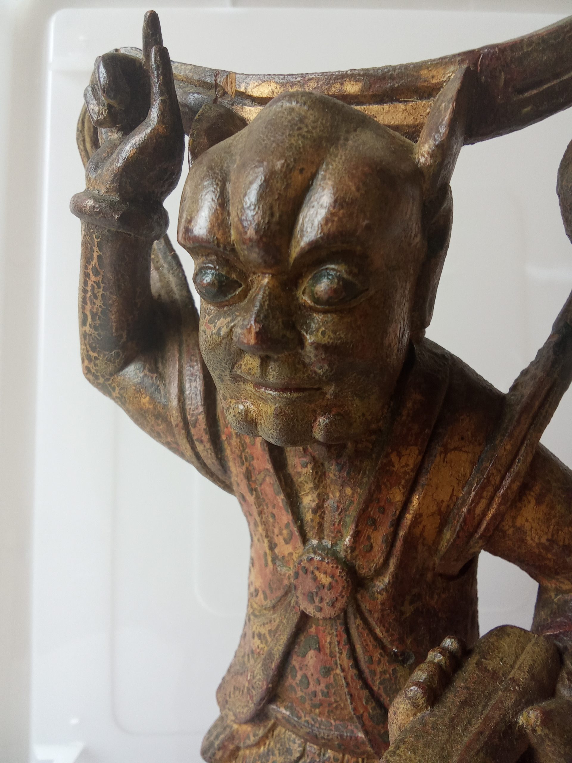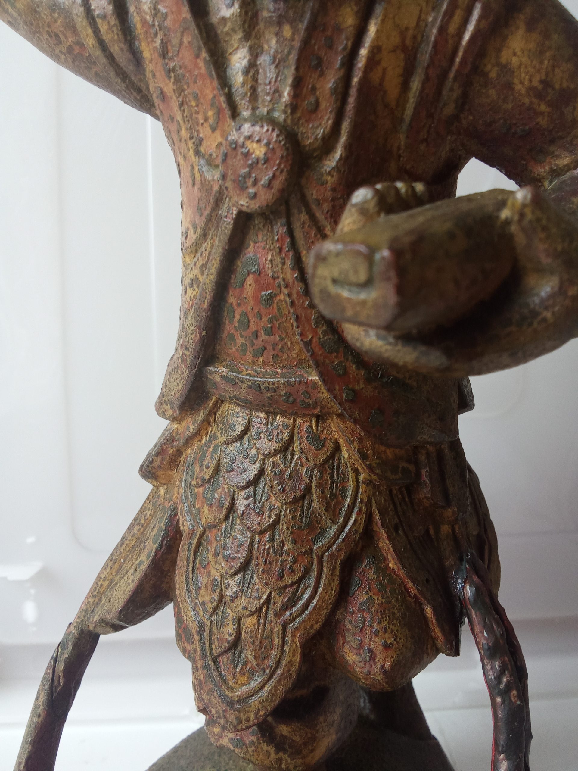 There are remnants of gilding (gilt or gold paint) and red lacquer – this statuette would have looked glorious when it was first made. Please keep in mind that it is around 200 years old so it would be expected to have had some wear & tear.