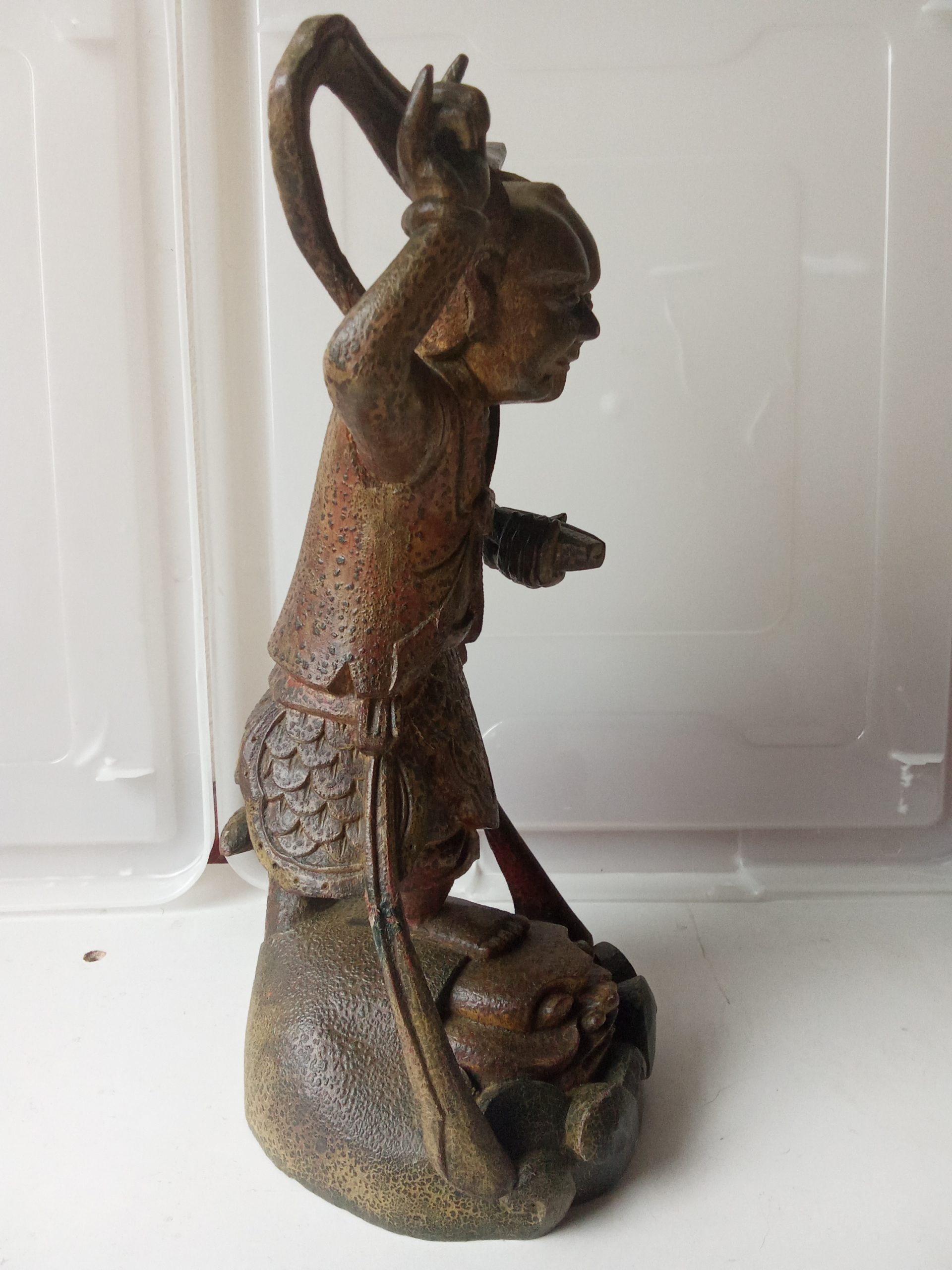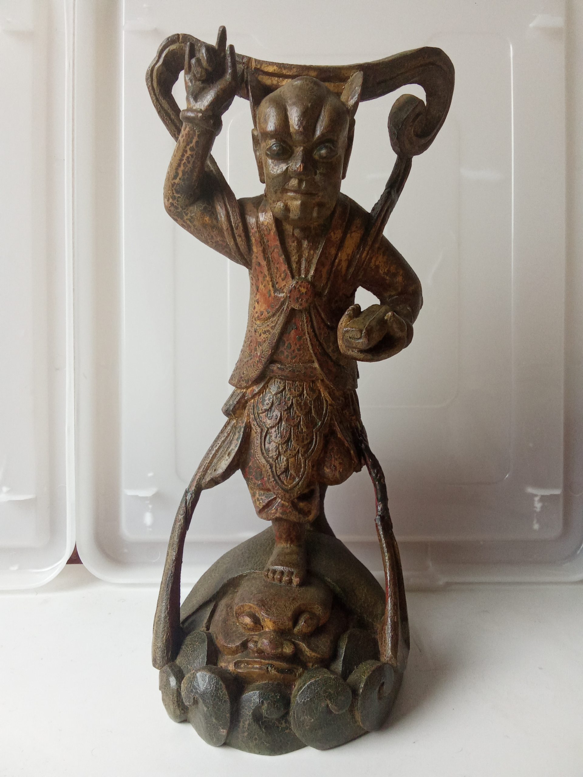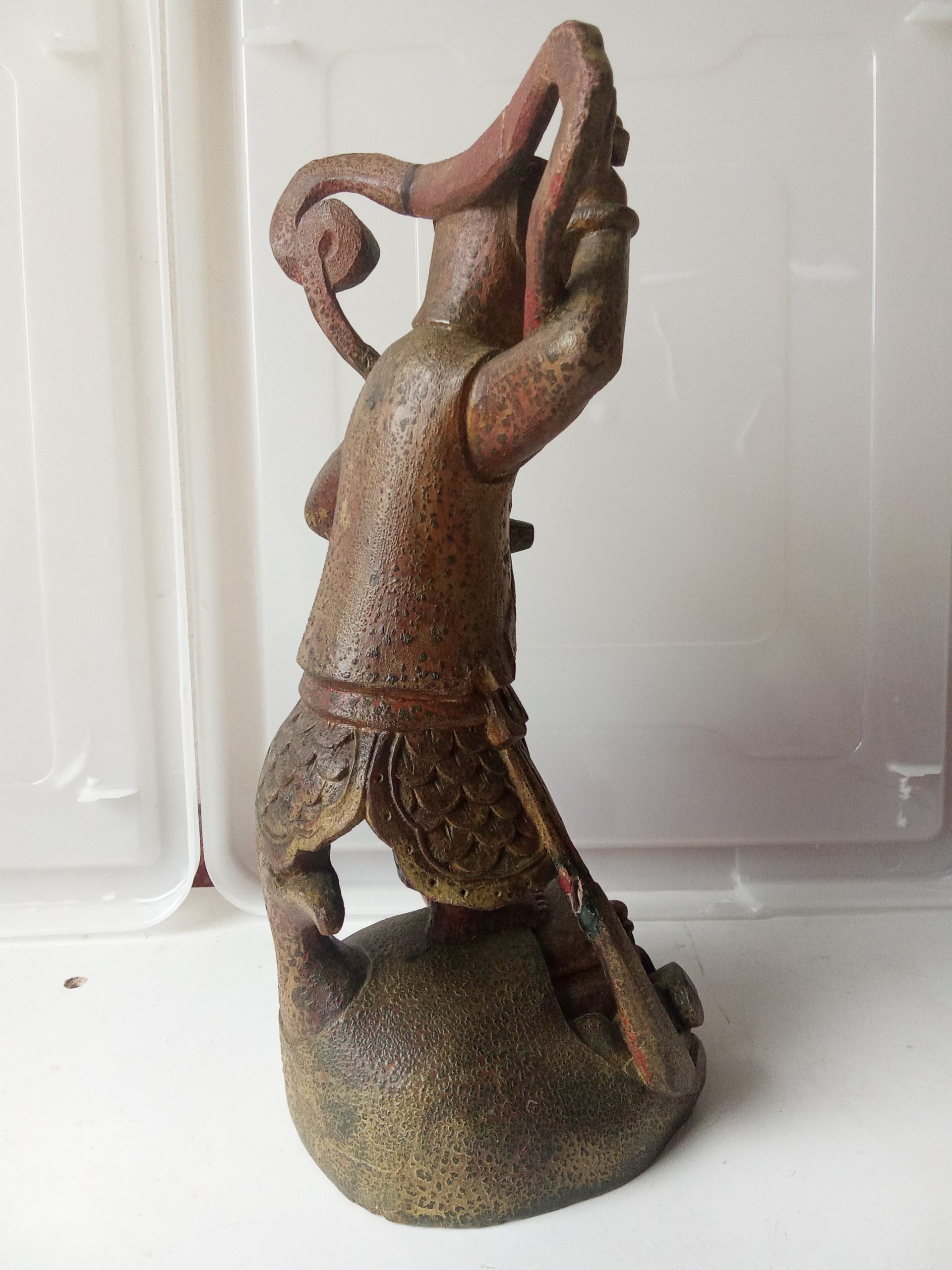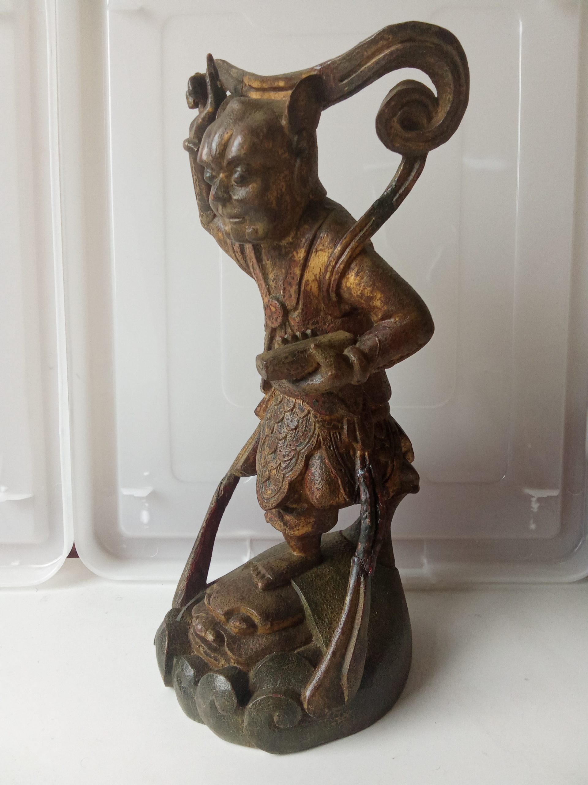 There are remnants of gilding (gilt or gold paint) and red lacquer – this statuette would have looked glorious when it was first made. Please keep in mind that it is around 200 years old so it would be expected to have had some wear & tear.
