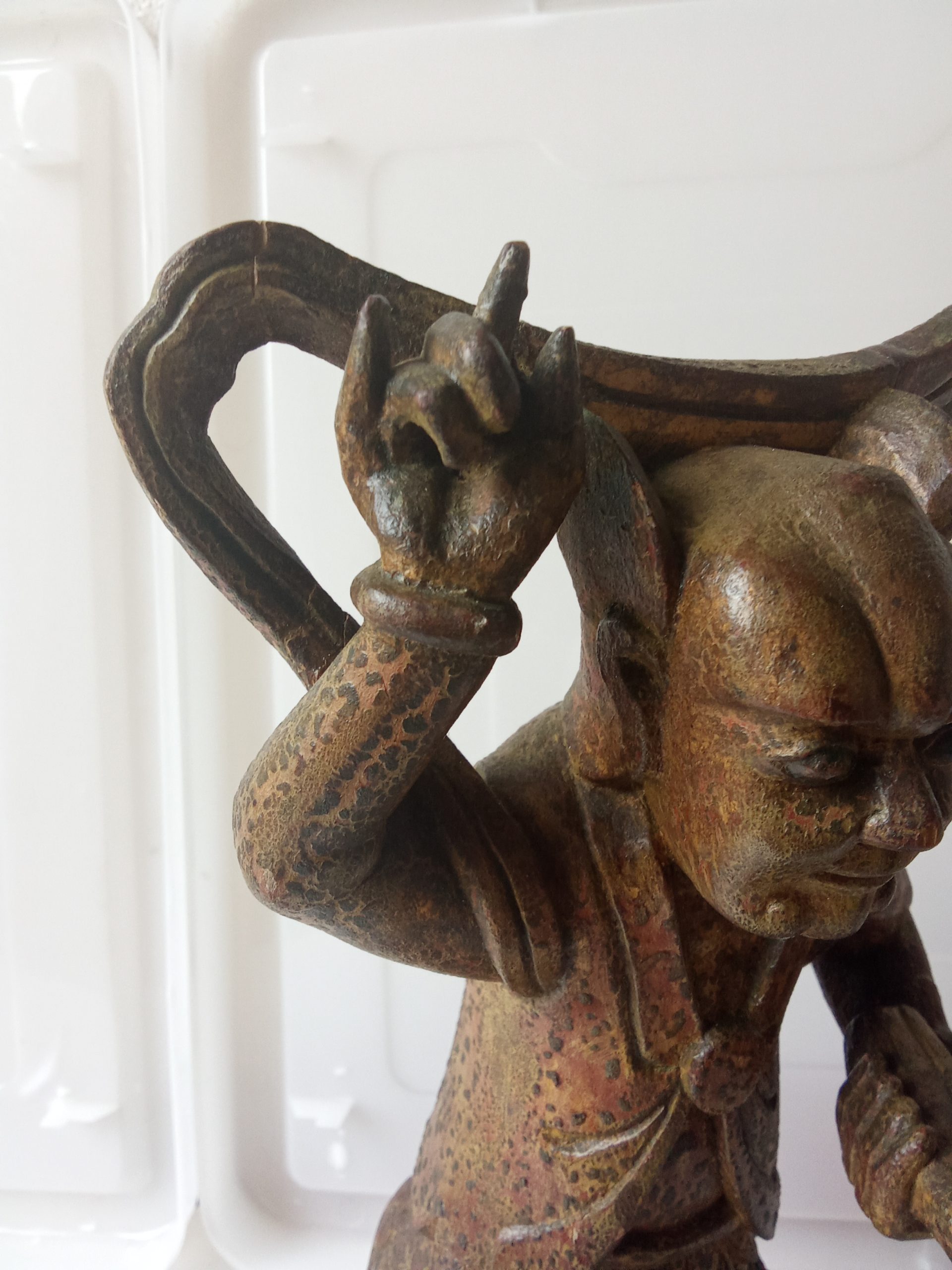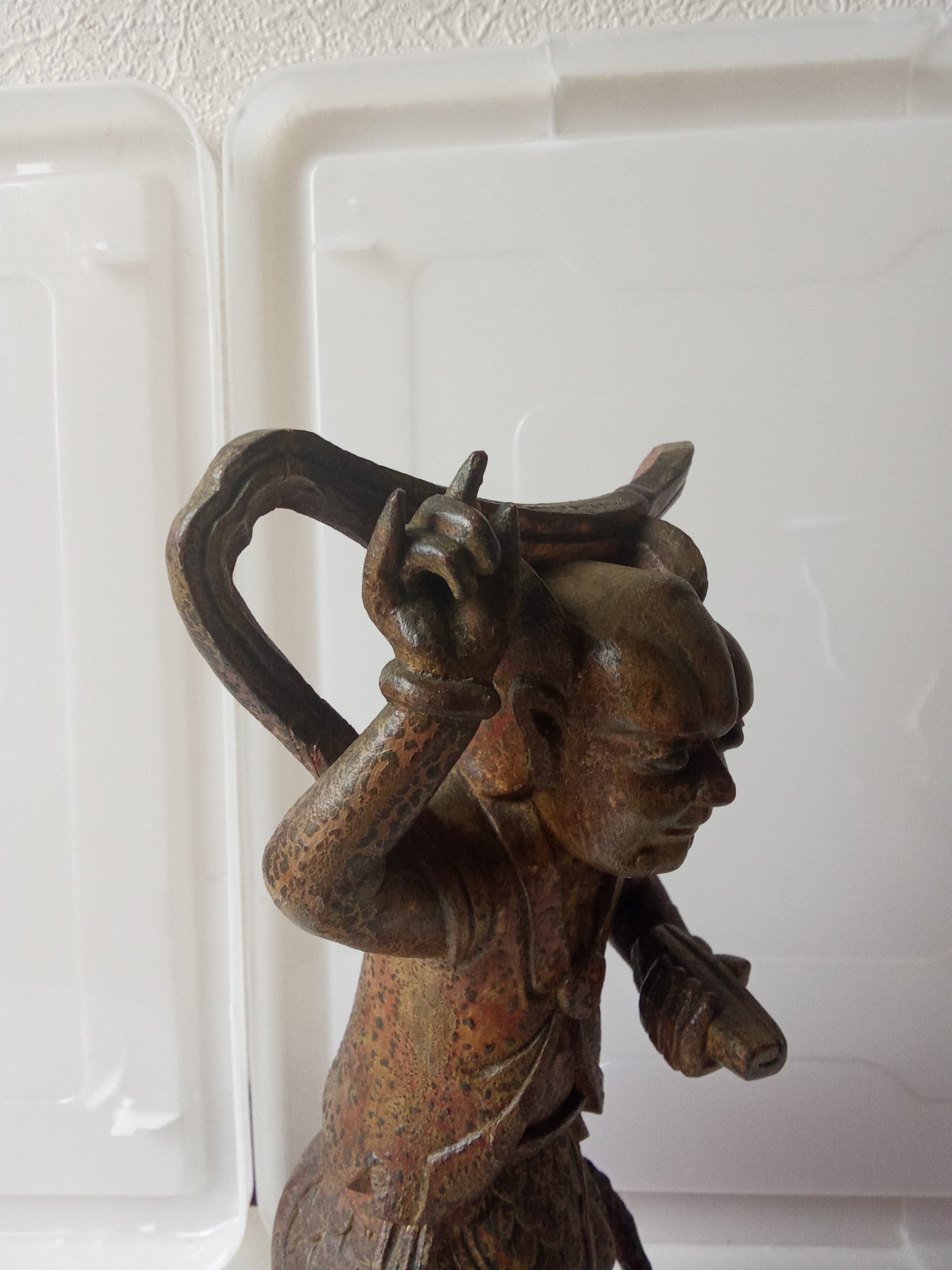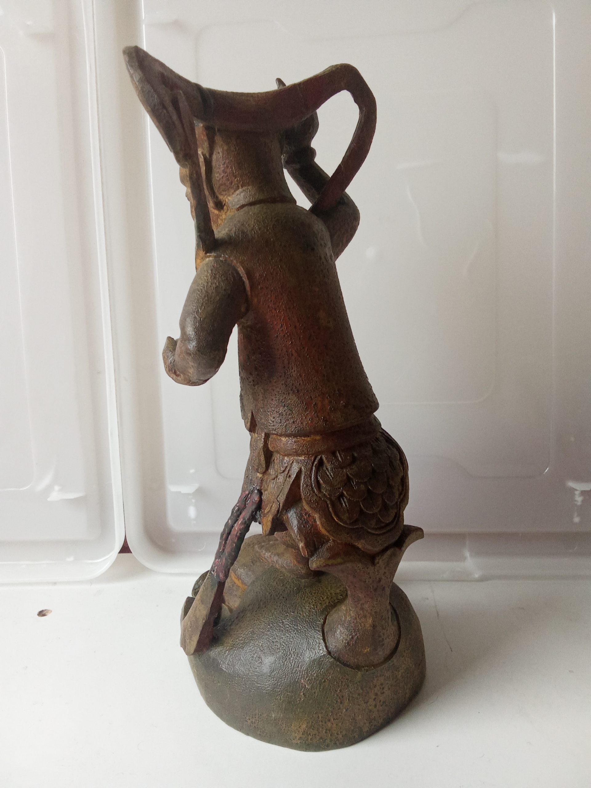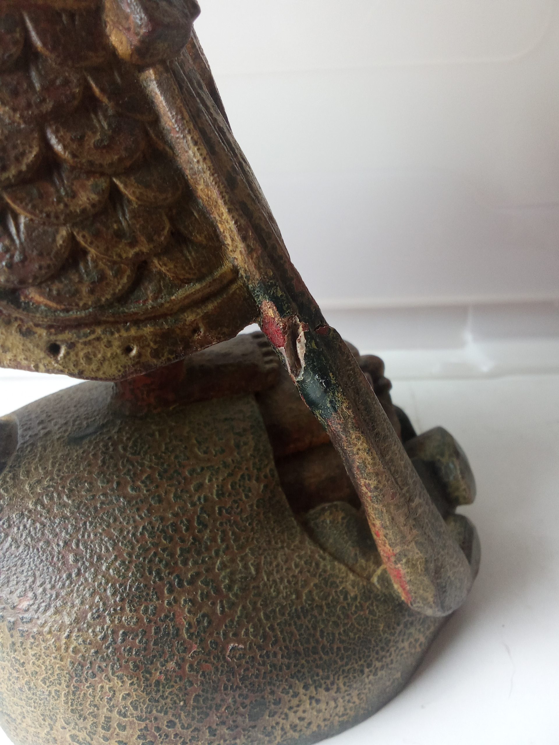 There are remnants of gilding (gilt or gold paint) and red lacquer – this statuette would have looked glorious when it was first made. Please keep in mind that it is around 200 years old so it would be expected to have had some wear & tear.