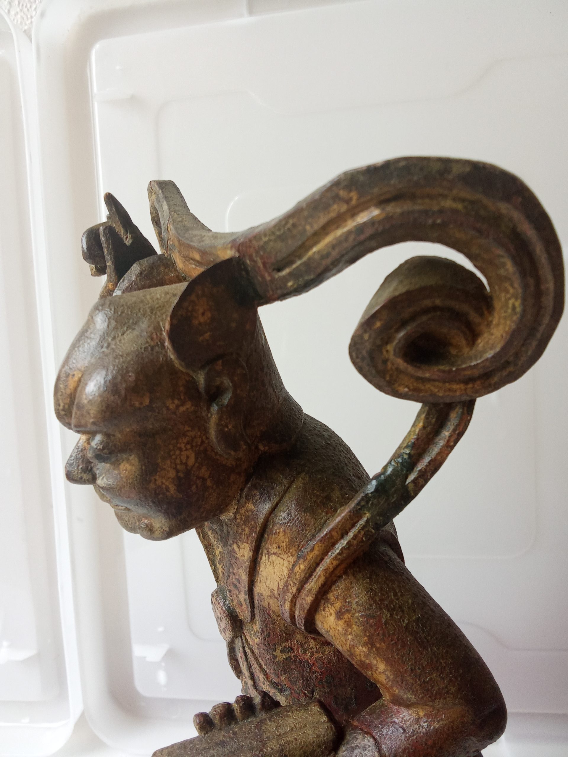 The Temple Guardian is wearing a beautiful tunic with some type of large medallion closing it and below that he is wearing a delightful ‘skirt’ with fish scale style motifs which would have looked amazing when it had its original gold, black and red paint!