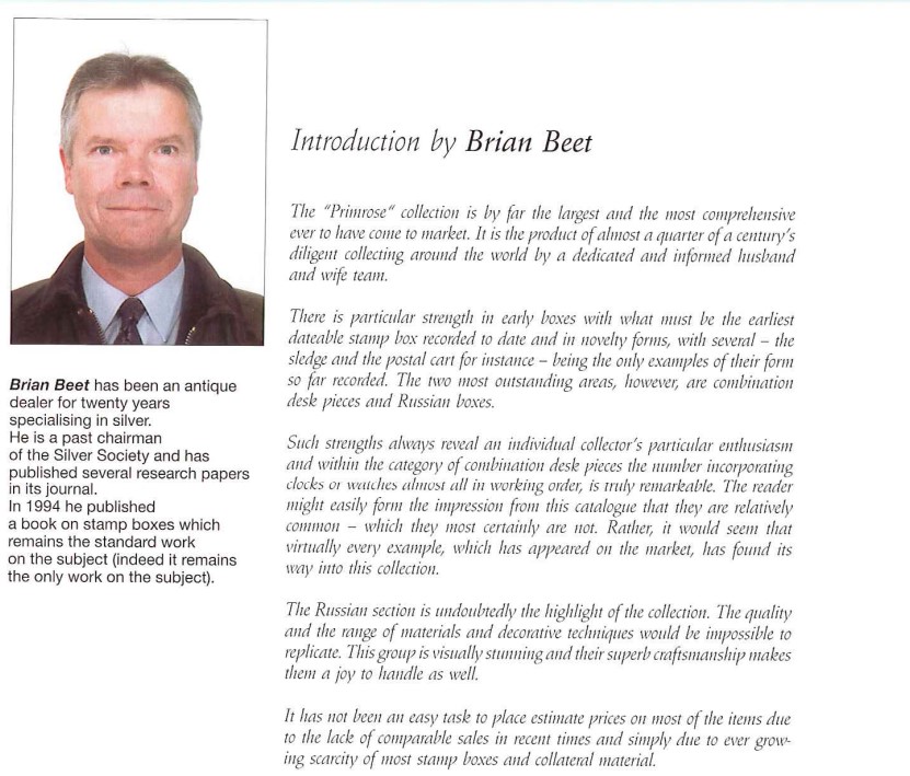 Brian Beet’s key book on the subject is the bilingual (French/English) catalogue, “Les boîtes à timbres / Stamp boxes,” published in 1994 by the Musée de la Poste in Paris, documenting the museum’s collection and serving as the definitive, standard work on stamp boxes. Beet, a renowned specialist and antique dealer, produced this richly illustrated book, making it a crucial reference for collectors of these unique postal artifacts.