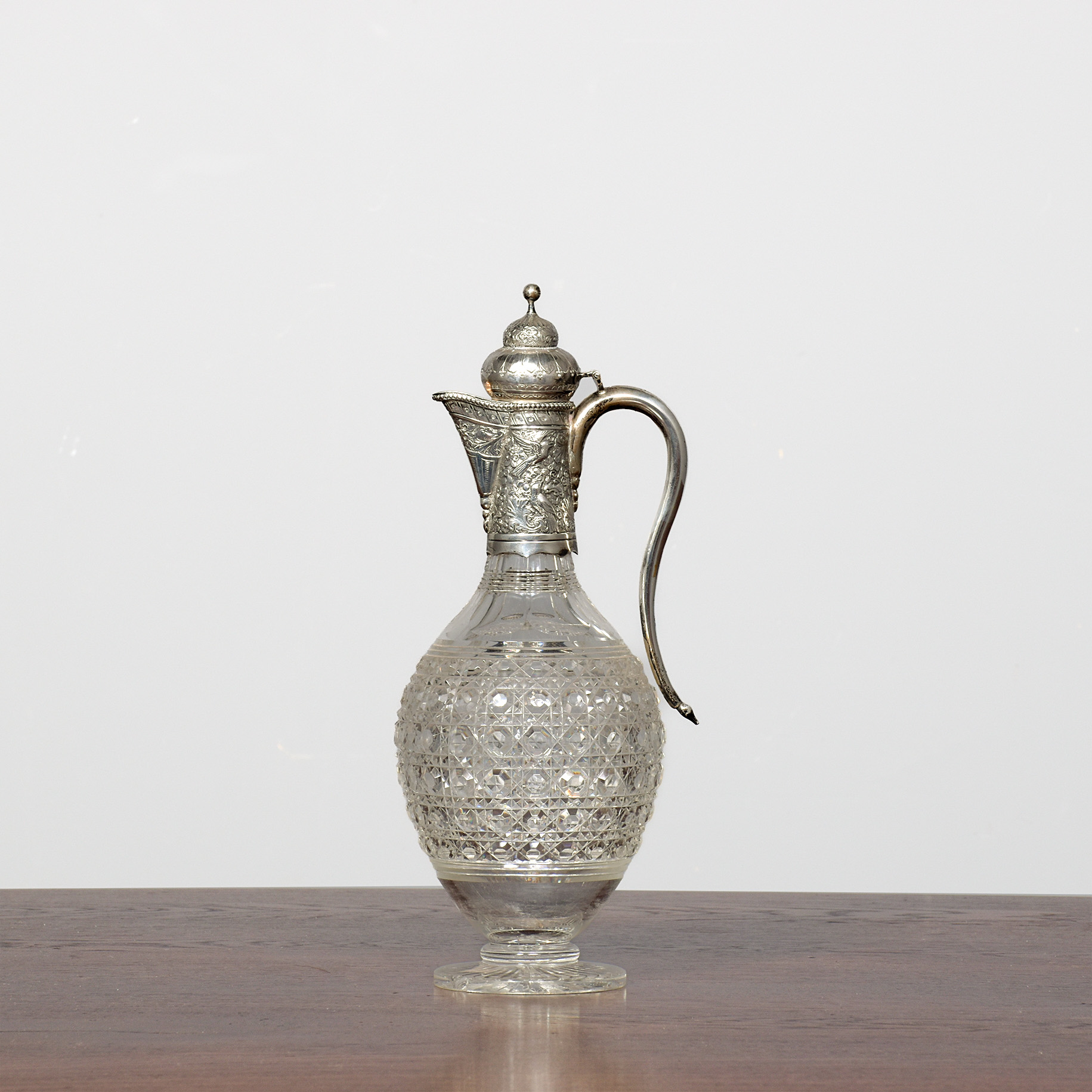 Rare Victorian, hall-marked 1882 silver-mounted cut-crystal claret jug made by Charles Boyton II. The vasiform-shaped hand-cut crystal jug with birds and foliage decorated solid silver mounts, shaped handle and domed lid. Hallmarked London 1882, and stamped by maker Charles Boyton II. Very small chip beneath the base.