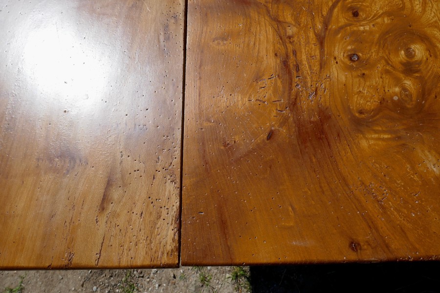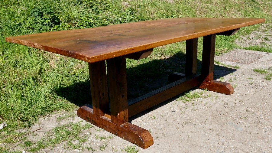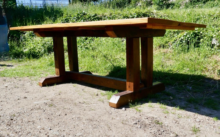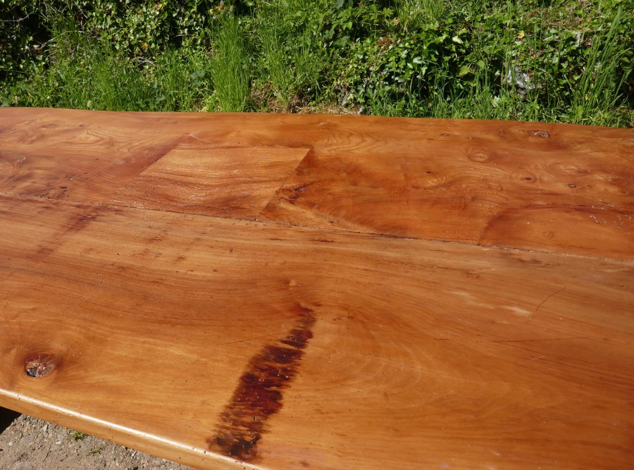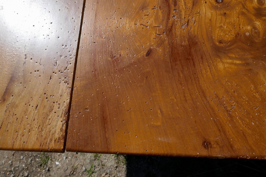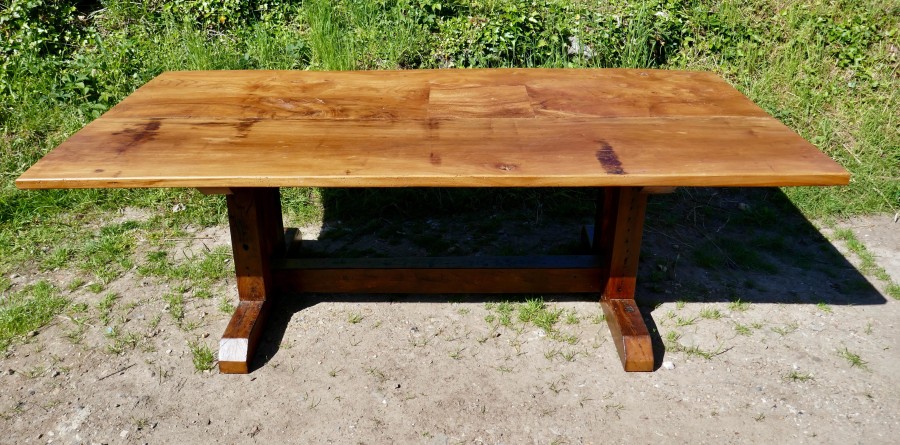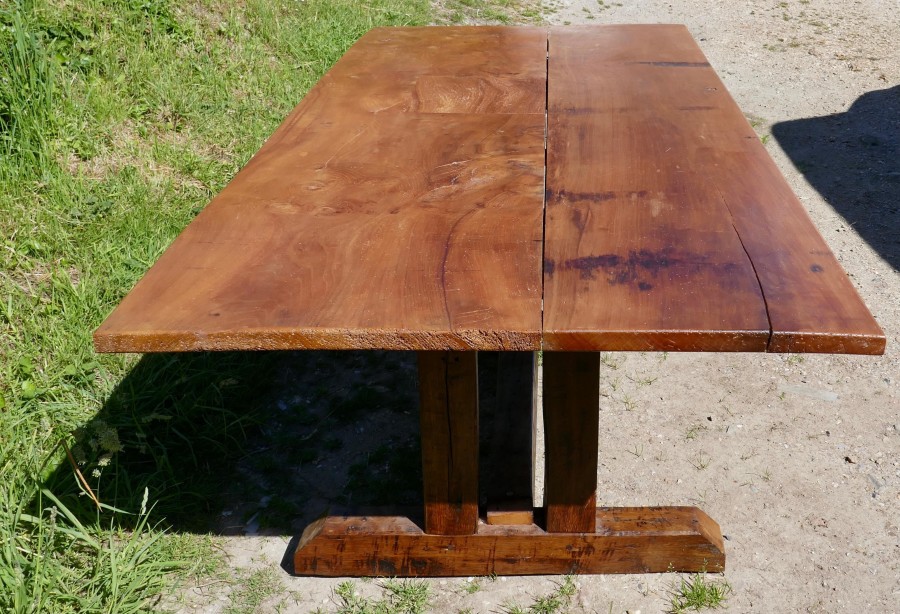 Reclaimed Elm Rustic English Barn Table This is a superb piece, the table top is thick and made from 2 heavy planks of solid Elm, the wood has a rustic appearance with natural gnarling and termite holes, it has a large inset patch on one of the planks. The table has a very sturdy leg formation with double end legs and a full length stretcher, the heavy table legs are also made with reclaimed wood and have iron stains whee the old nails were. The Table has been treated for woodworm. This is a large table and will seat 12 diners, it is 89” long, 41” wide and 30” high. GB687 Manufacture Date : 1920 Materials : Elm