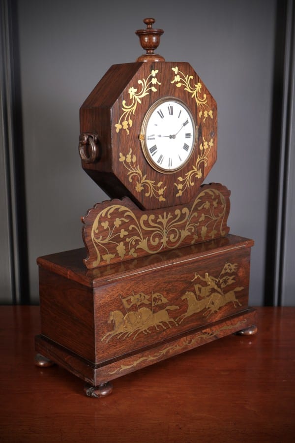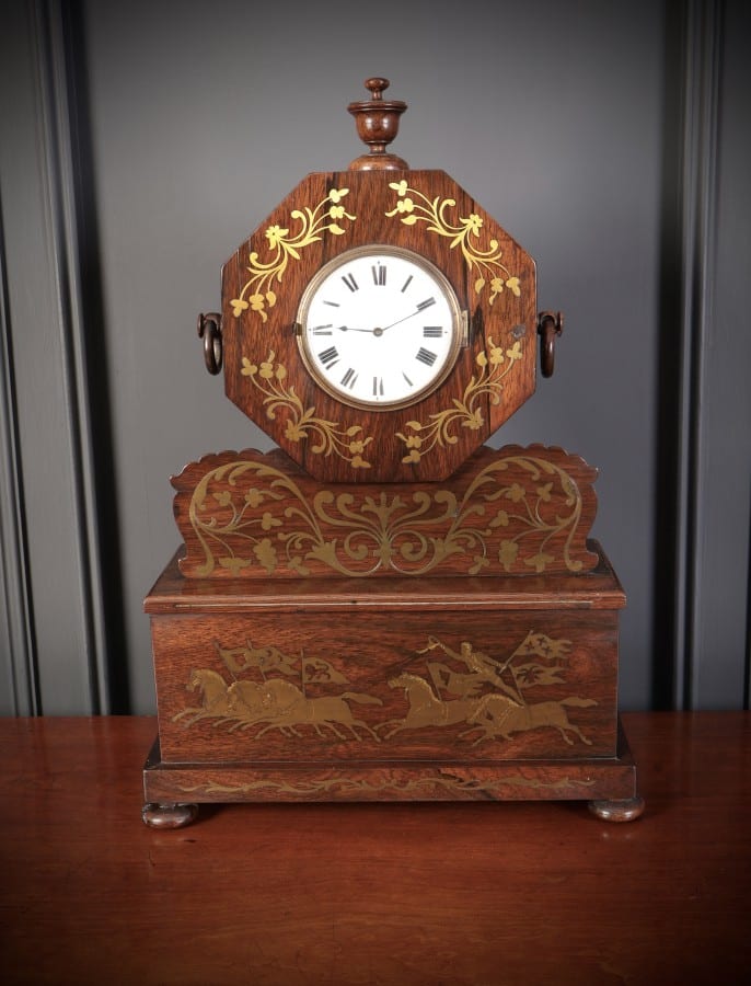 Lovely rosewood case, decorated in beautiful brass inlaid floral patterns and charging horses on the box base.